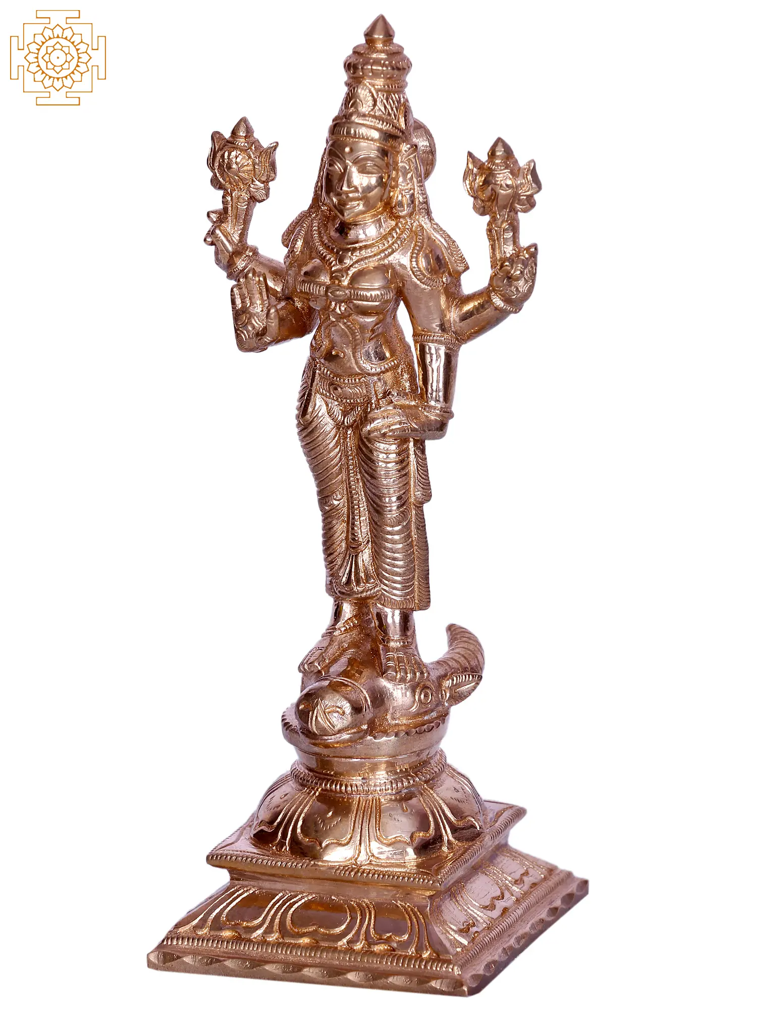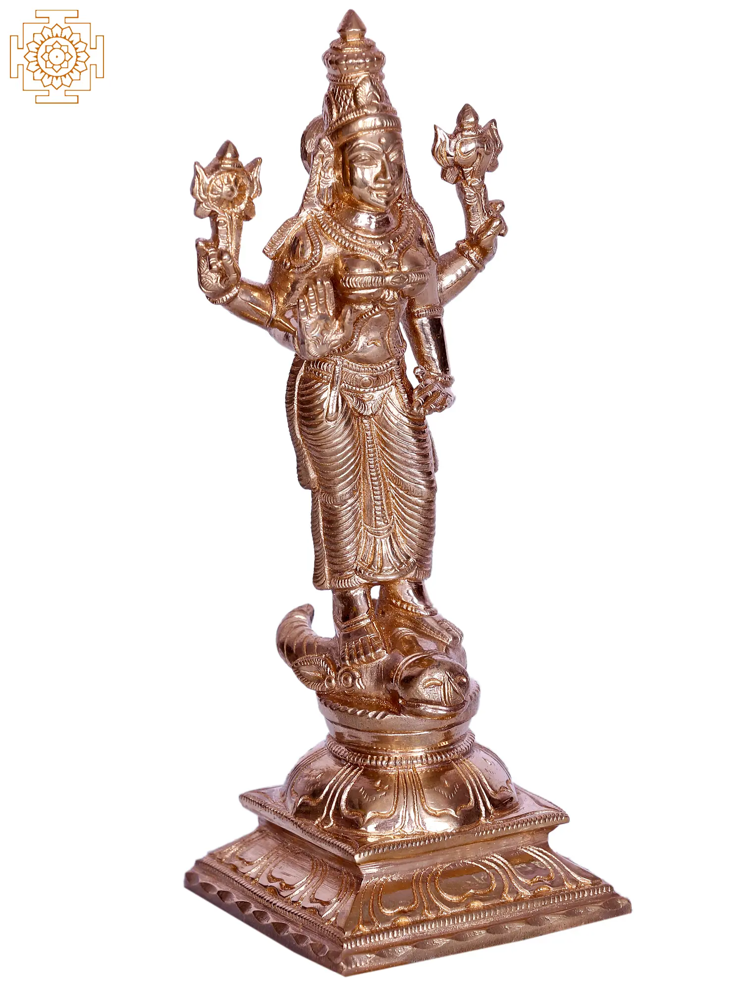The Durga bronze statue captures the valiant and powerful form of the mighty goddess, triumphantly standing upon the defeated Mahishasura. This manifestation, known as Mahishasura-Vijaya Durga, portrays her with a Chakra (discus) and a Shankha (conch). With one hand on her waist and the other raised in the Abhaya mudra, the gesture of fearlessness, the goddess exudes an aura of indomitable strength. Crafted with intricate detail, this bronze masterpiece not only symbolizes the victory of good over evil but also invites worshippers to draw strength and courage from the resolute form of Durga, the divine vanquisher of darkness.