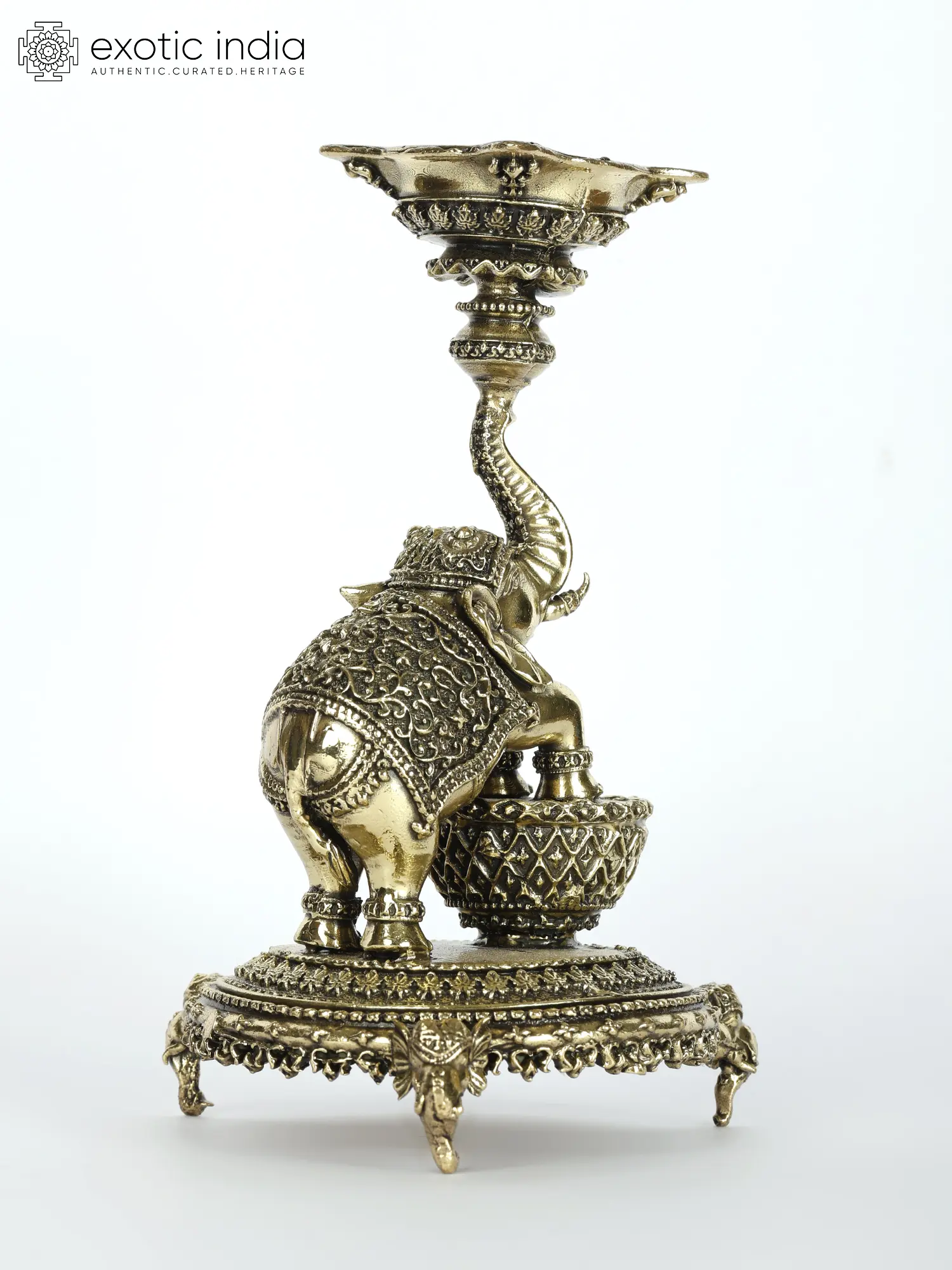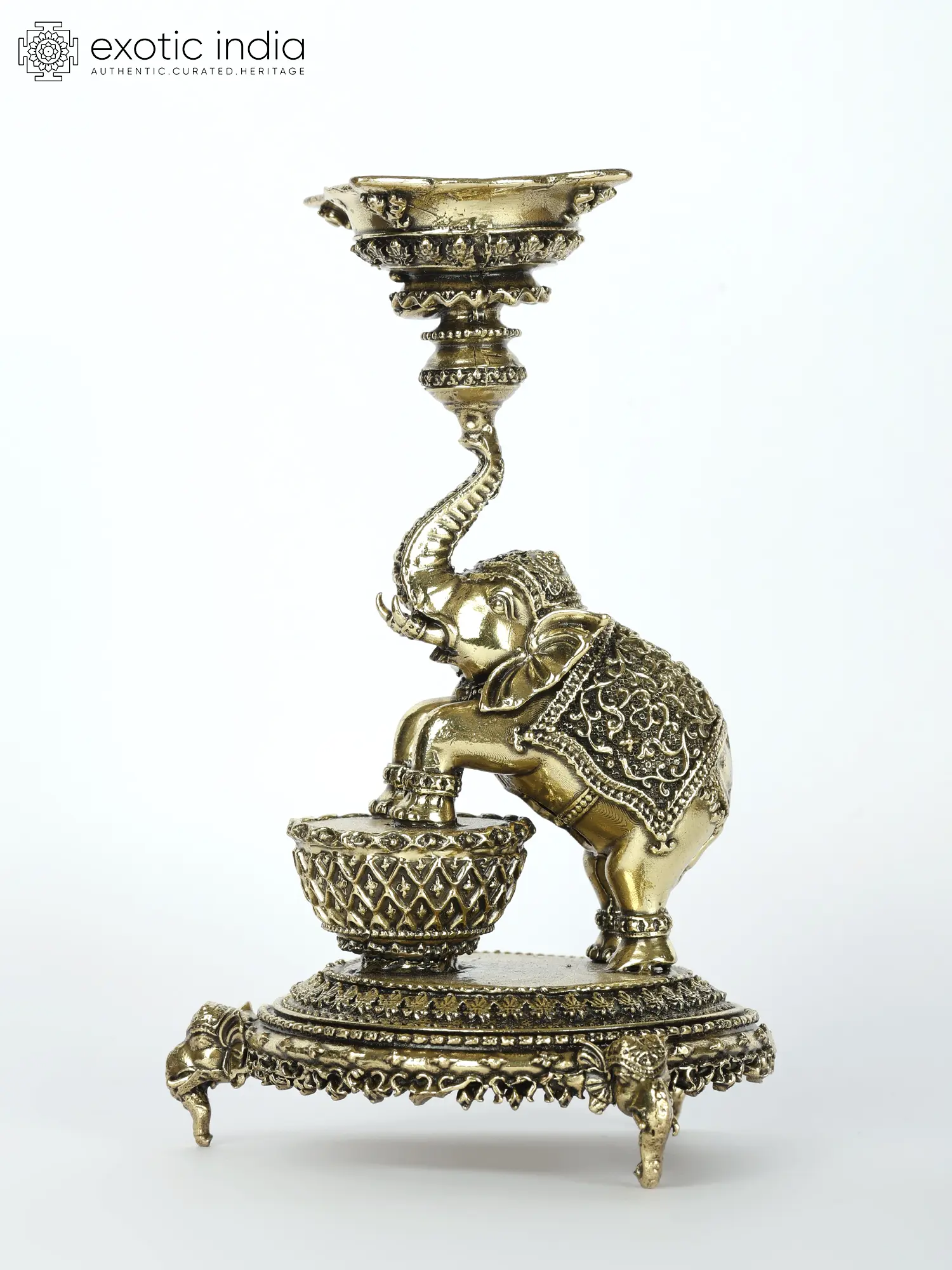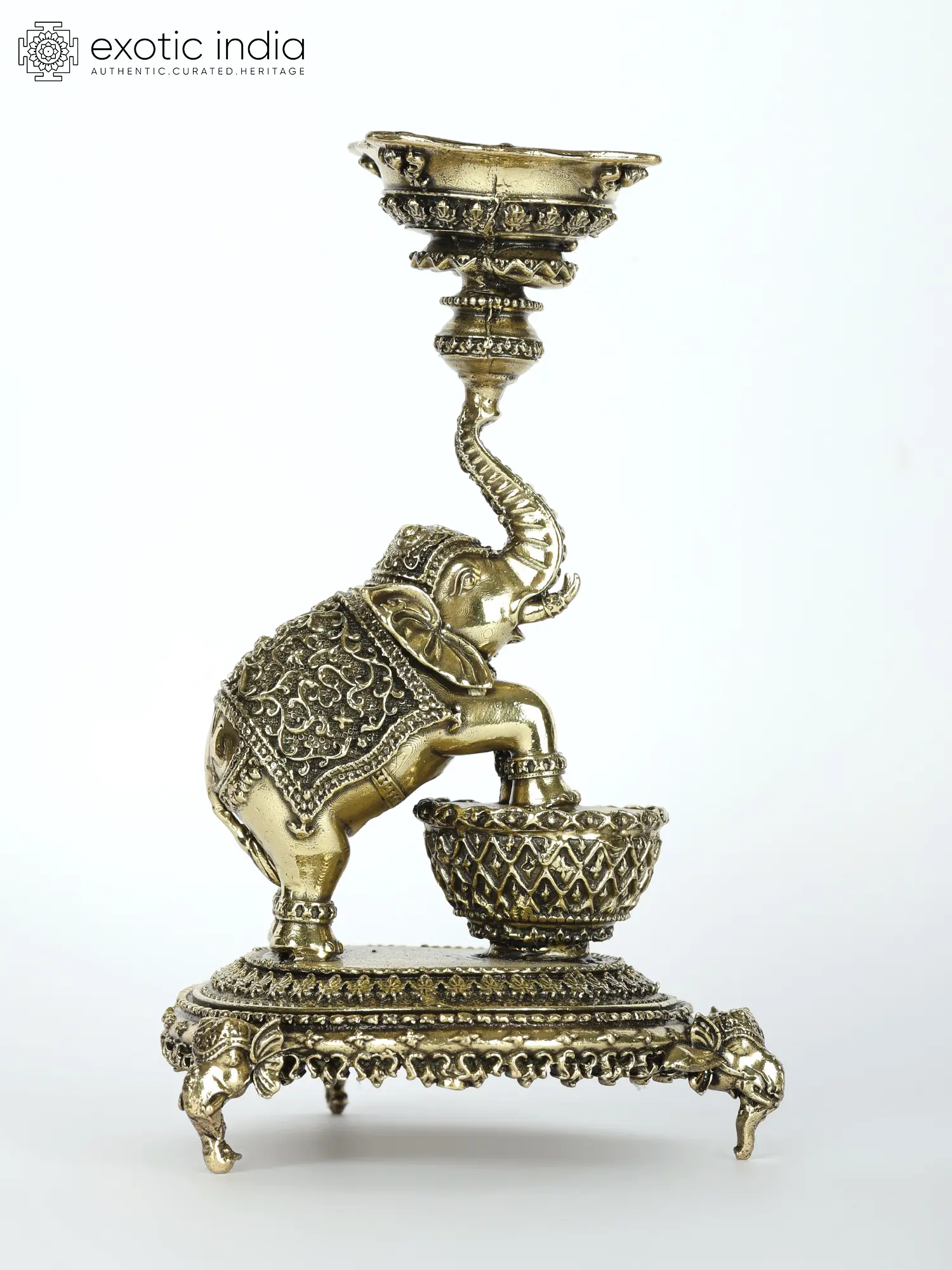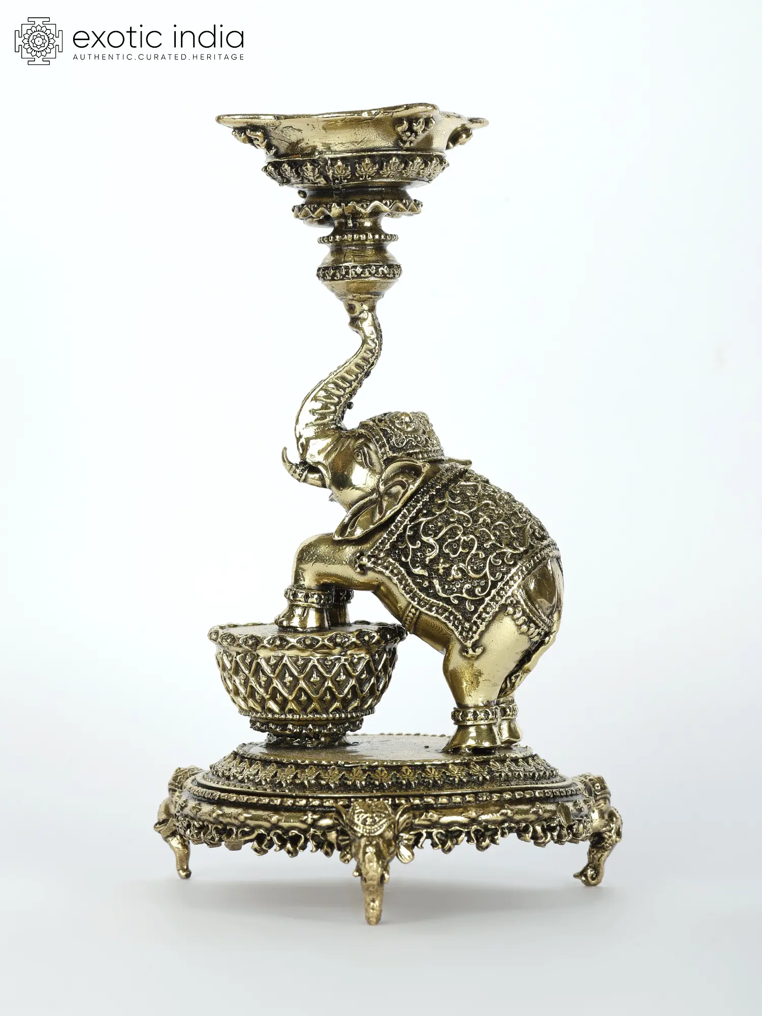 The miniature piece depicts an elephant standing tall, balancing a sacred lamp atop its outstretched trunk.