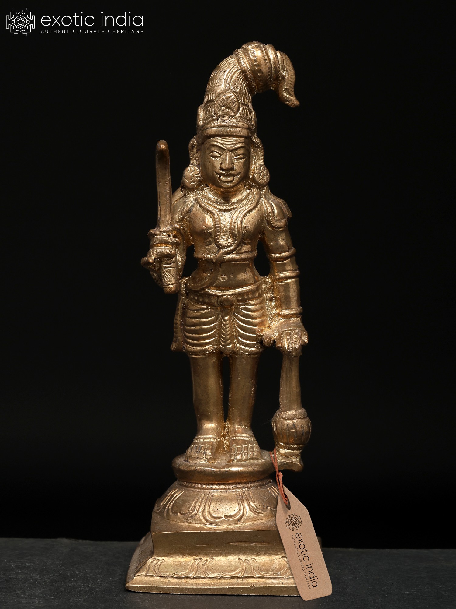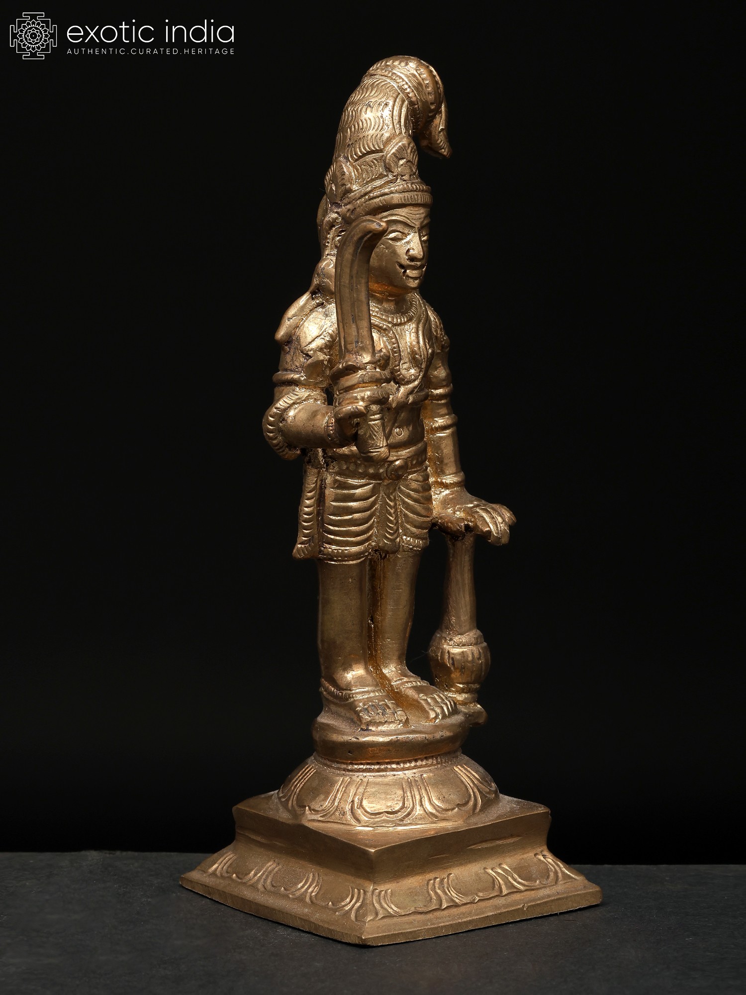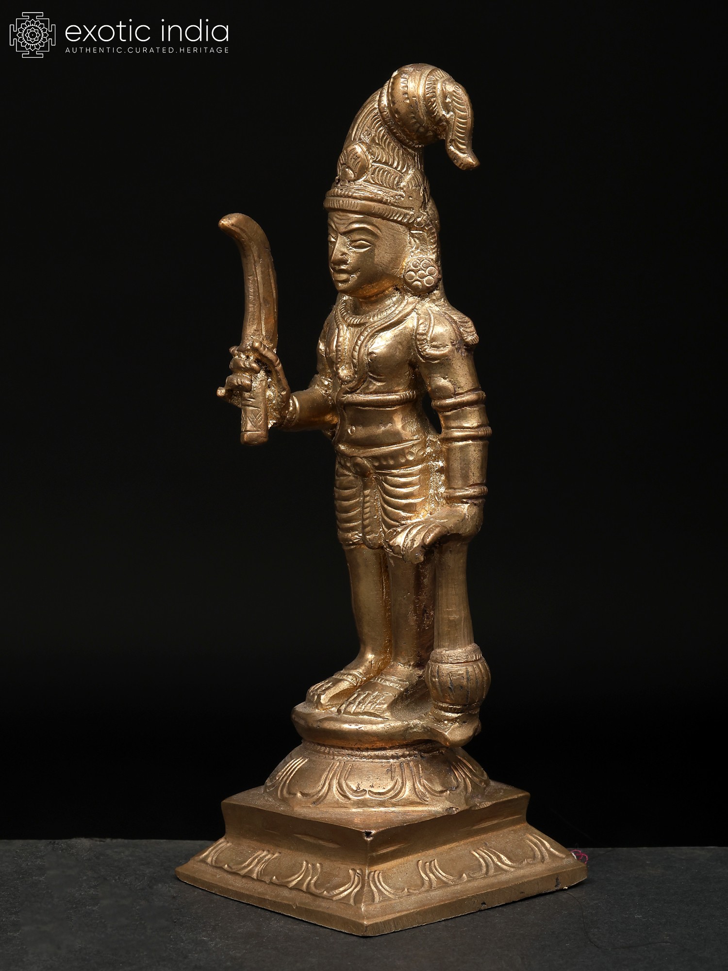 Karuppu Sami is the Dark Lord, hailing from the southern Dravidian lands. Venerated among the rural cultures of Tamil Nadu and Kerala as Kaaval Deivam - this deity is often seen as an avatar of Shiva. Believed to be the protector of his people and a guardian of justice - He is shown wearing a Tripunda on his forehead, sporting a thick mustache (generally associated with divine masculinity). He holds a sword and mace as signs of his immense strength and ability to diminish the elements of Adharma. Made in shiny Panchaloha bronze, this idol of Karuppu Sami is a precious addition to your abode.