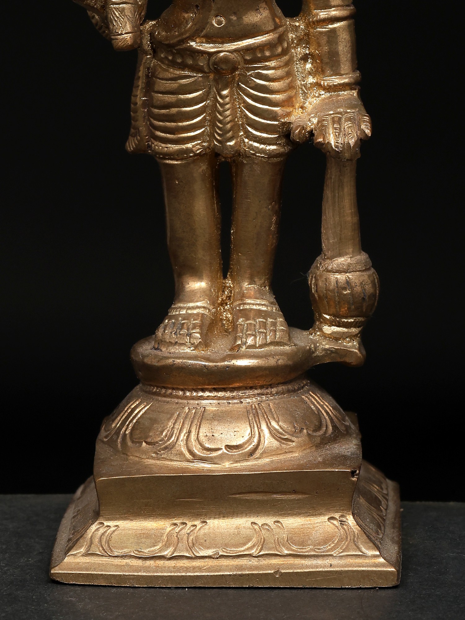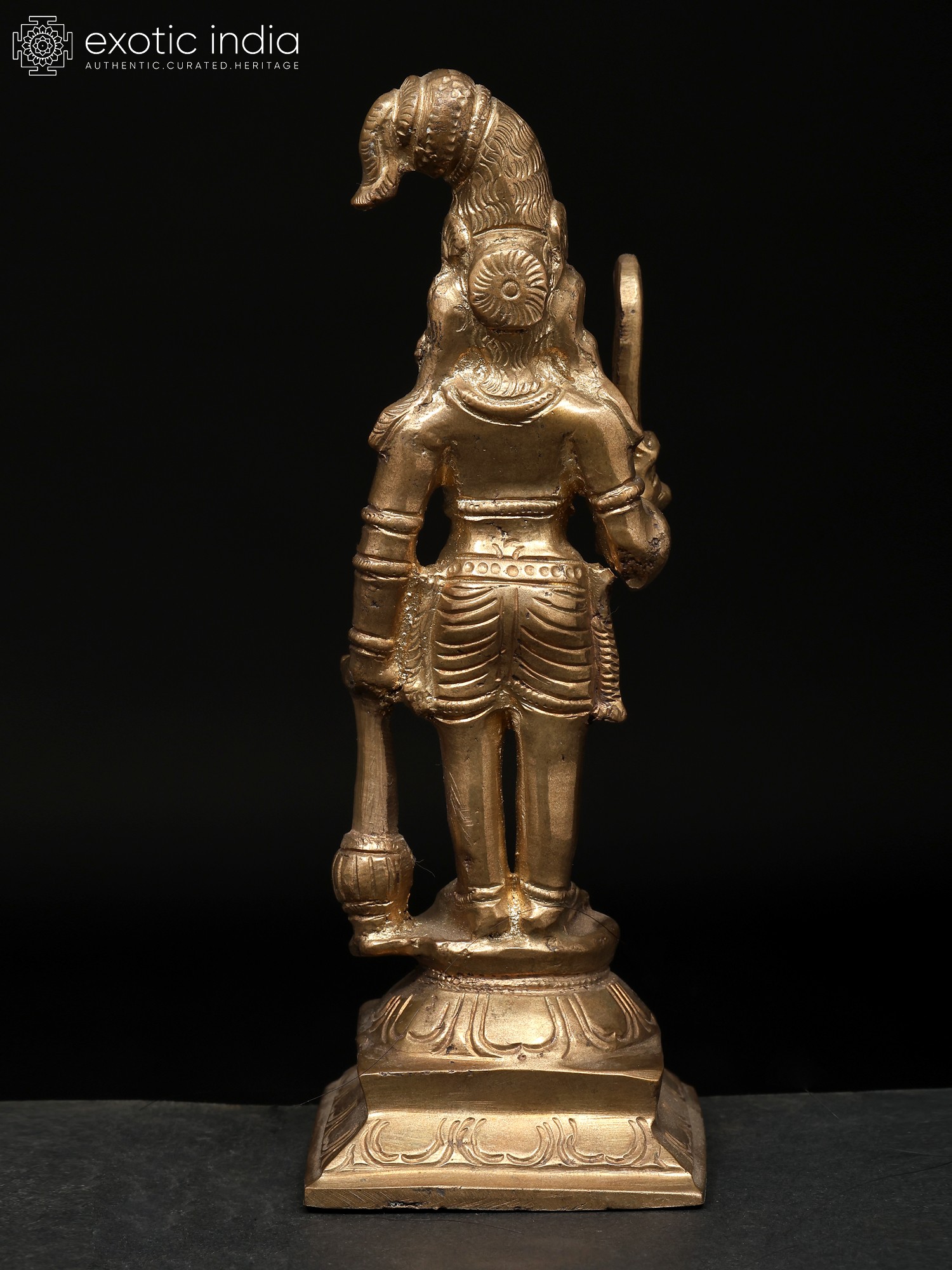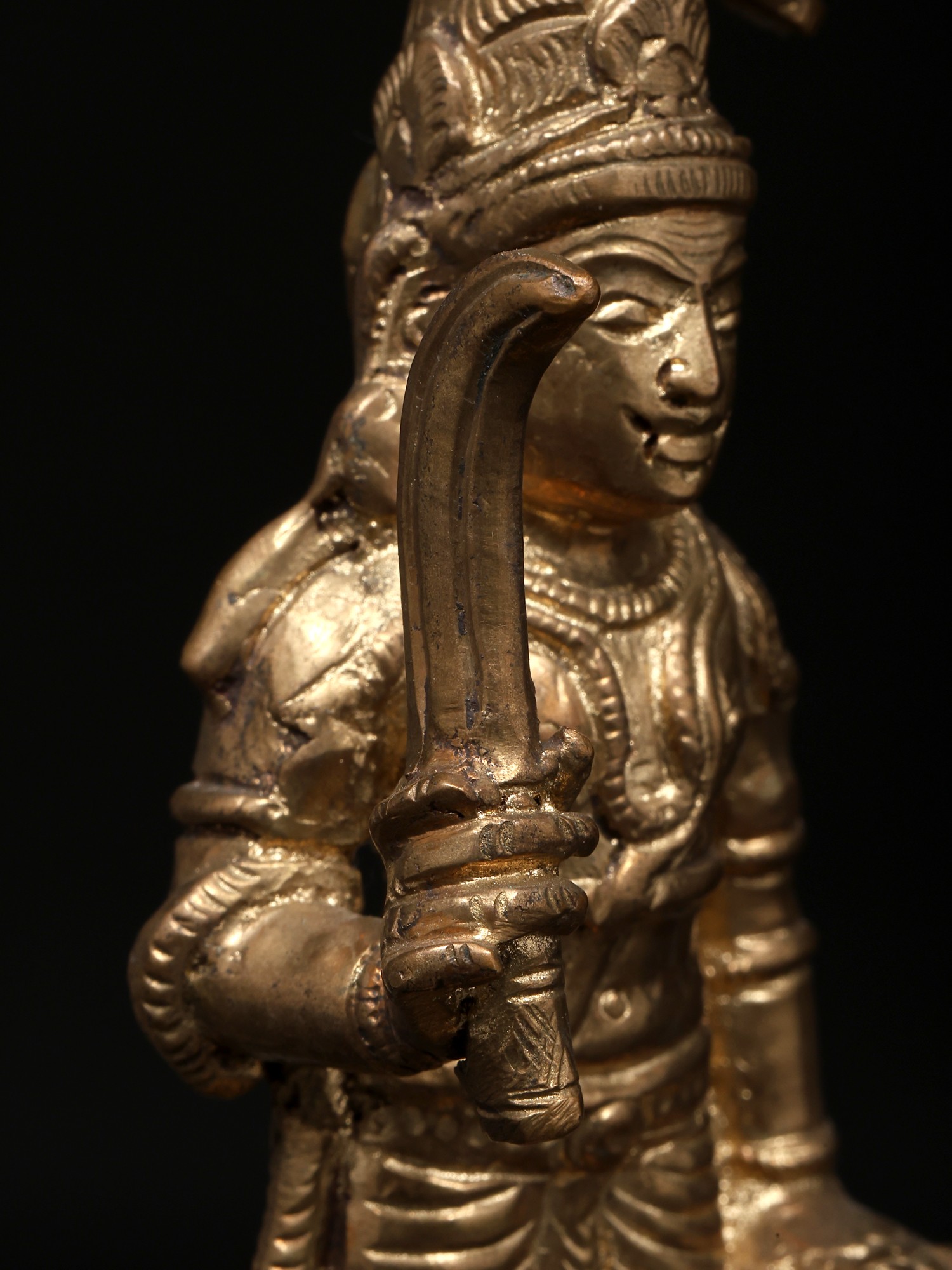 Karuppu Sami is the Dark Lord, hailing from the southern Dravidian lands. Venerated among the rural cultures of Tamil Nadu and Kerala as Kaaval Deivam - this deity is often seen as an avatar of Shiva. Believed to be the protector of his people and a guardian of justice - He is shown wearing a Tripunda on his forehead, sporting a thick mustache (generally associated with divine masculinity). He holds a sword and mace as signs of his immense strength and ability to diminish the elements of Adharma. Made in shiny Panchaloha bronze, this idol of Karuppu Sami is a precious addition to your abode.