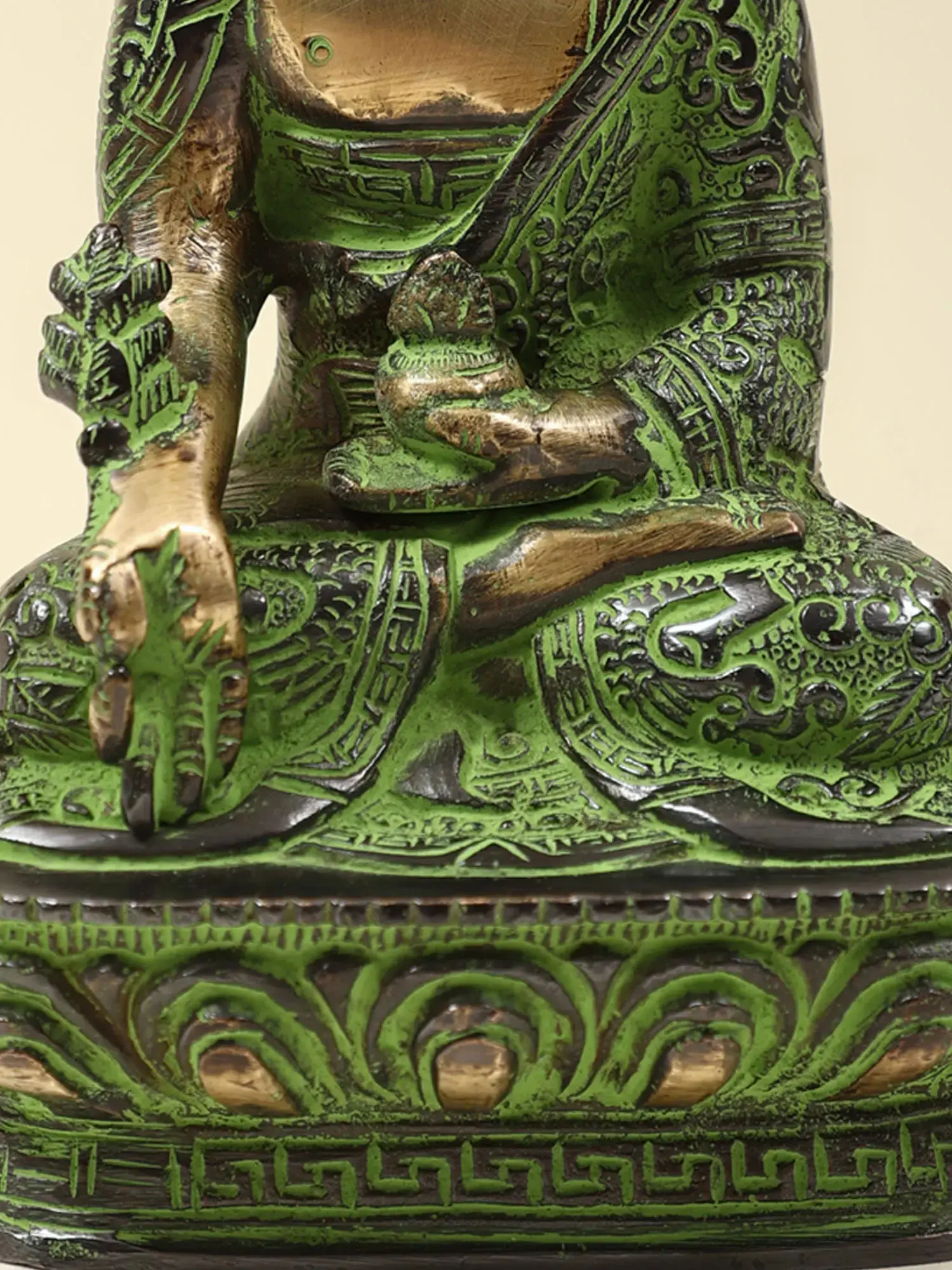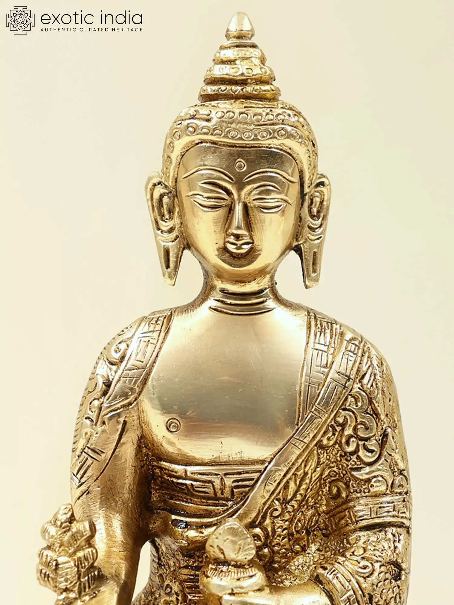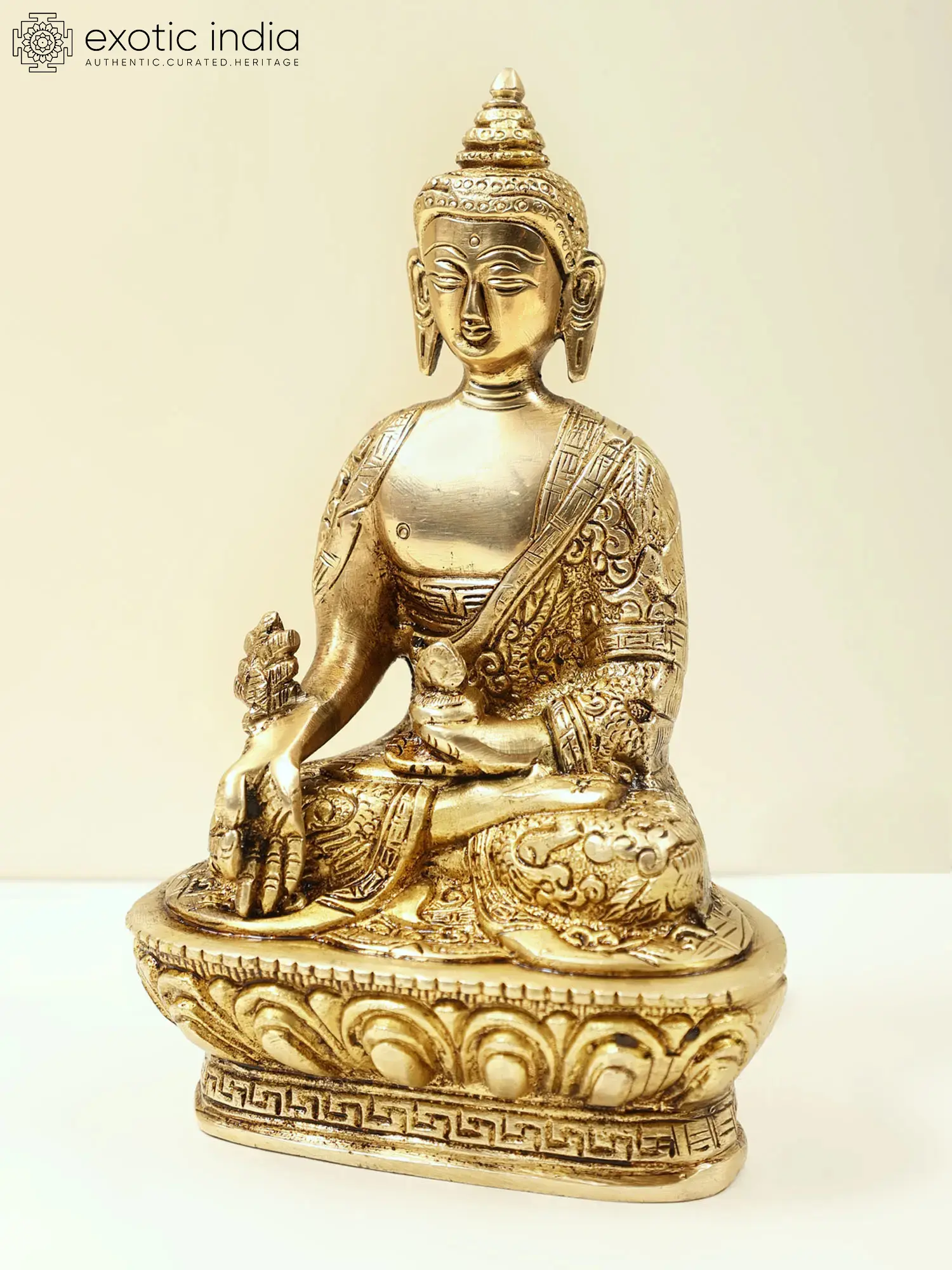 Brought to you in premium brass is the divine Bhaishajyaguru, also known as the Medicine Buddha, adorned with robes decorated with auspicious symbols. This stunning representation beautifully captures the healing and compassionate essence of the Medicine Buddha. Bhaishajyaguru is revered as the embodiment of healing energy and compassion. Devotees invoke his blessings for physical and spiritual well-being, as he is believed to possess the power to heal all ailments and alleviate suffering.