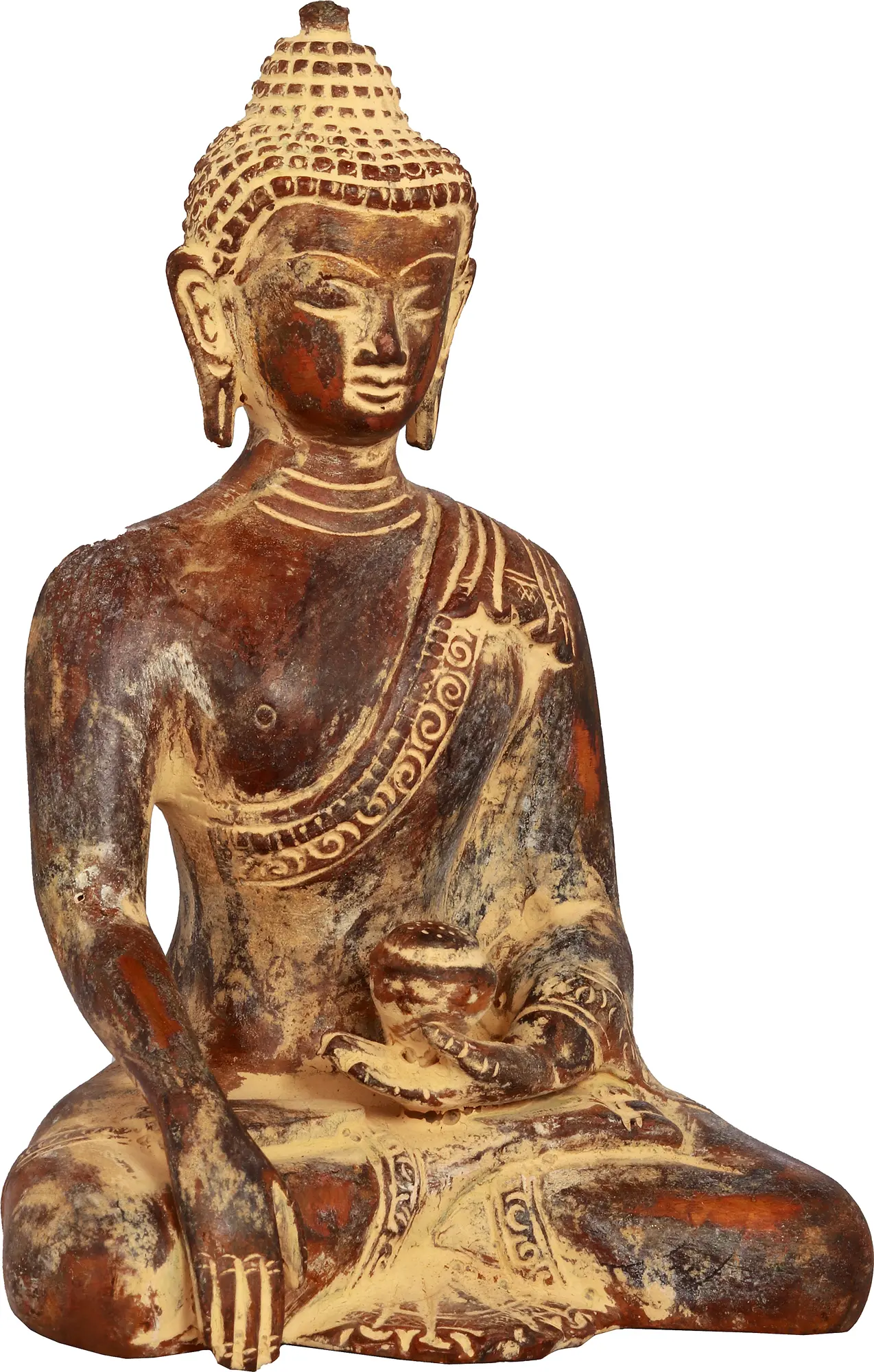 In this sculpture, Lord Buddha (the awakened one) is seated cross legged with his right hand Bhumisparsha Mudra (Earth touching gesture), symbolising his enlightenment and the moment when he called the goddess earth as his witness. Serene and composed, he is depicted wearing simple robes, with closed eyes in deep meditation. His left hand is resting on his lap, carrying a bowl of healing. It is a potent illustration of Lord Buddha’s spiritual development and serves as a guide towards the path of enlightenment.