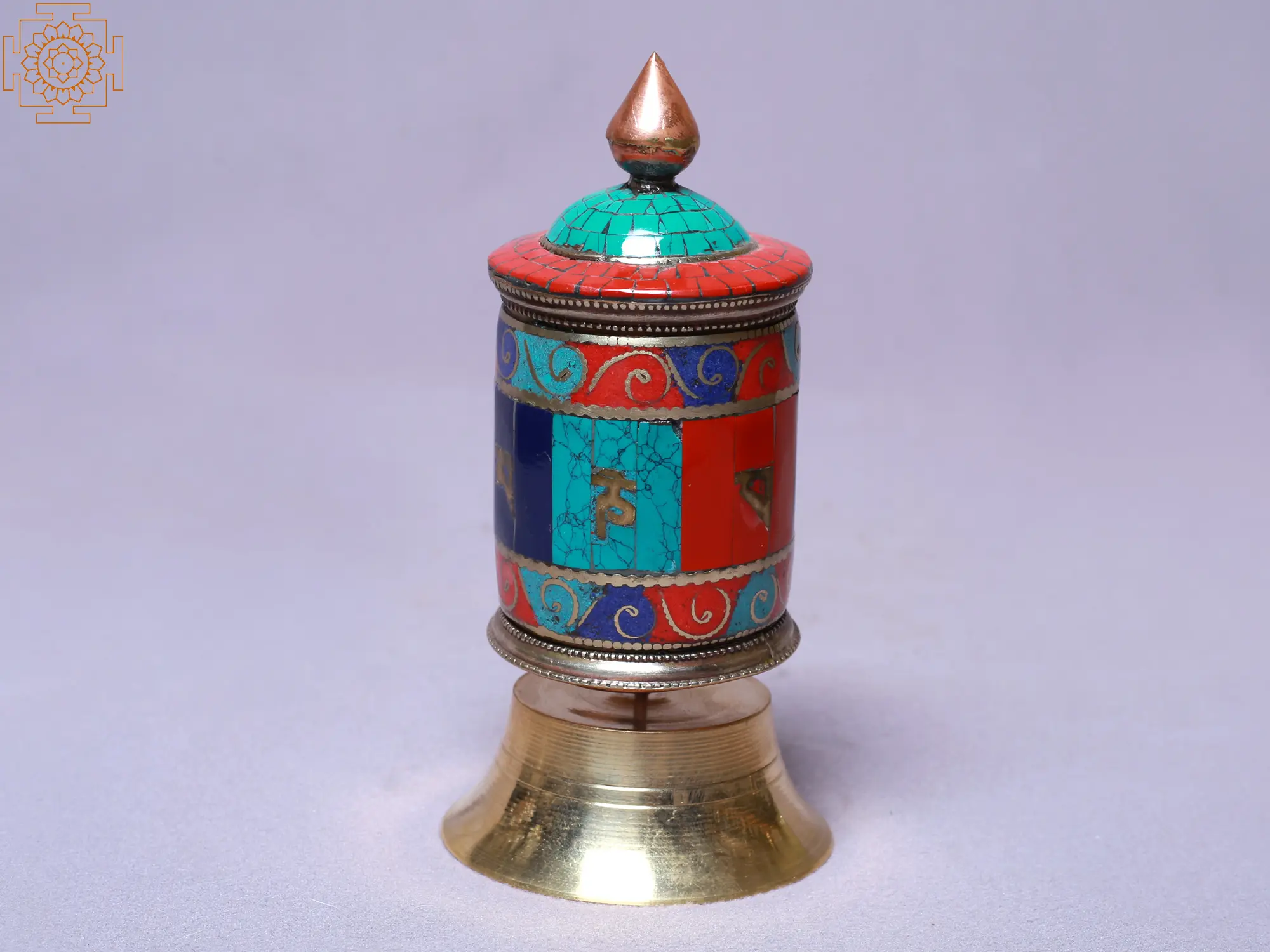 The Tibetan Buddhist Stone Setting Mane, also hailing from Nepal, stands tall upon a bell-shaped base. Intricately carved mantras grace the copper surface, weaving a tapestry of spiritual significance. The coral, turquoise, and blue minerals, on this prayer wheel can captivate the viewer’s eye with its regal allure. But the true essence lies beyond the visual appeal of this stone-setting mane. Deeply rooted in Buddhism, this masterpiece serves as a conduit for prayers, its spinning motion carrying the sacred vibrations of devotion to the heavens. With every rotation, it reminds us of the profound connection between the earthly and the divine, and the timeless power of prayer to transcend boundaries.