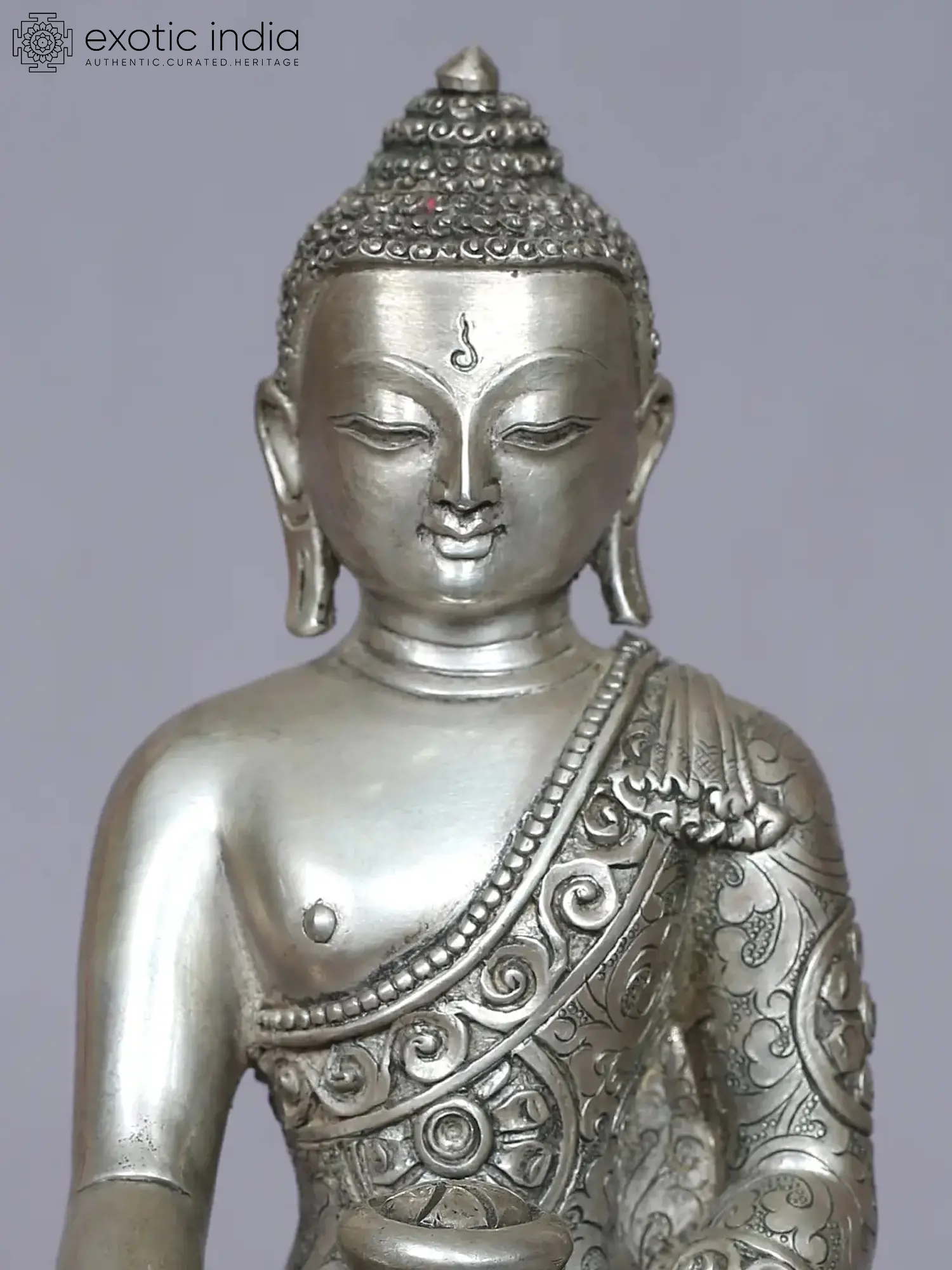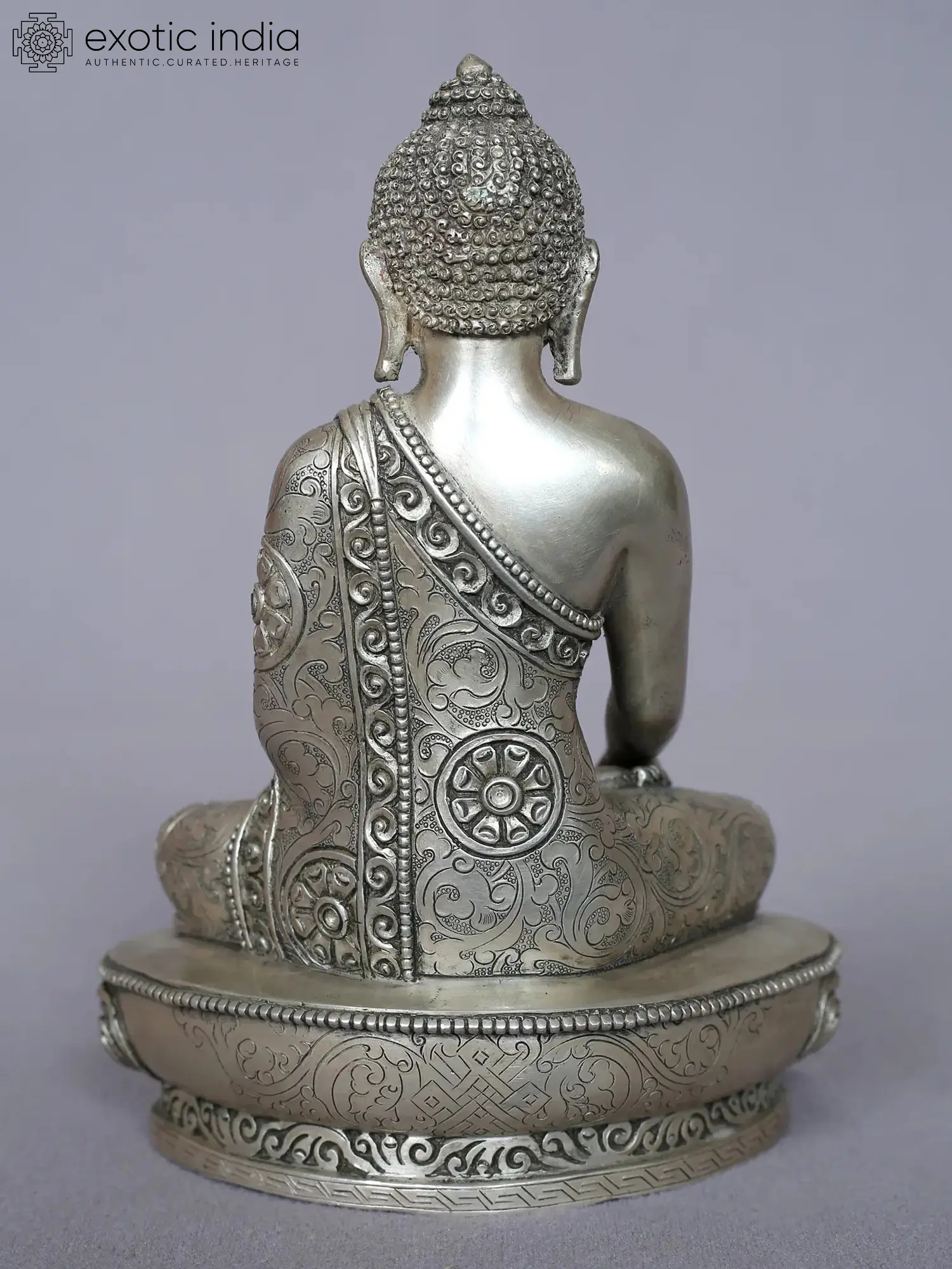 Shakyamuni Buddha in this silver Nepalese statue appears in a heavenly youthful form- round-faced, slender yet sturdy limbs, draped in a beautifully patterned robe. Buddha sits on a blossomed lotus which symbolizes enlightenment in Buddhist art. Shakyamuni’s countenance is enlivened by his angelic features, beholding which takes away all pains from the heart, cleansing the inner consciousness for higher journeys.