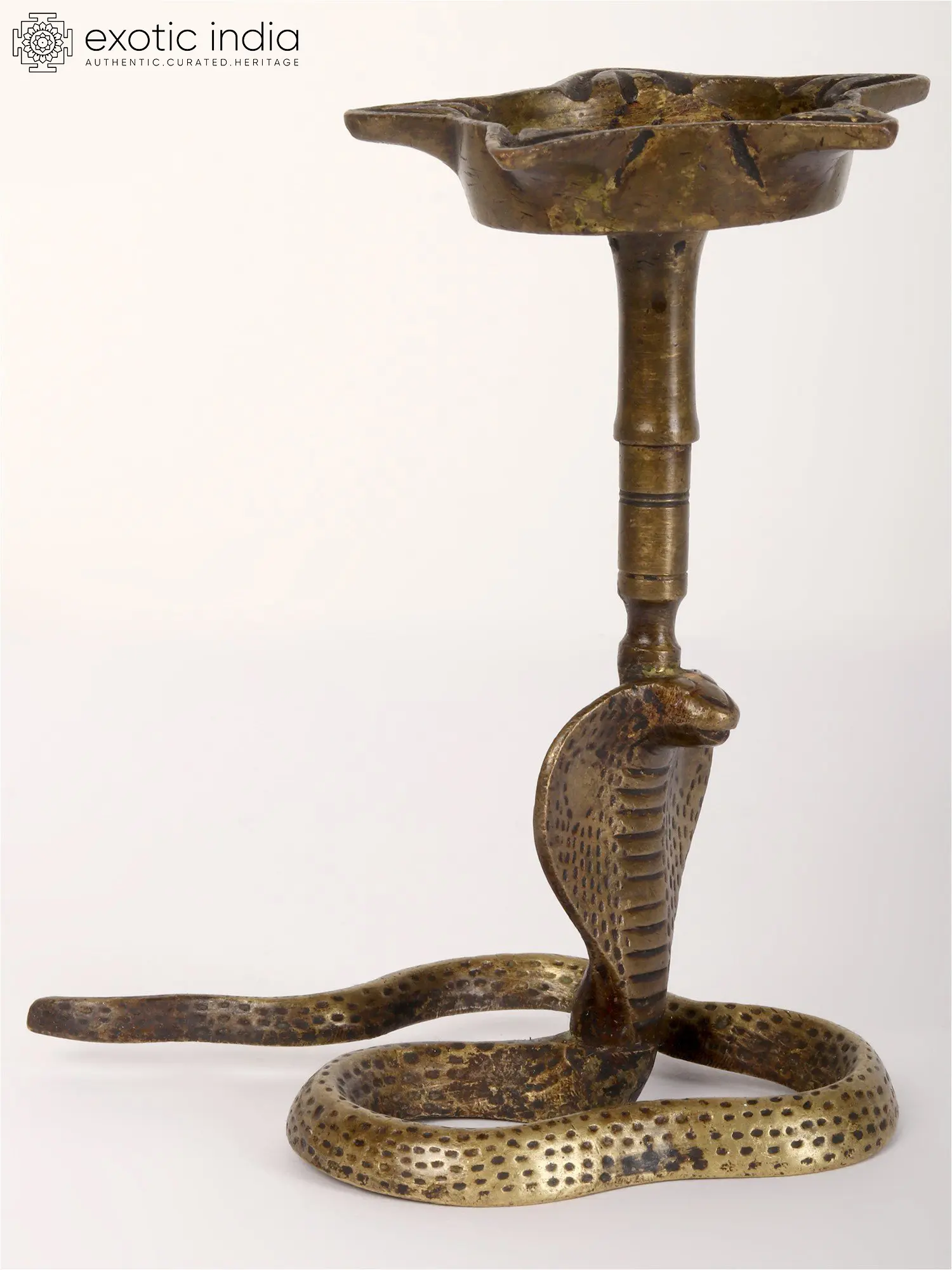 The serpents are worshipped in many forms from Vasuki to Shesh Naga. There are special occasions like Naga Panchami when they are offered Bhoga (blessed food) and incense to get their blessings. Their depiction in various objects of ritual is considered to be auspicious. This brass lamp with five wicks, situated atop a Naga is a similar ritual object. The figure of Naga is magnificent and carries the Diya on its head signifying its role as the bearer of the hidden knowledge of Patala Lok.