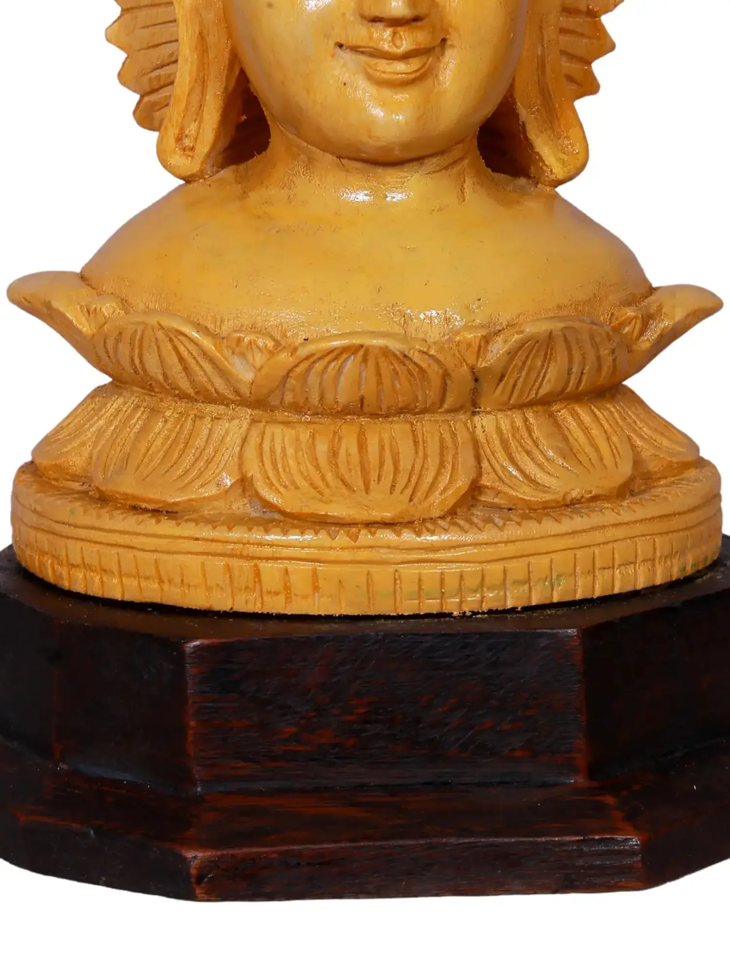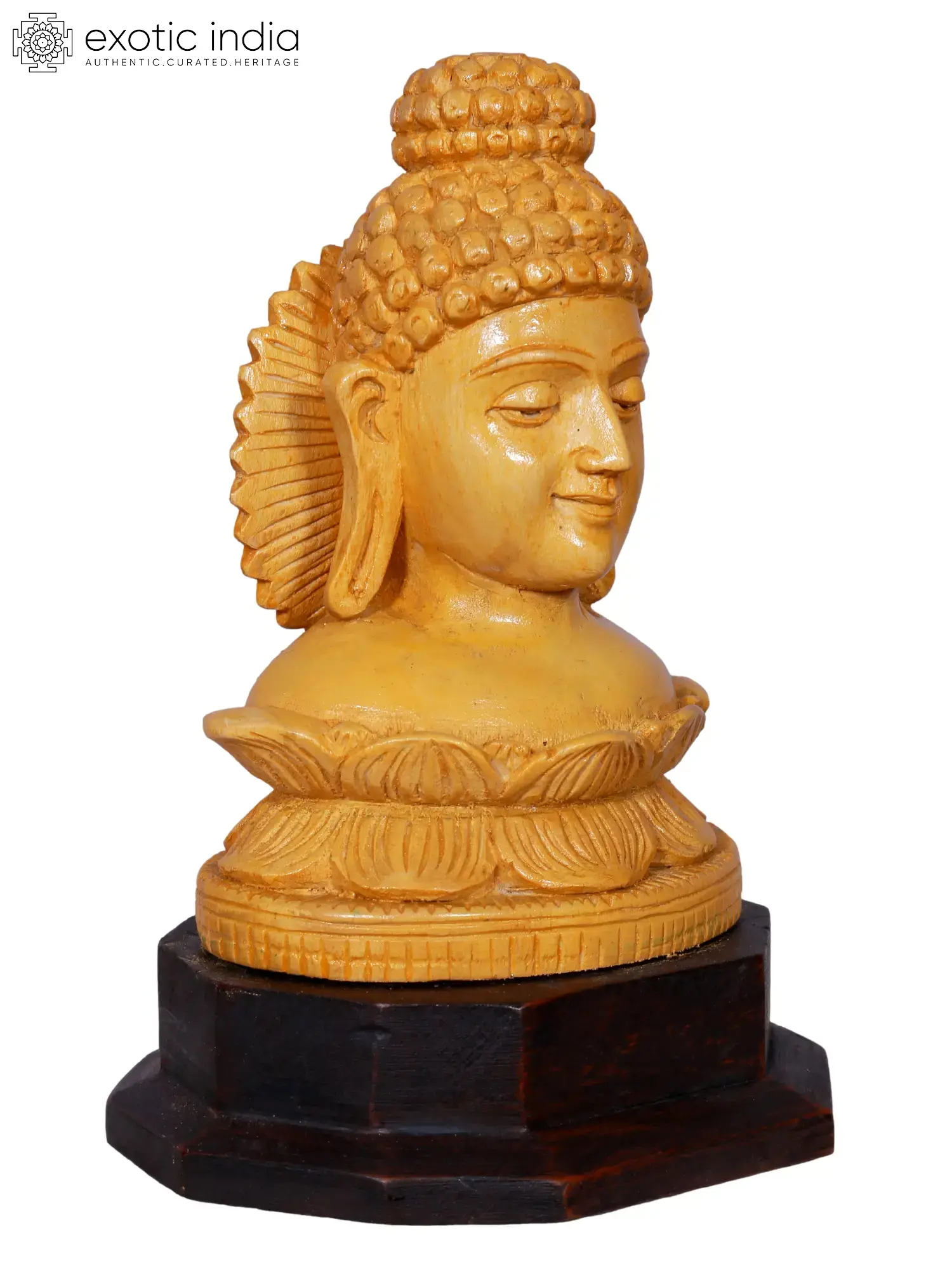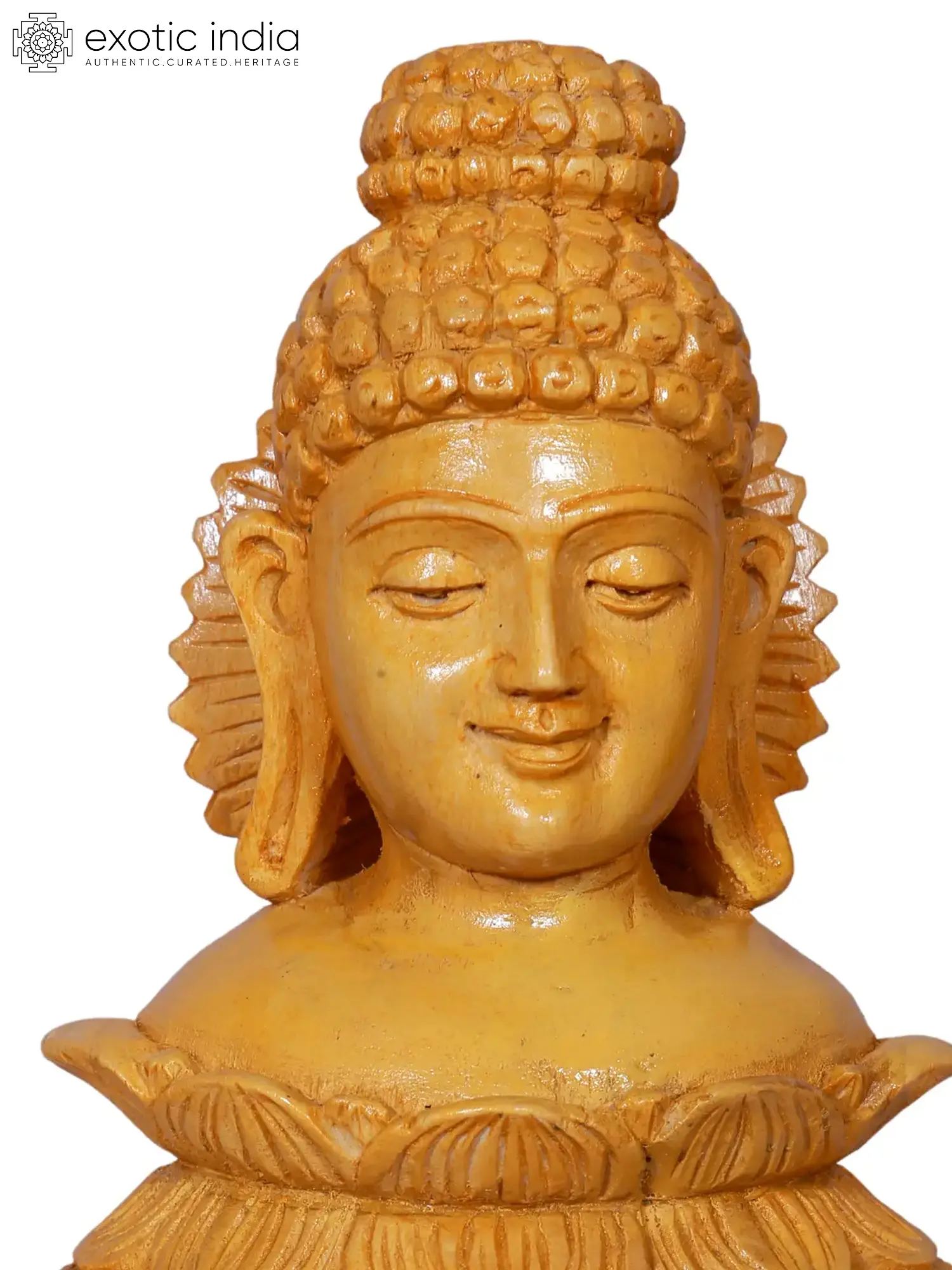 This exquisite wooden bust captures the serene countenance of Lord Buddha, a figure revered across the globe for his teachings on compassion, mindfulness, and the path to enlightenment. Handcrafted with meticulous attention to detail, the warm, natural tones of the wood exude a sense of timeless peace and spiritual depth. The subtle smile, the closed eyes suggesting deep meditation, and the characteristic ushnisha atop his head all contribute to an aura of profound tranquility. The sculpture depicts the Buddha seated upon a lotus throne, a powerful symbol in Buddhism representing purity, spiritual awakening, and the overcoming of worldly attachments. The lotus, which rises unstained from muddy waters, is a metaphor for the Buddha's own journey of achieving enlightenment amidst the challenges of life. The intricate carving of the petals showcases the artisan's skill, creating a visual representation of the unfolding of wisdom and inner beauty.