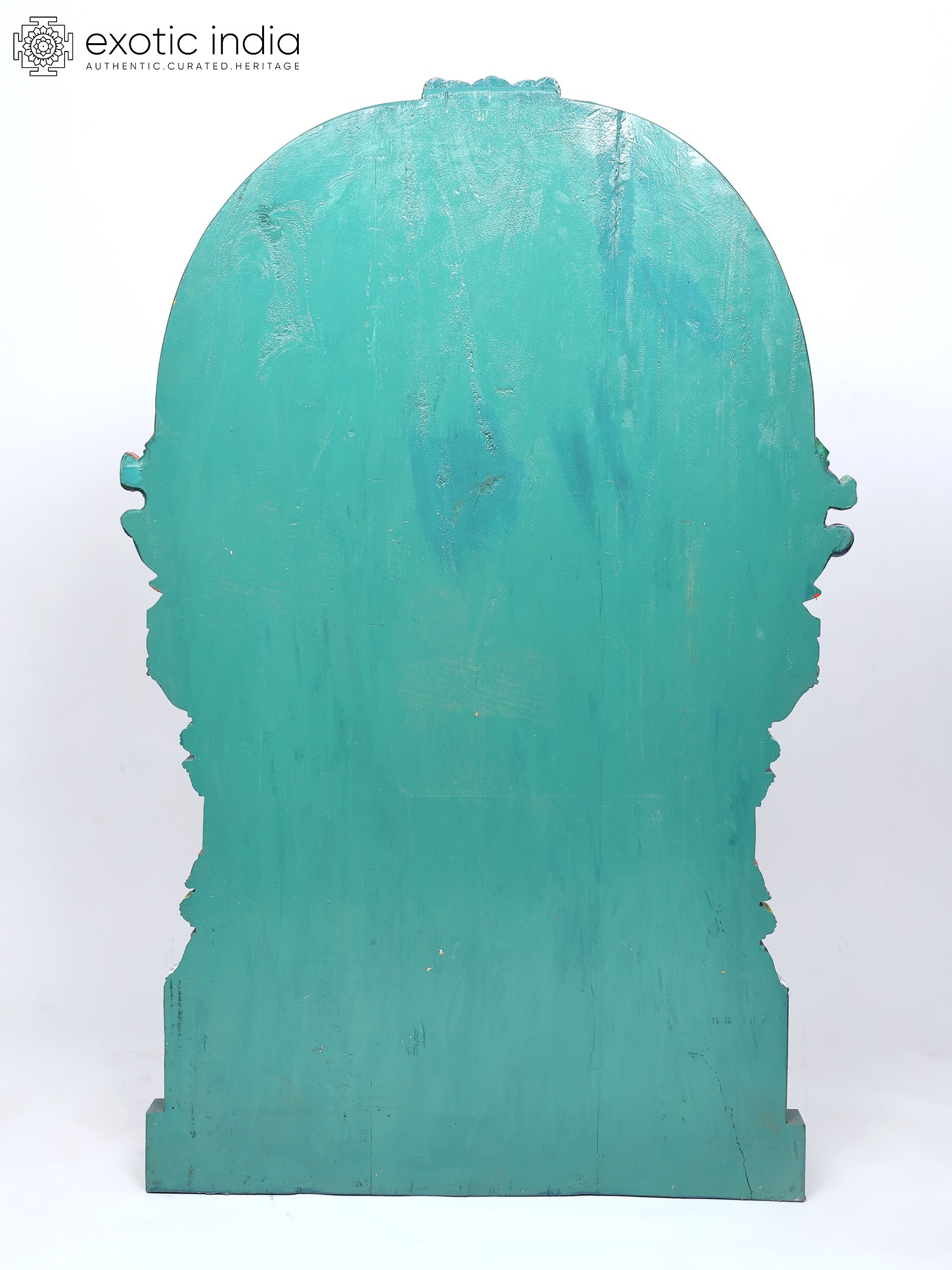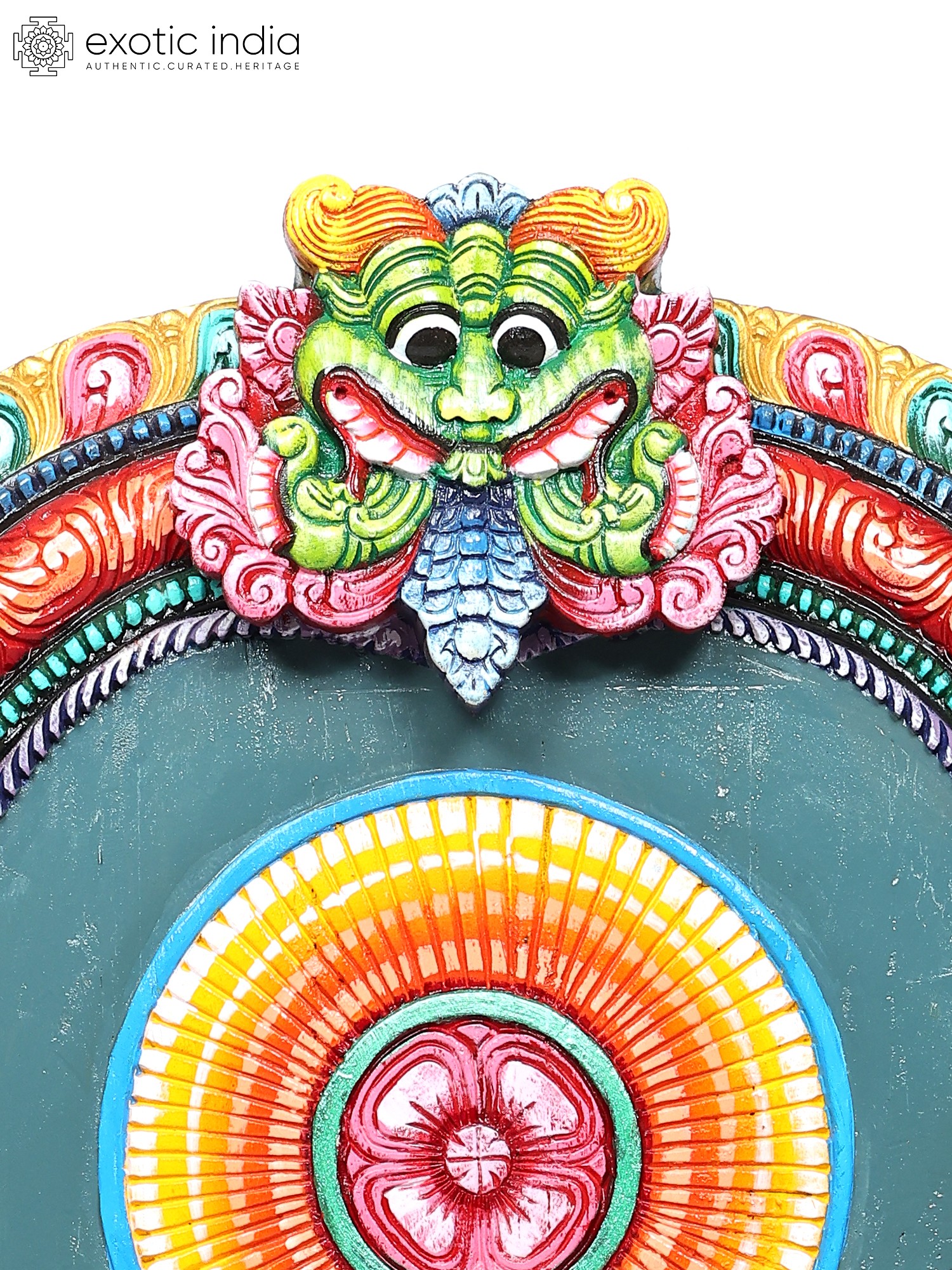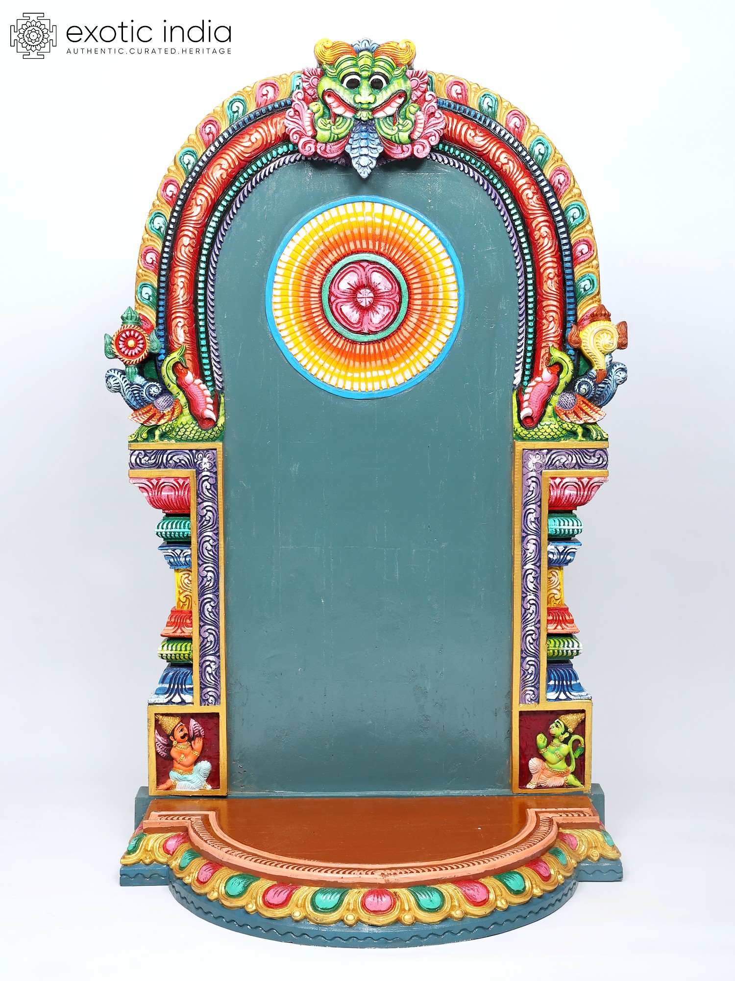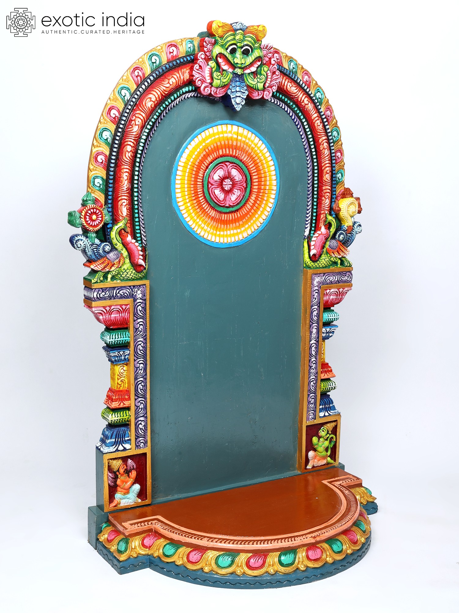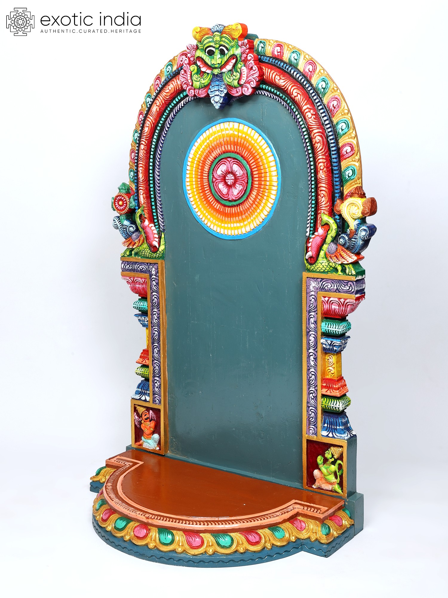 This Kirtimukha throne is more than just a decorative item; it is an invitation to imbue your living space with spiritual depth and artistic excellence. The dedication to craftsmanship, from the deep relief of the carvings to the precise application of color, speaks to the skilled artisans who have poured their talent and devotion into its creation. It is an heirloom piece, meant to be cherished for generations, a tangible link to ancient traditions and a beautiful way to honor and display your most sacred statues. Its substantial size makes it a commanding presence in any room, a constant reminder of the divine presence and the beauty of artistic expression.