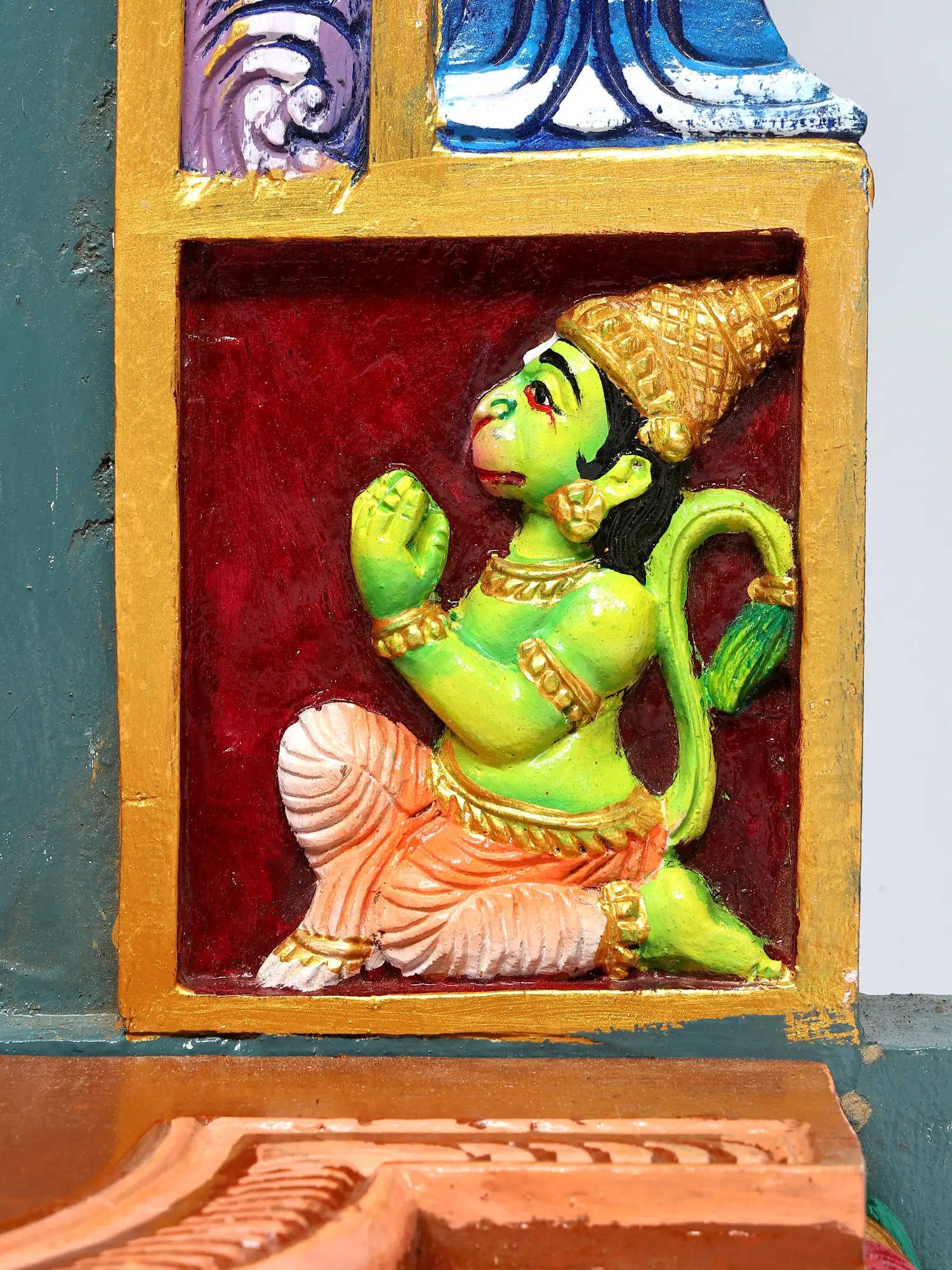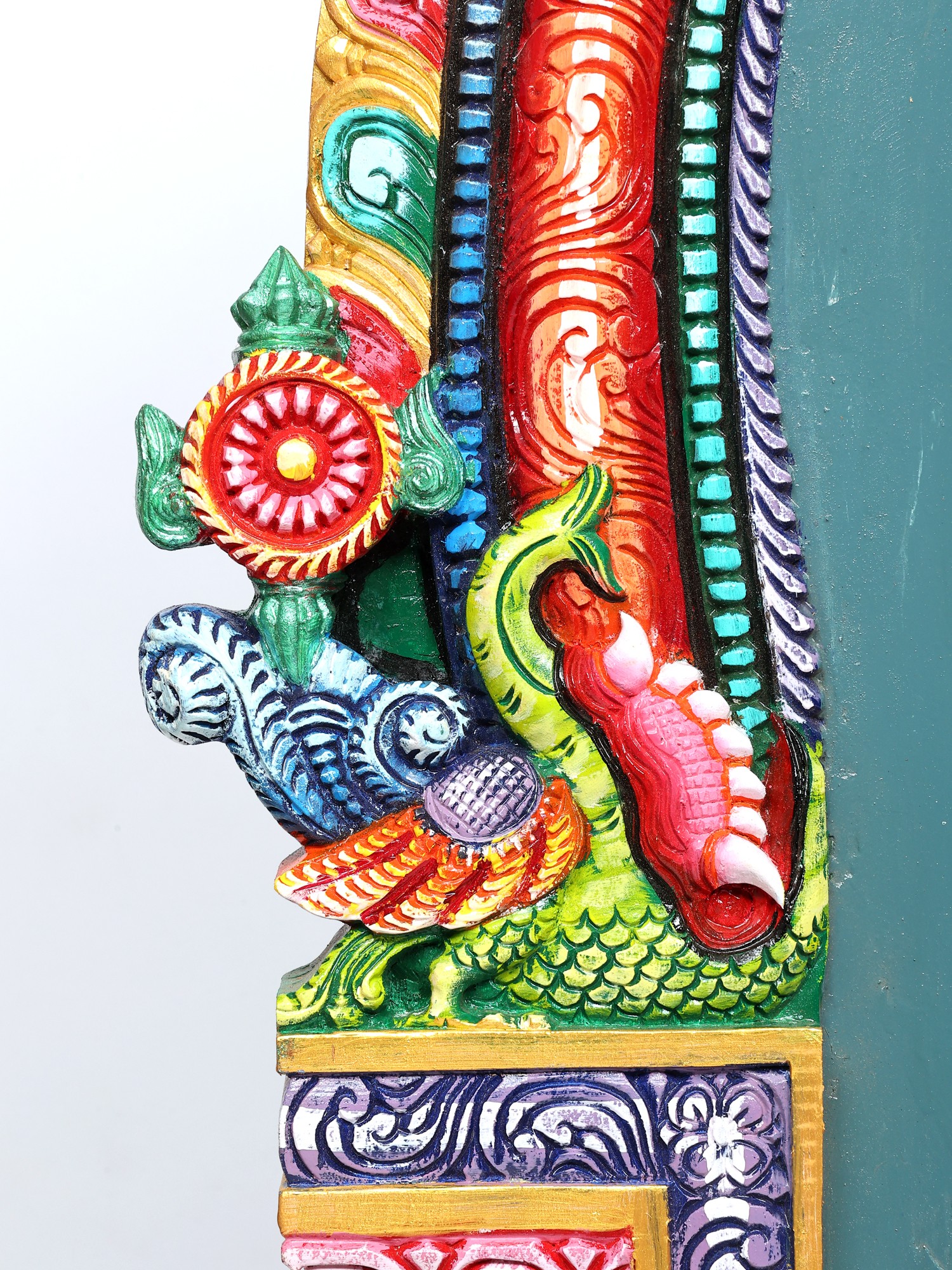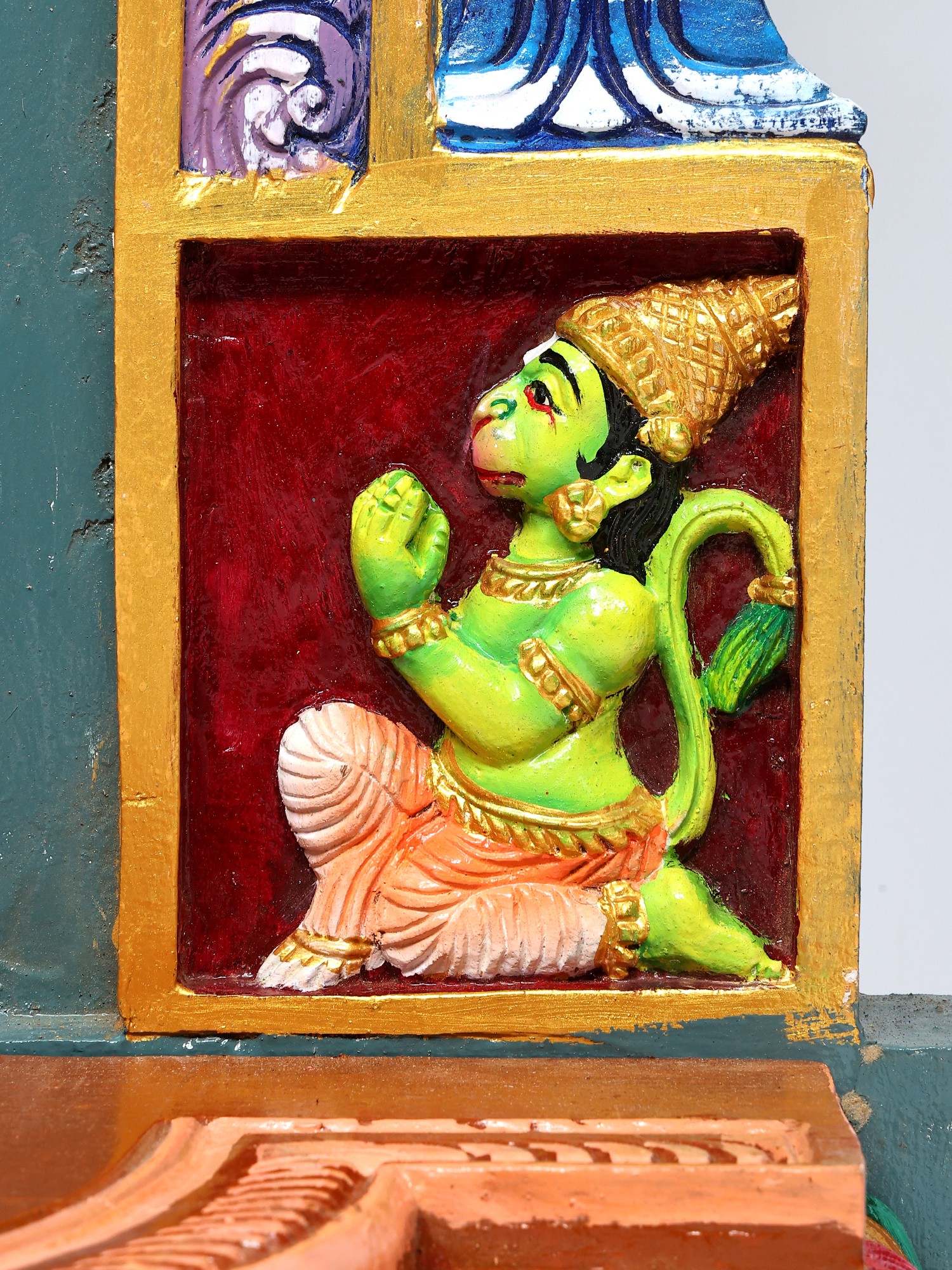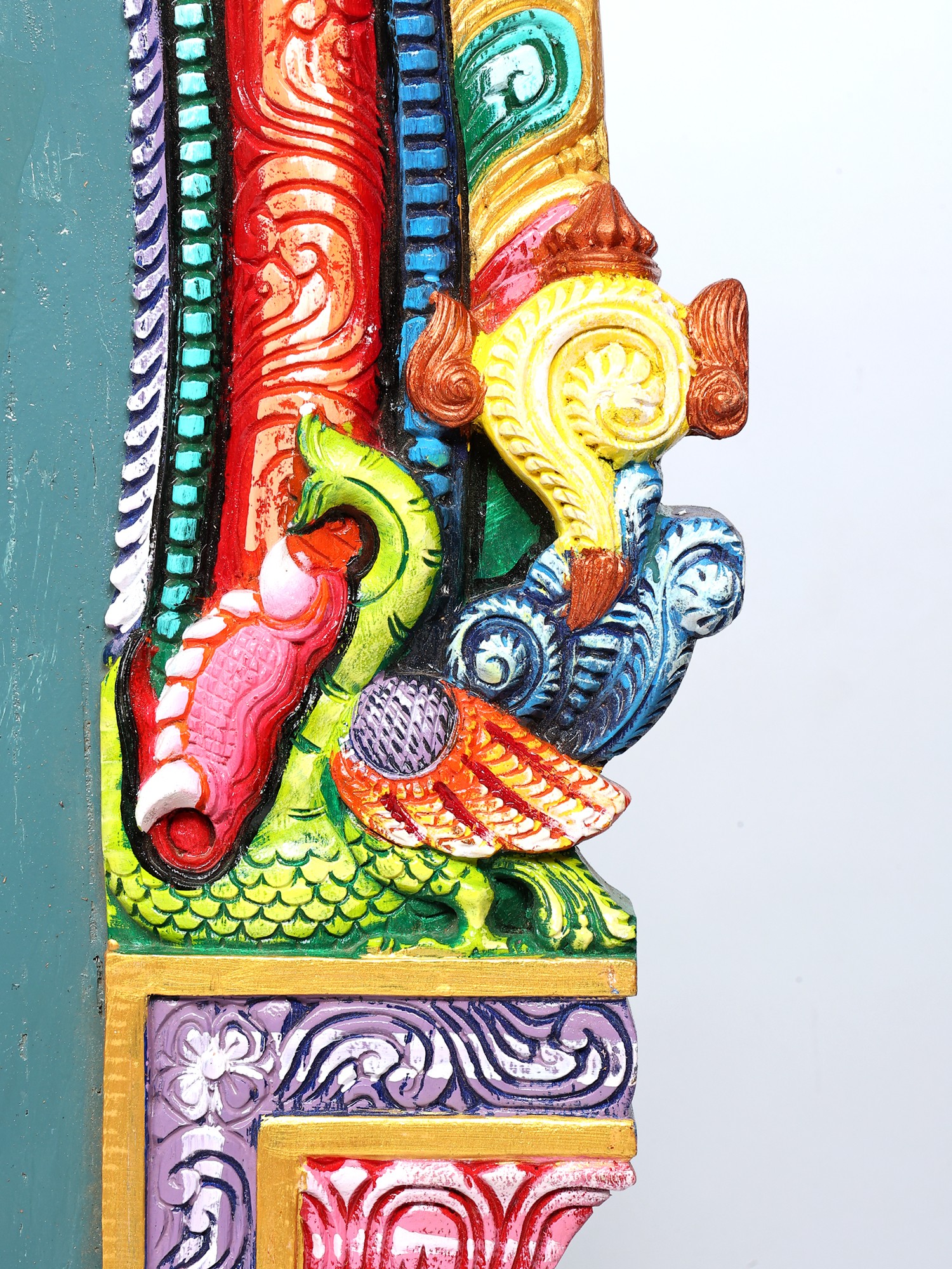 The entire structure is adorned with a vibrant palette of colors, meticulously hand-painted to bring out the intricate details of the wood carving. This polychromatic display is not merely decorative; it carries its own symbolic weight within various Indian artistic traditions. The archway, reminiscent of temple gopurams, is richly embellished with swirling patterns and floral motifs, evoking the exuberance and spiritual ecstasy found in temple architecture. Flanking the central panel are depictions of peacocks, auspicious birds often associated with beauty, grace, and immortality, and mythical creatures, adding layers of auspiciousness and grandeur. Below, in the niches, are rendered figures of devotees in prayer, perhaps representing Hanuman, the devoted servant of Rama, or other ardent worshippers, reminding us of the importance of faith and service. The tiered base, adorned with stylized motifs and jewel-like colors, completes this spectacular creation, ensuring every angle offers a feast for the eyes.