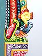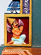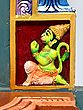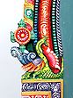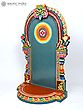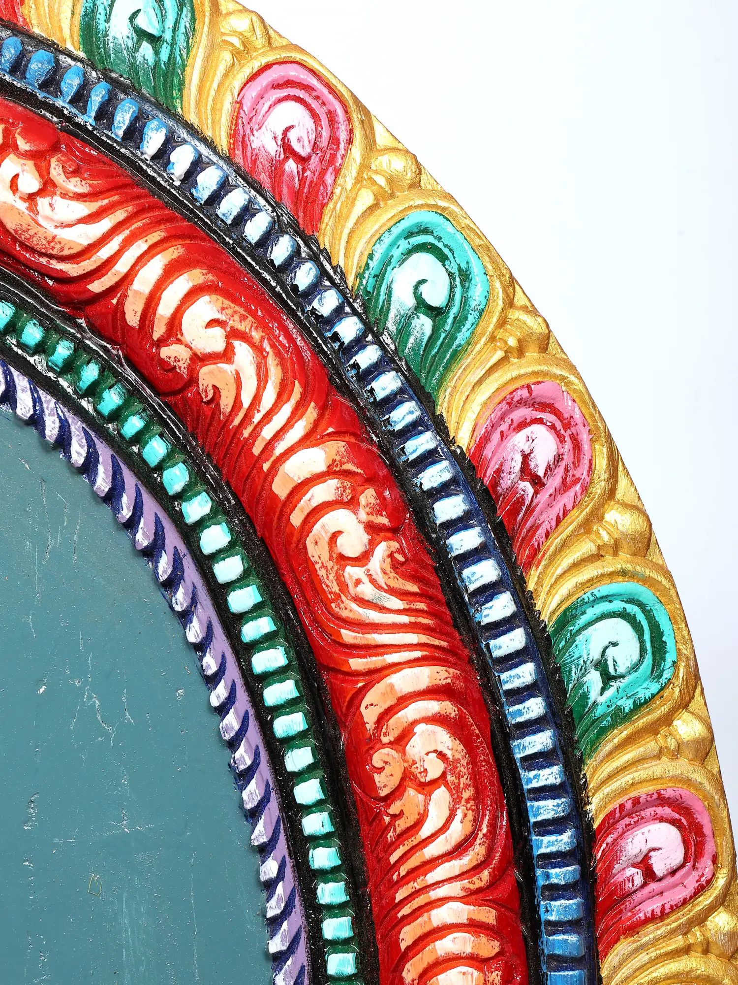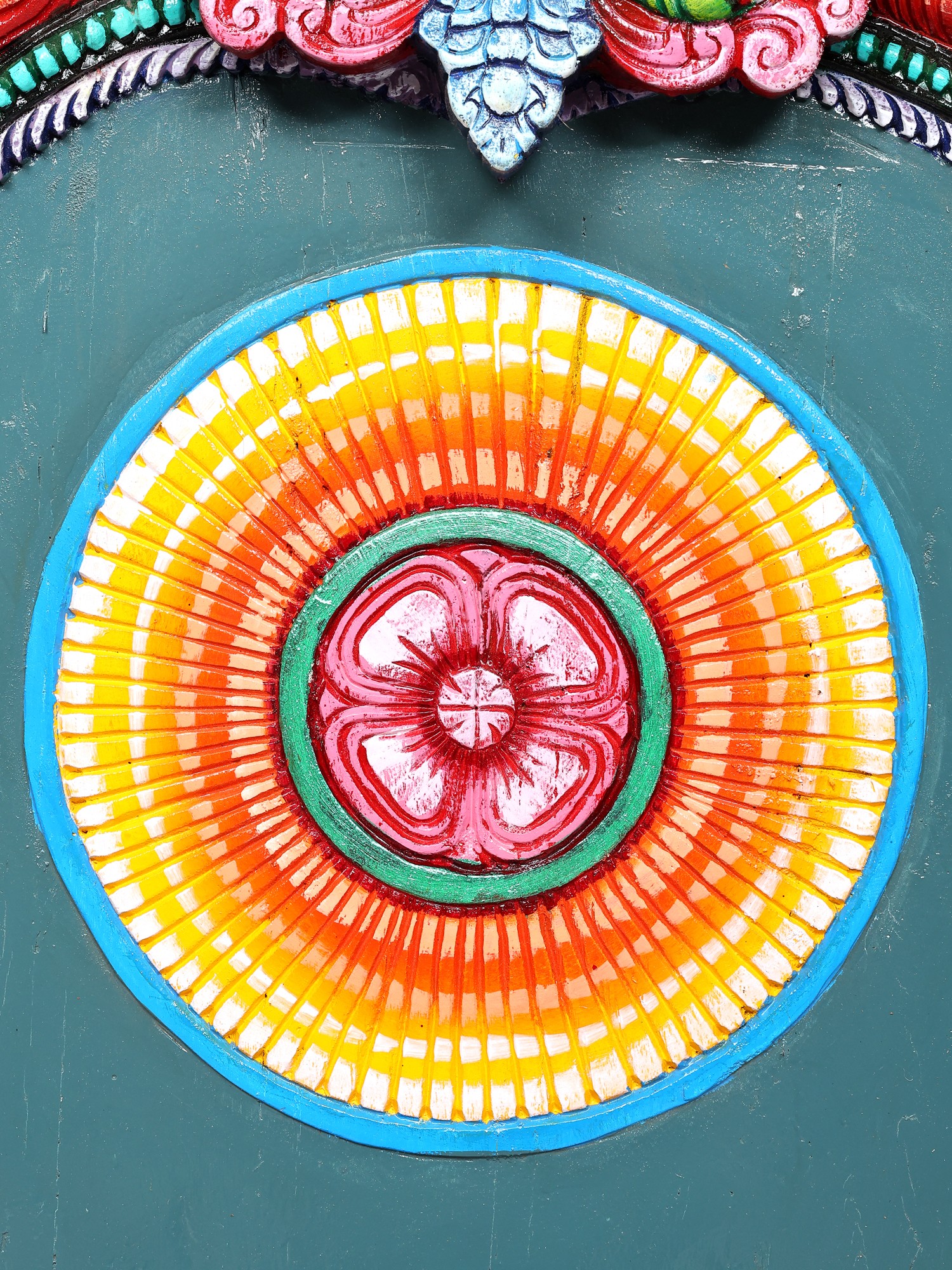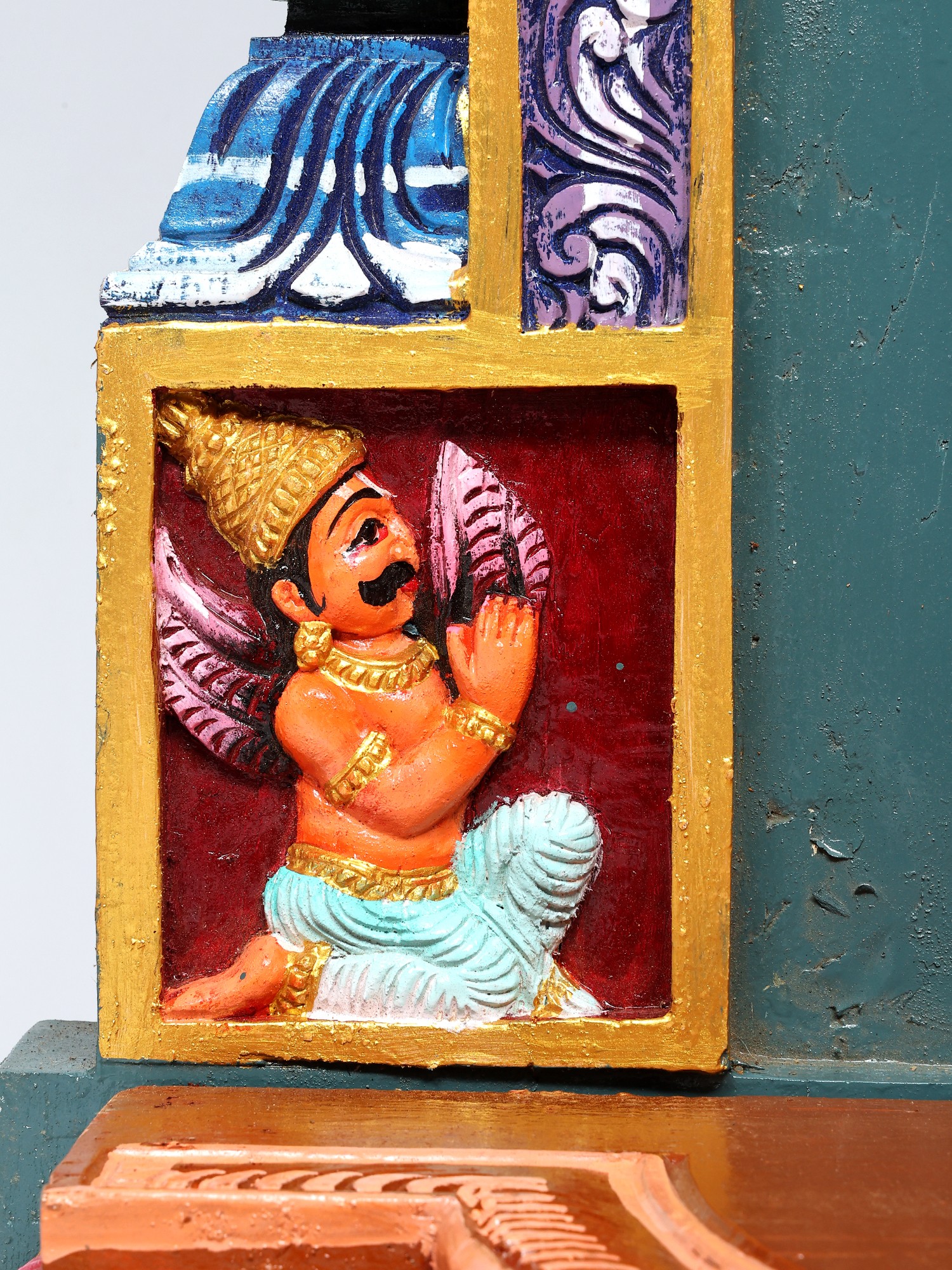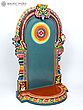 The entire structure is adorned with a vibrant palette of colors, meticulously hand-painted to bring out the intricate details of the wood carving. This polychromatic display is not merely decorative; it carries its own symbolic weight within various Indian artistic traditions. The archway, reminiscent of temple gopurams, is richly embellished with swirling patterns and floral motifs, evoking the exuberance and spiritual ecstasy found in temple architecture. Flanking the central panel are depictions of peacocks, auspicious birds often associated with beauty, grace, and immortality, and mythical creatures, adding layers of auspiciousness and grandeur. Below, in the niches, are rendered figures of devotees in prayer, perhaps representing Hanuman, the devoted servant of Rama, or other ardent worshippers, reminding us of the importance of faith and service. The tiered base, adorned with stylized motifs and jewel-like colors, completes this spectacular creation, ensuring every angle offers a feast for the eyes.