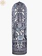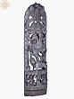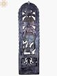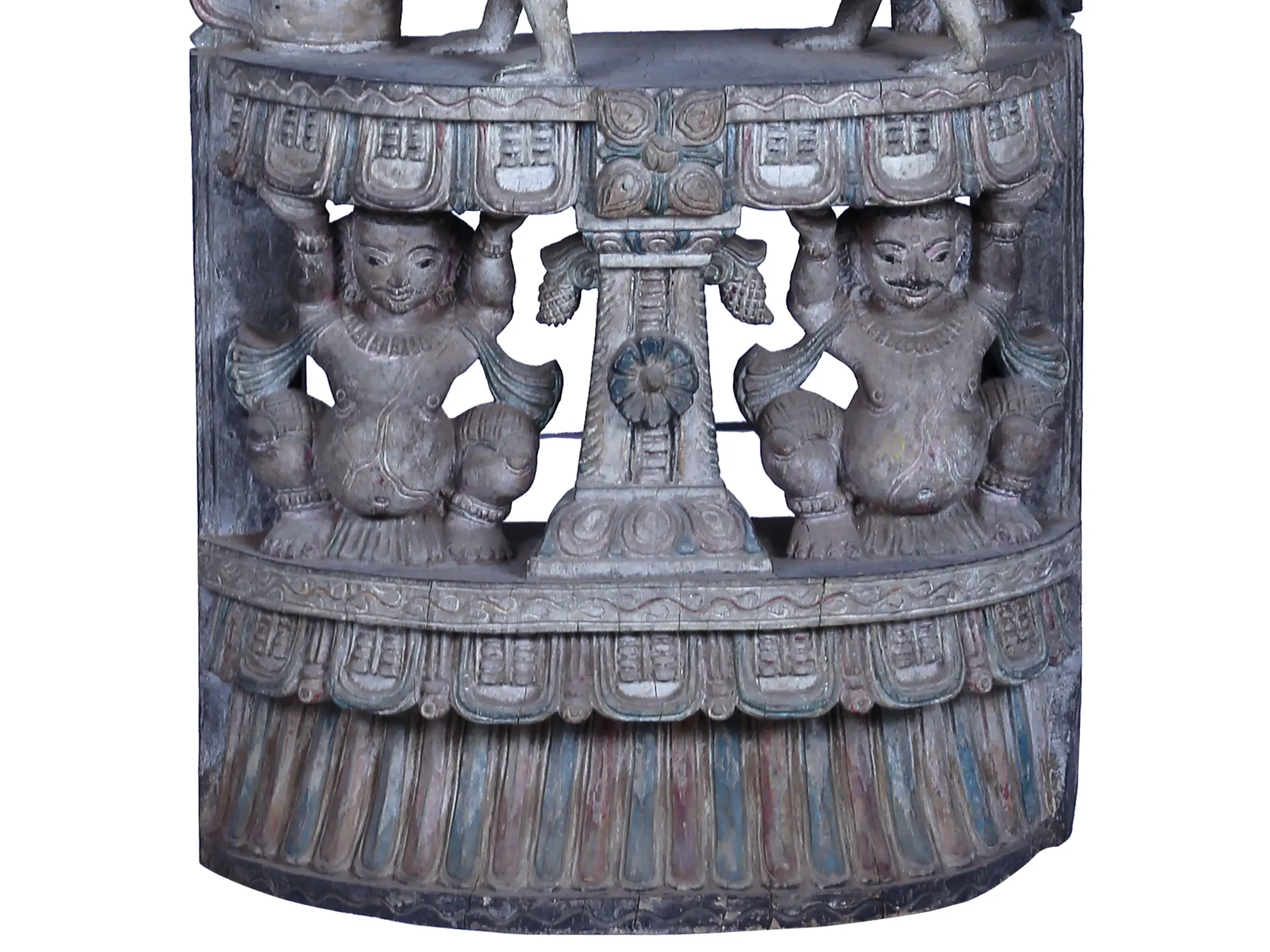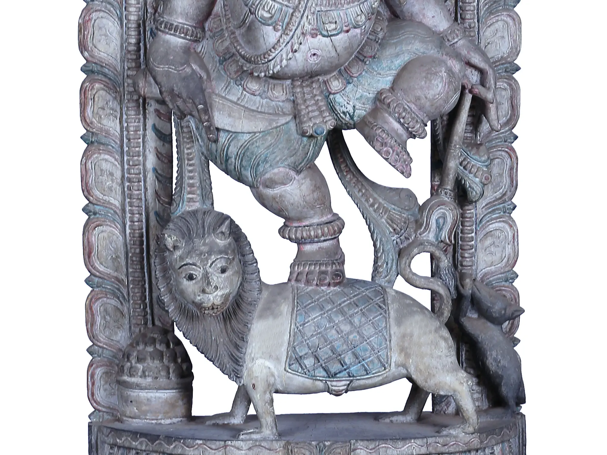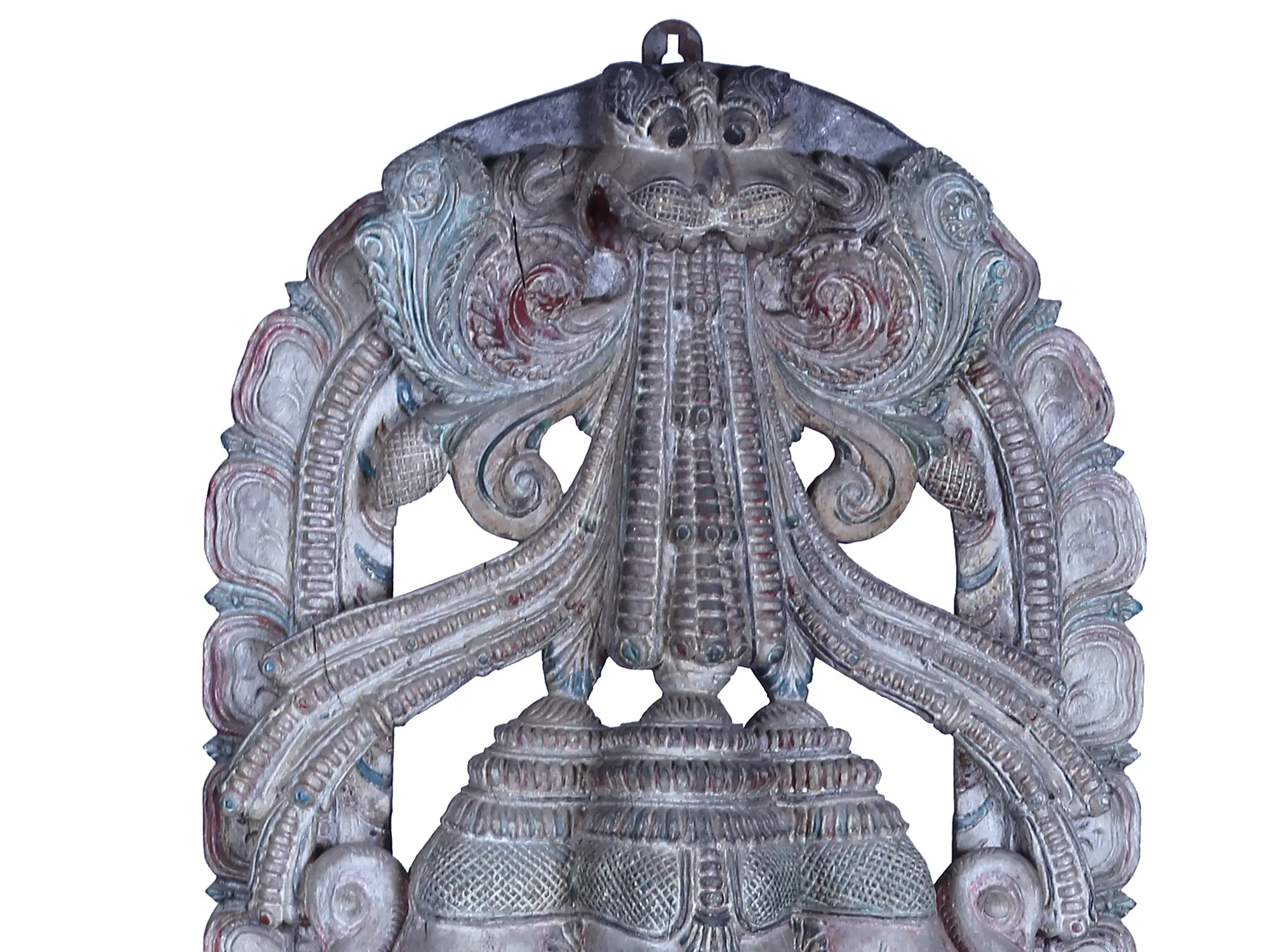 Carved from wood, this large-scale artwork carries the warmth and natural beauty inherent in the material. The use of wood for religious sculptures has a long and revered tradition in many cultures, particularly in India, where it is believed to hold a sacred energy. The subtle patination and the visible grain of the wood contribute to the timeless aesthetic of the piece, suggesting an antiquity that connects it to generations of artistic practice. The intricate patterns and decorative elements surrounding the central deity showcase the skill of the artisan, echoing architectural motifs found in ancient temples and palaces, and infusing the artwork with a sense of spiritual grandeur and historical resonance.