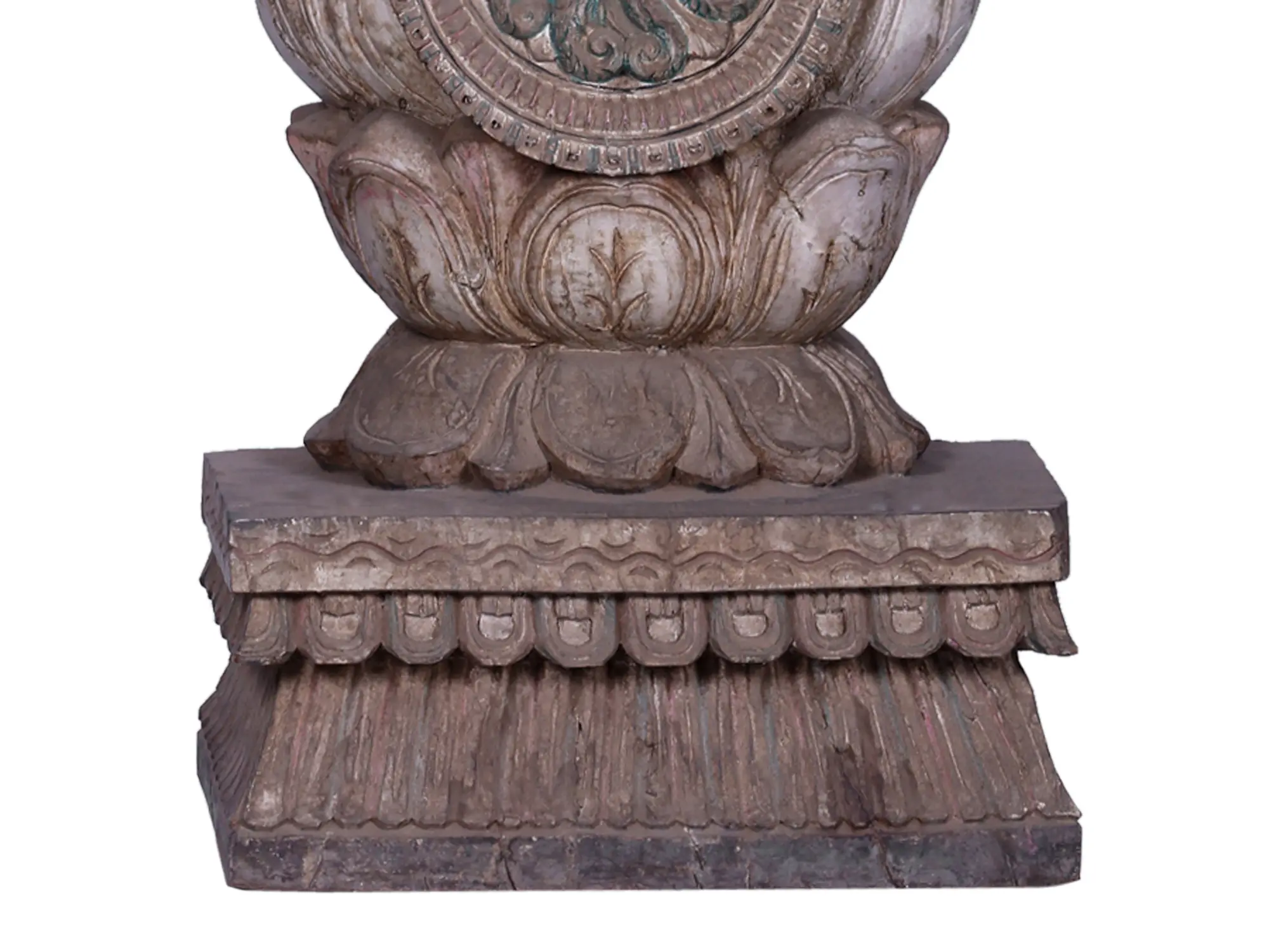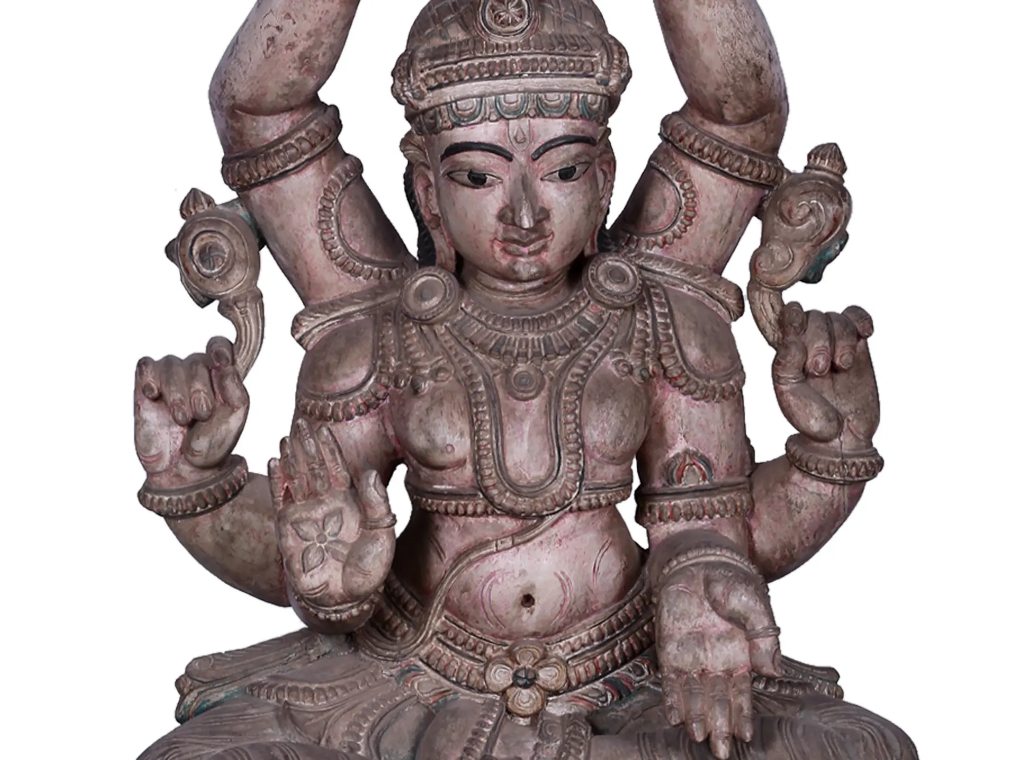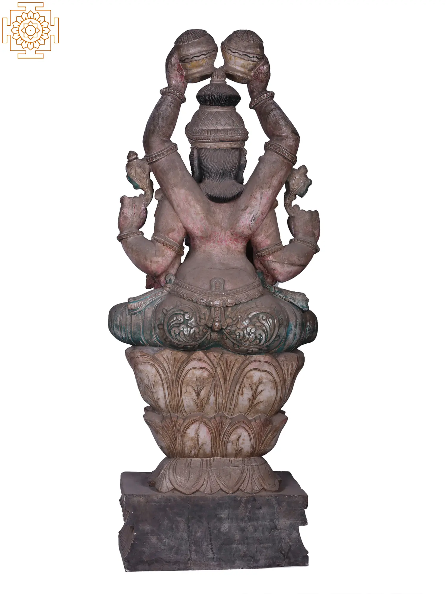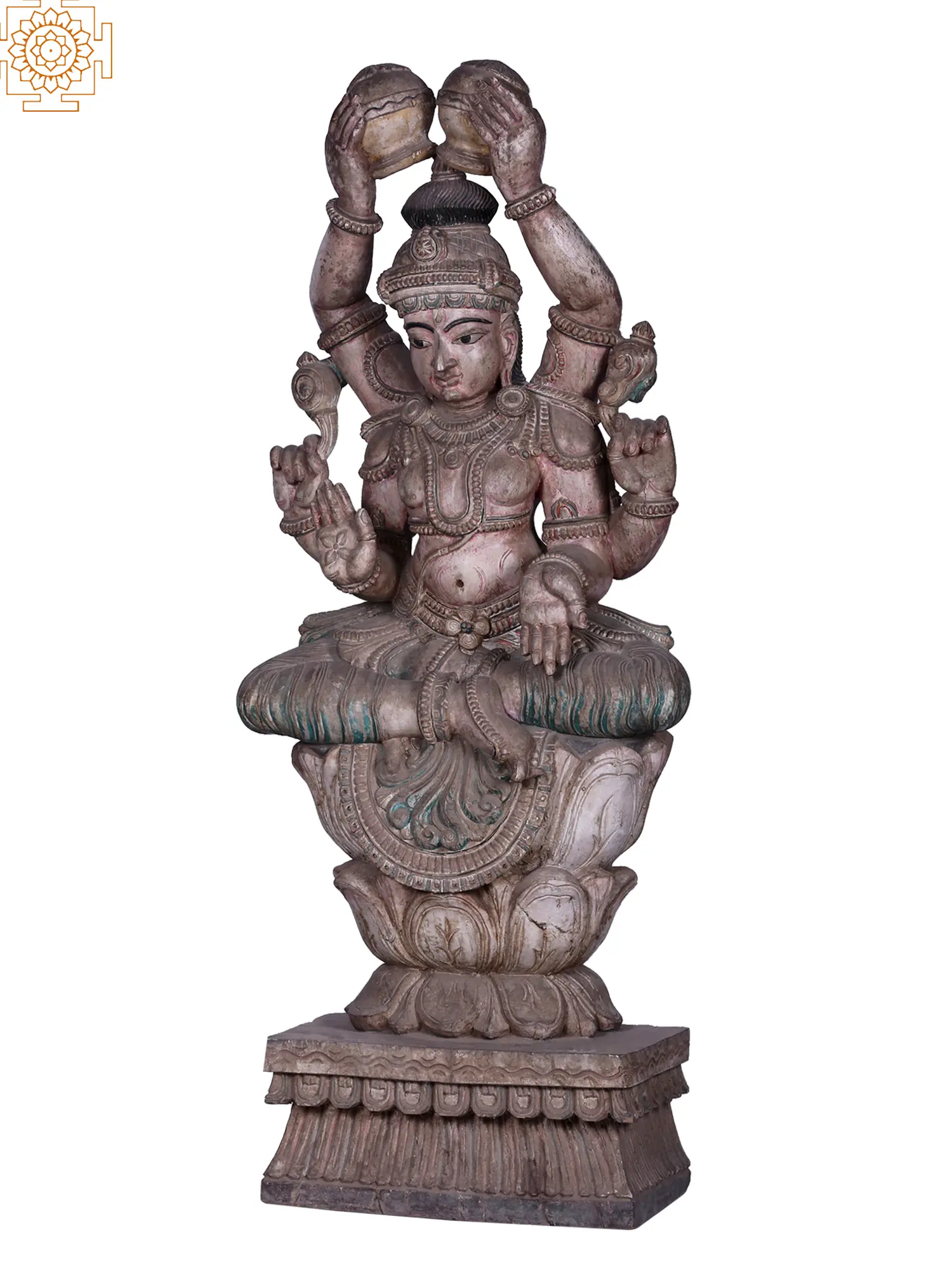 In this unique and rare representation - Lord Vishnu whose Adhavan appears in his Shashbhuja (fix-armed) avatar - Seated on a tri-layered high Padma pedestal in a Padmasana, he appears content holding the Sudarshana Chakra and Panchajanya, the Abhaya mudra represents his ability to vanquish the fear of devotees and the Varada mudra depicts a stream of boons. His other two hands go high, holding the two auspicious Kalashas upside down. This wooden sculpture is the story of Hari, who’s lesser visualized in our hearts.