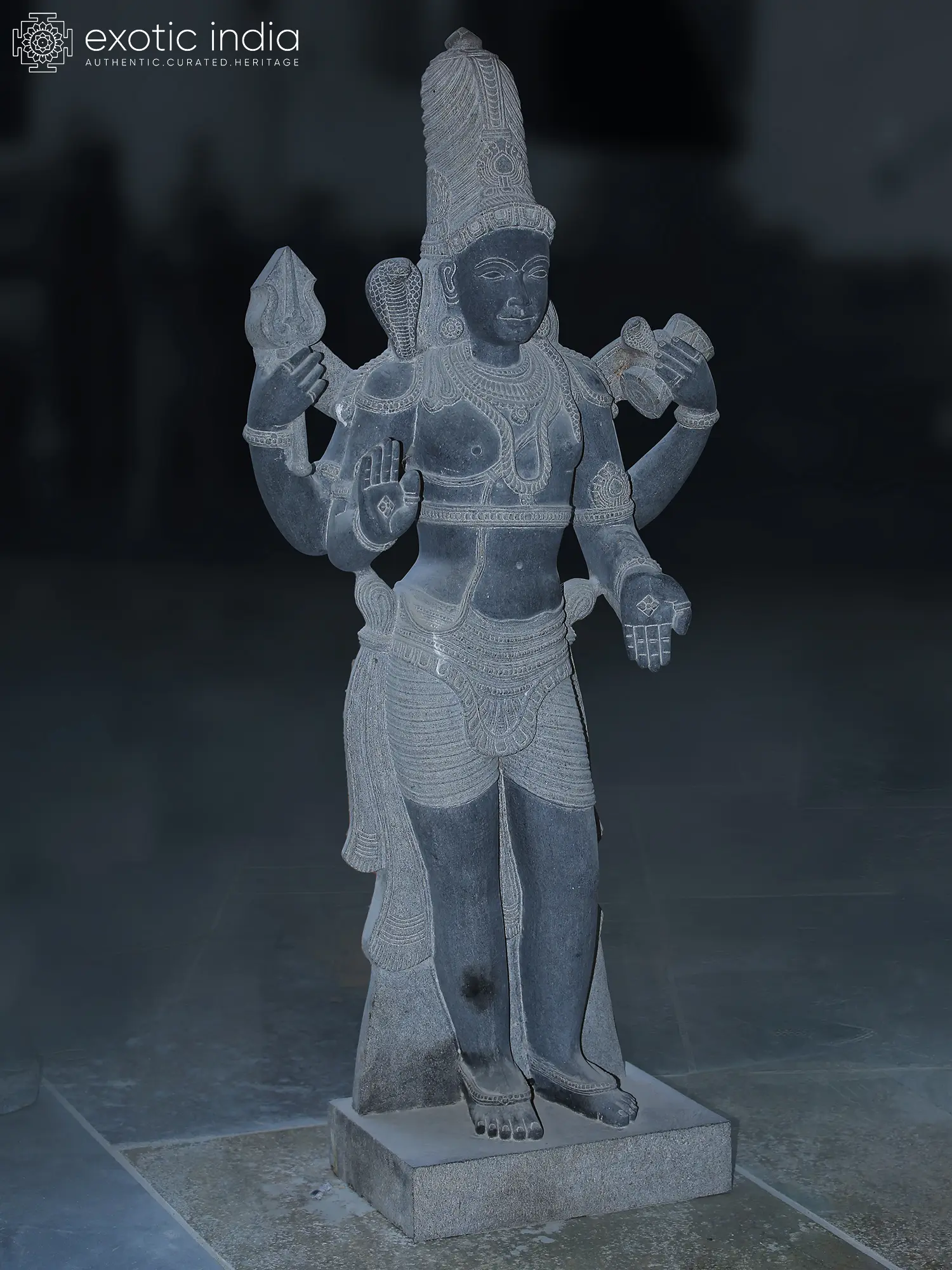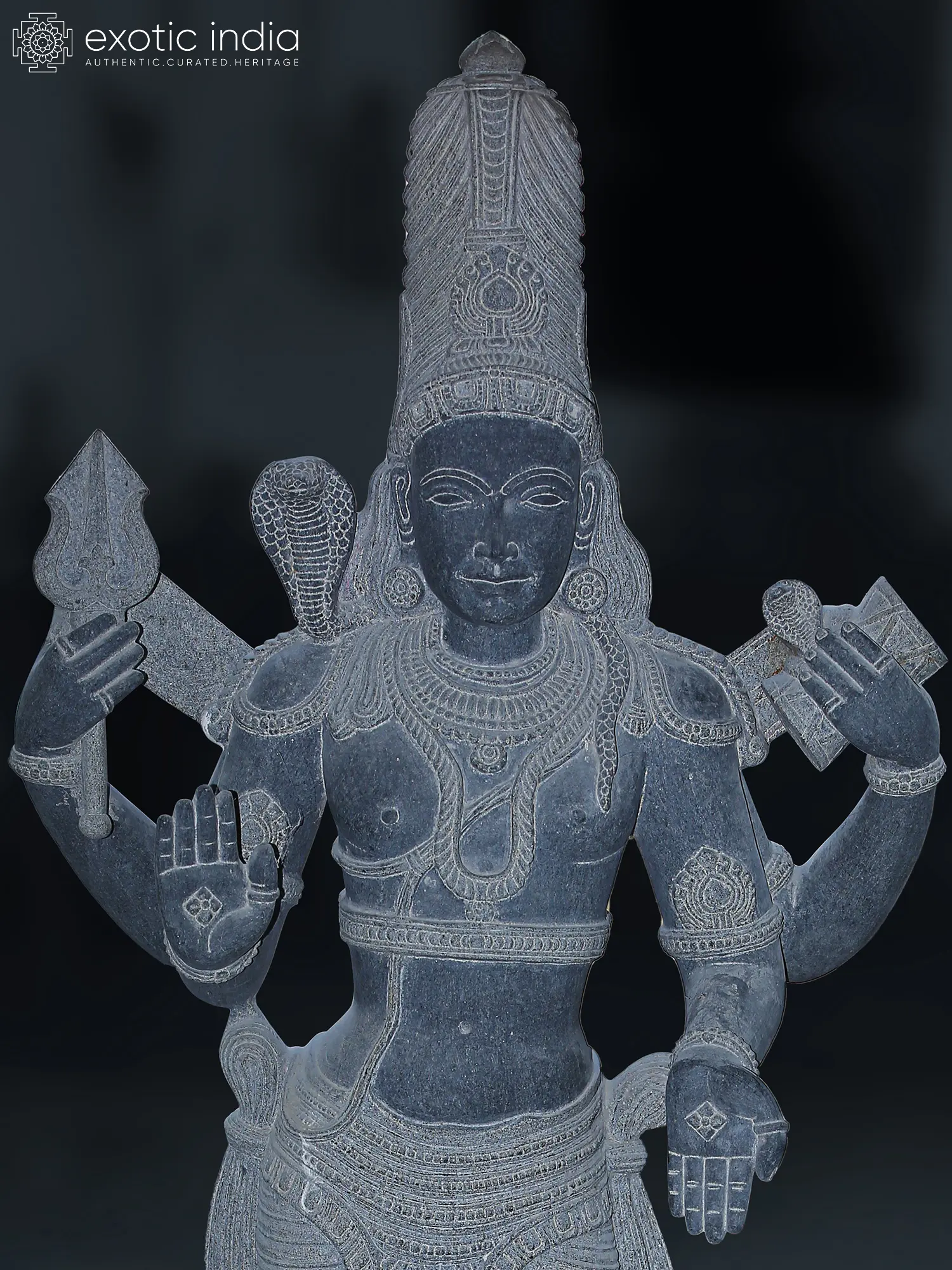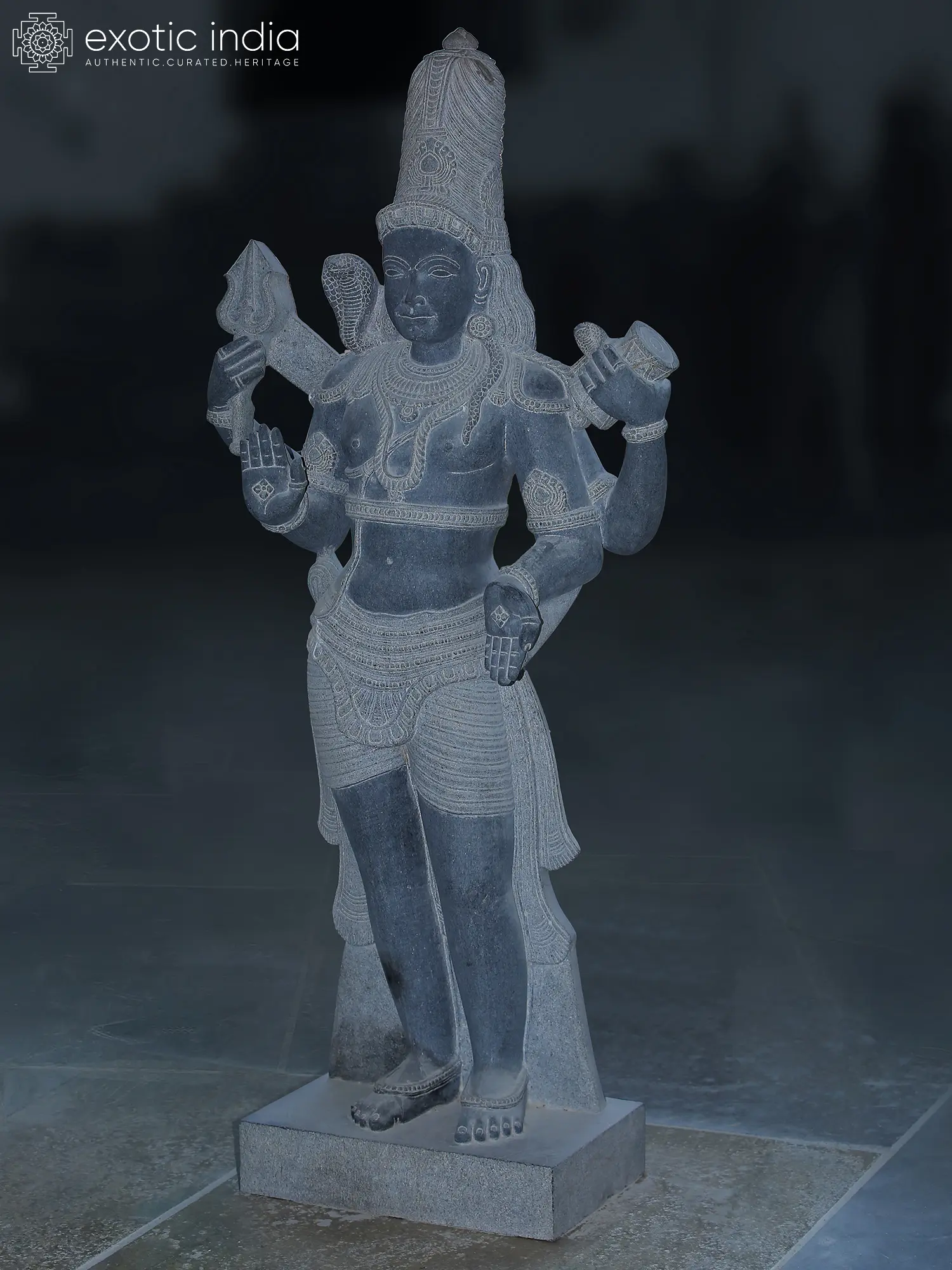 The iconography of Shiva in this 5-foot large granite artwork is inspired by his sacred sanctums, adorned with elaborate Jatabhara (hairdo with ornaments), with tresses flowing to frame his face.