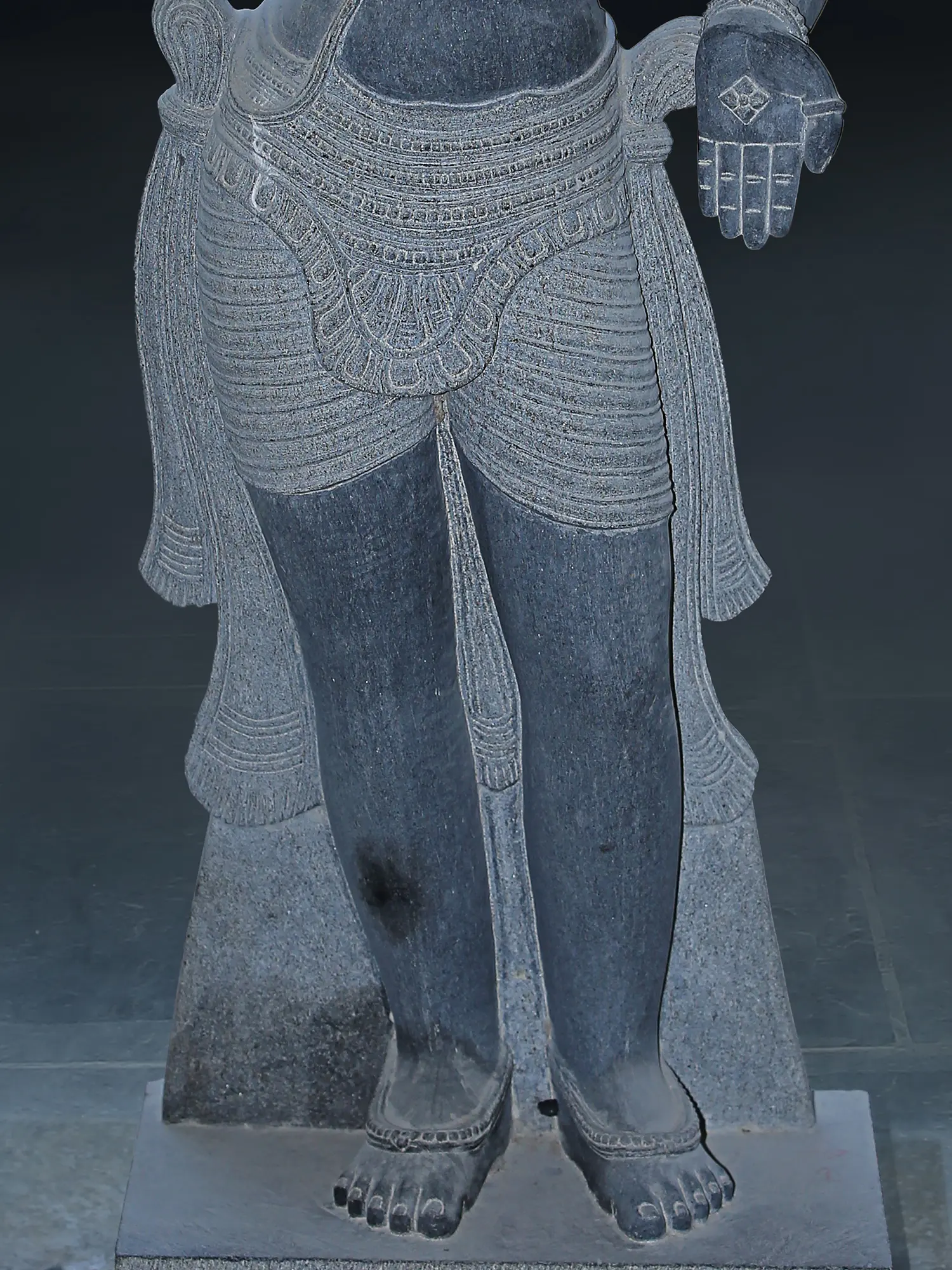 Earrings, necklaces, Yajnopavita, waist belts, armlets, and bracelets exquisitely ornament the Lord. He wears a short dhoti, with precise lines to delineate the fall of its tassels on each side, adding naturalism to the stone.