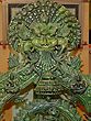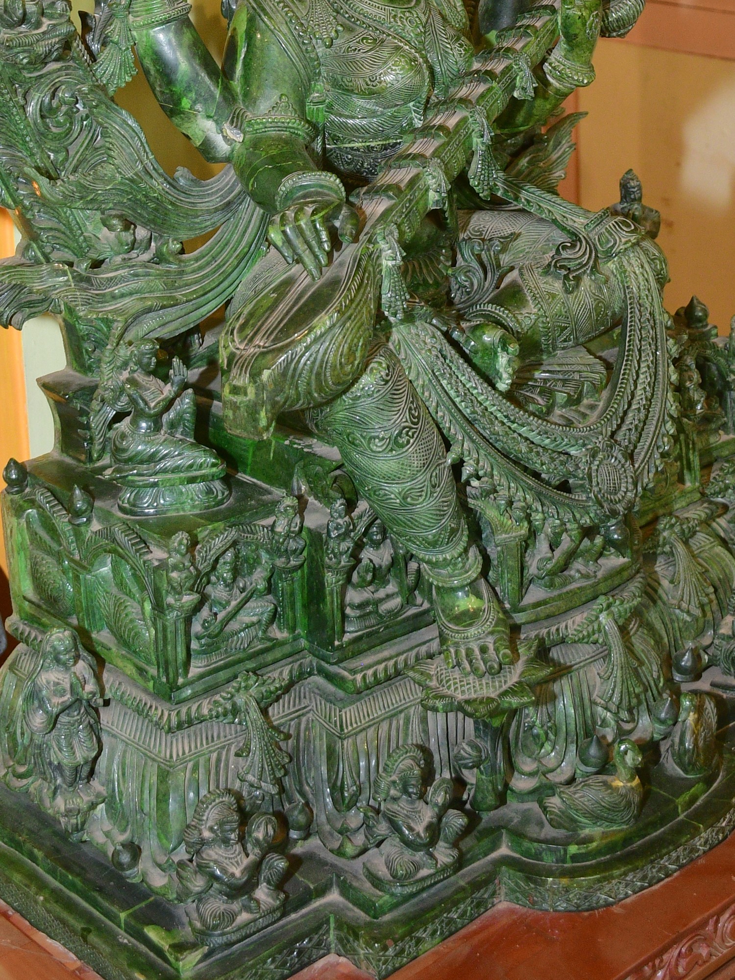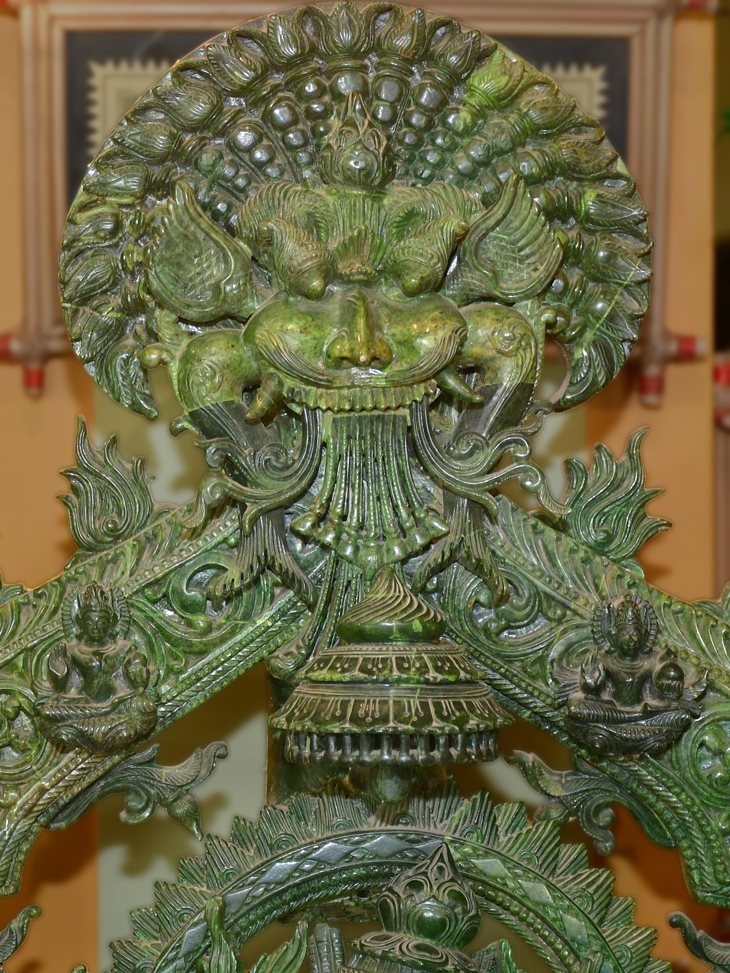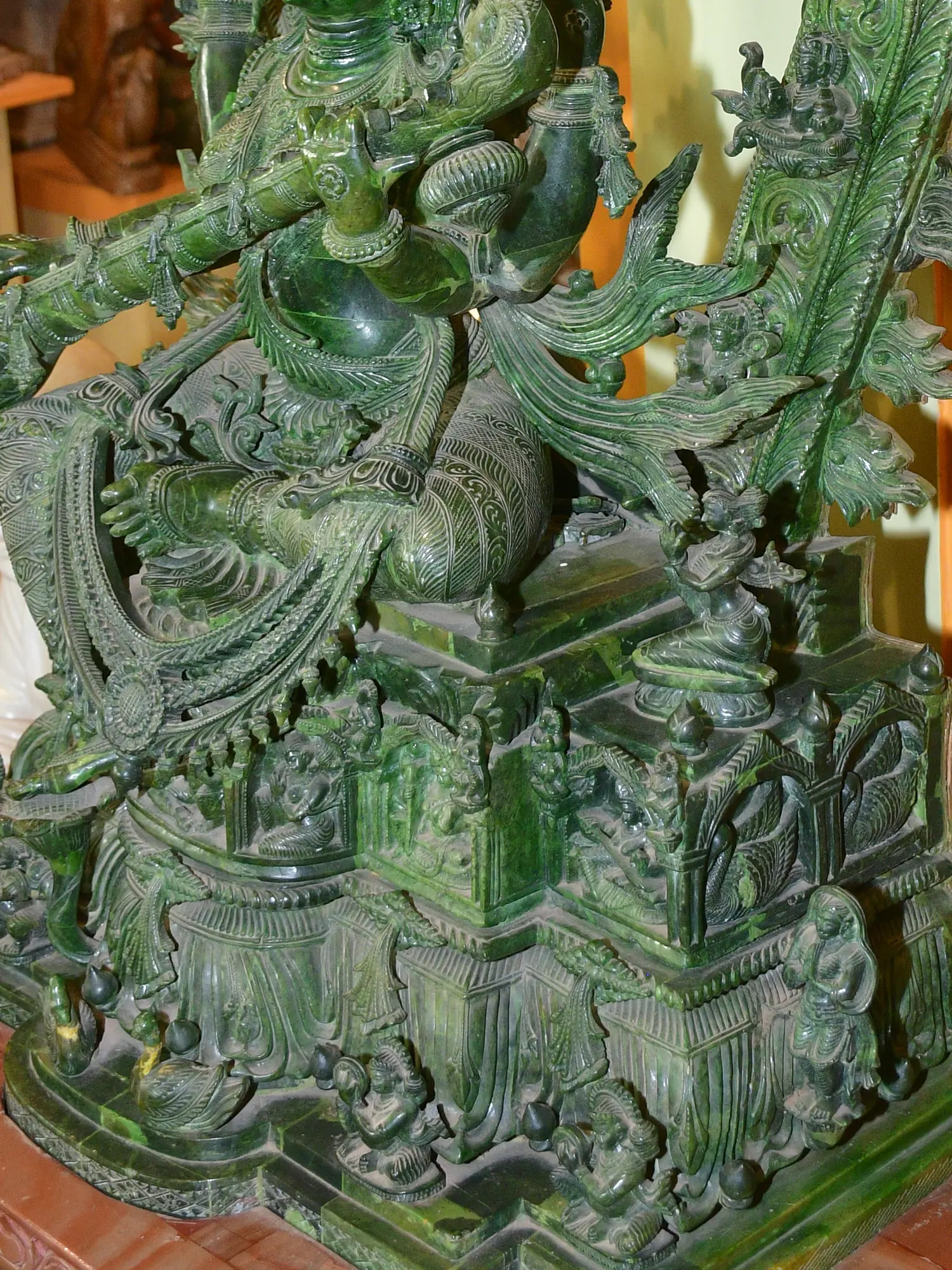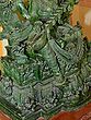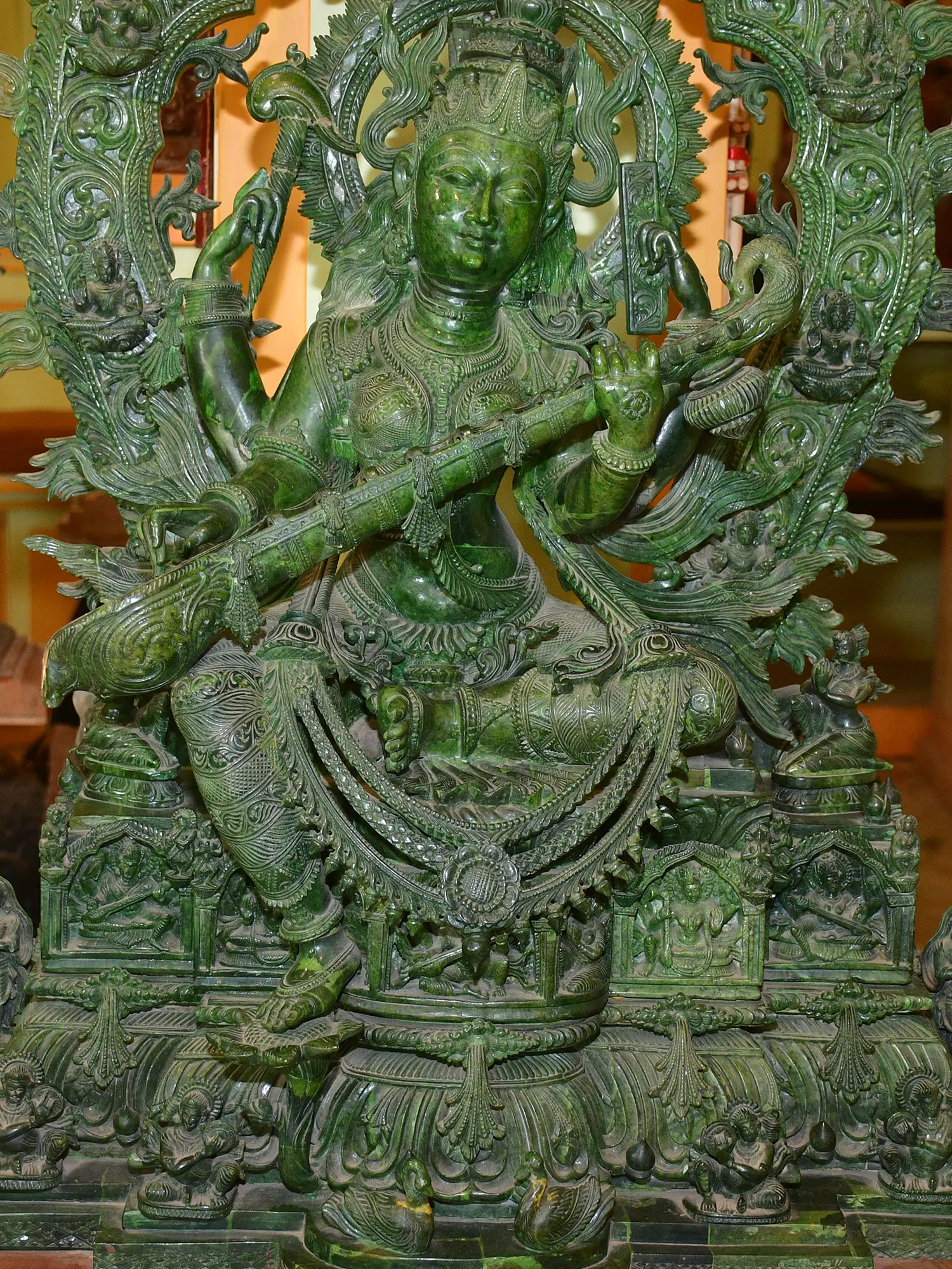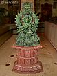 Carved from the finest Orissa stone, this statue is a testament to the rich artistic heritage of India. The artisans of Odisha have a long-standing tradition of stone carving, known for their intricate detailing and ability to bring life to static mediums. The deep, verdant hue of the stone lends an aura of ancient mystique to the sculpture, while the meticulous carving showcases the goddess's divine attributes. From the delicate folds of her garments to the serene expression on her face and the vibrant aura that surrounds her, every detail is rendered with exceptional skill and devotion. The statue stands proudly on a robust, intricately carved base, itself a work of art, enhancing its grandeur and presence.