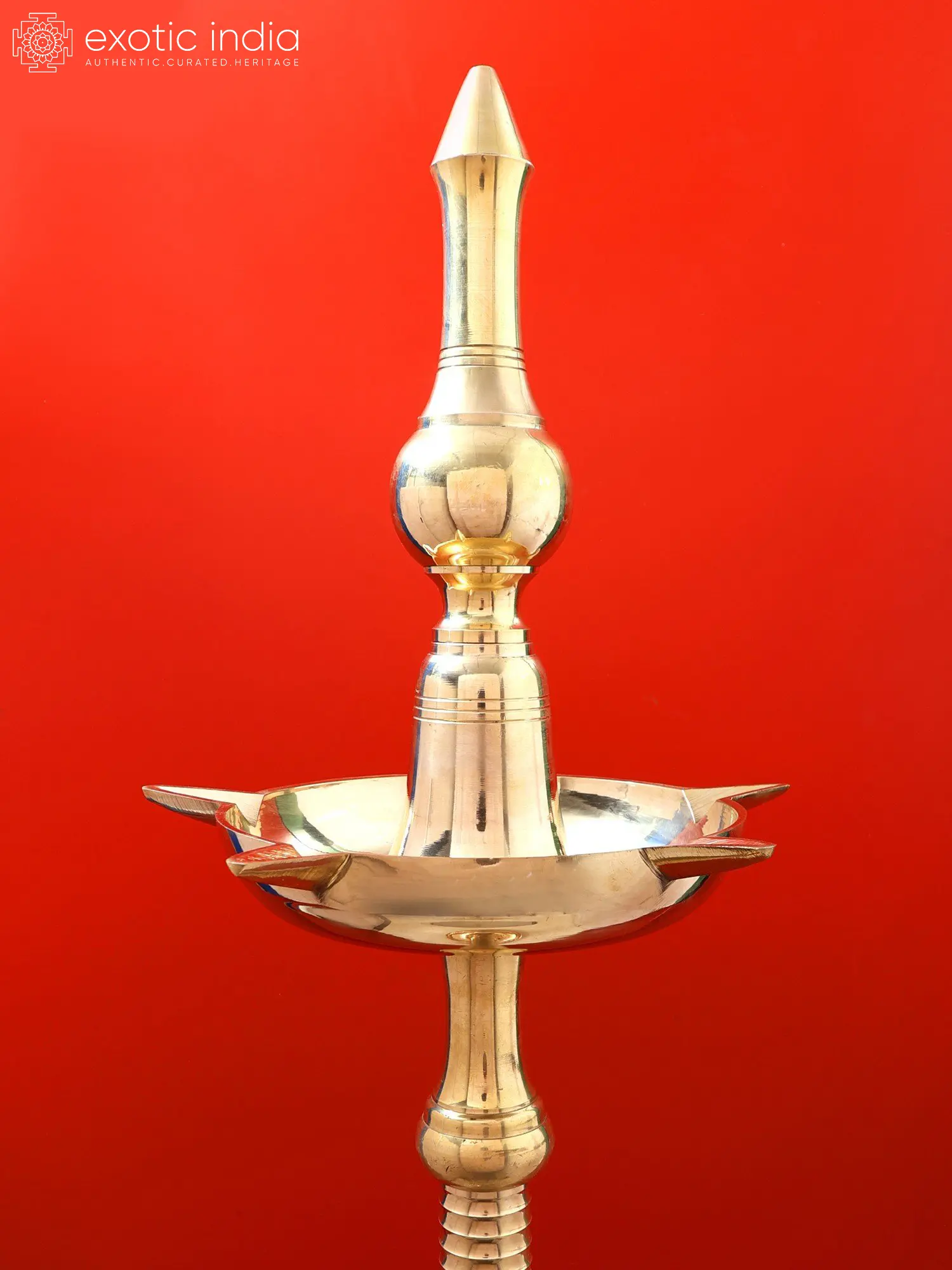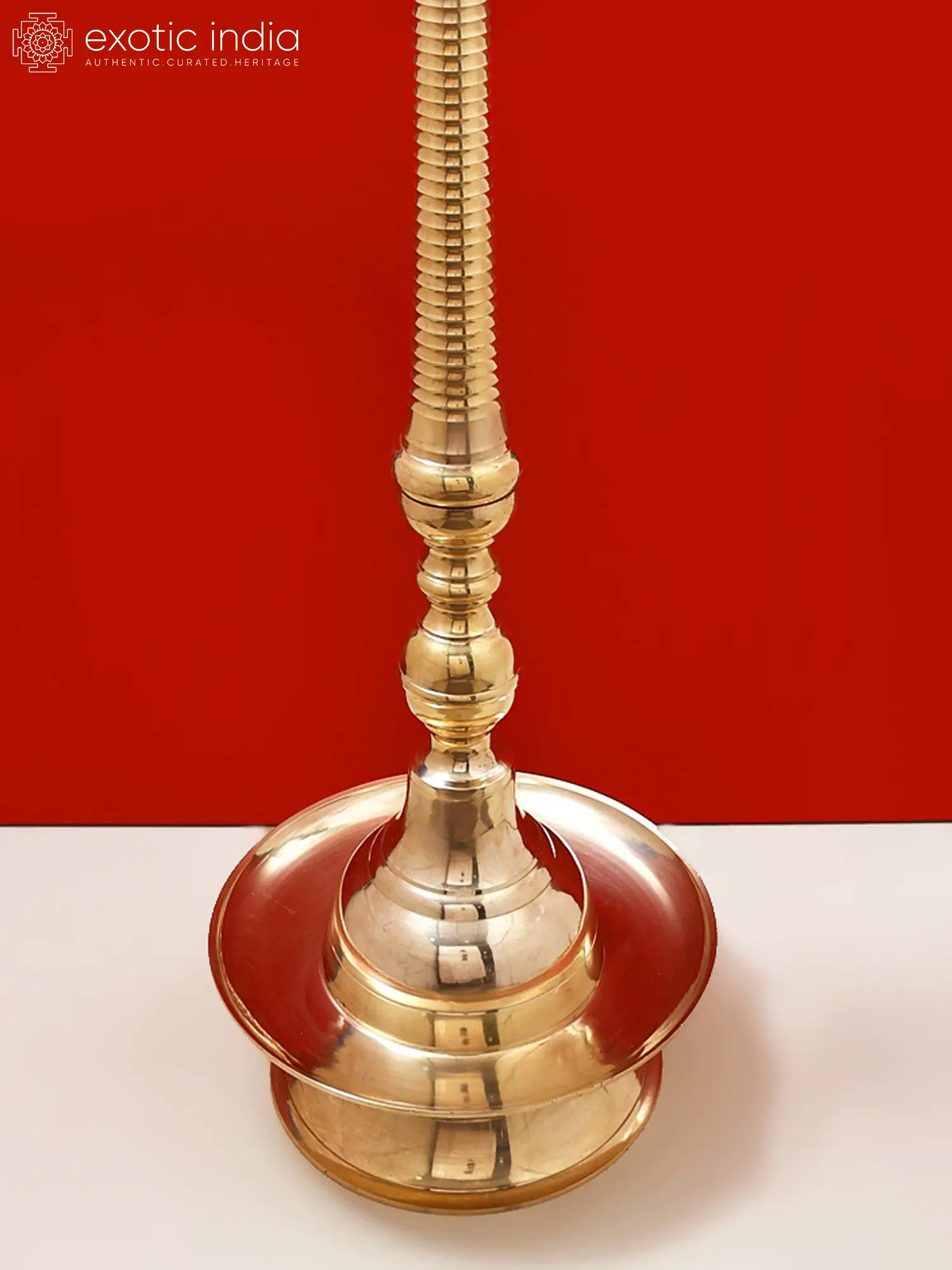 Rising like a sentinel of tradition, the Kathakali lamp also known as a Kavala lamp, stands tall. The simplicity and elegance of the lamp are a tribute to the age-old tradition of traditional lighting. A disc-shaped base is attached to the lamp to collect excess oil, a smart way to reuse the oil that seeps from the lamp. The disc-shaped stand also provides stability to the lamp. At its heart, a central oil basin houses a quintet of wicks, ready to weave tales with golden flames. Adorning the stem, a continuous ring structure dances, reflecting the lamp's essence of perpetuity. This luminary masterpiece embraces the past while illuminating the present, a beacon of culture and artistry.