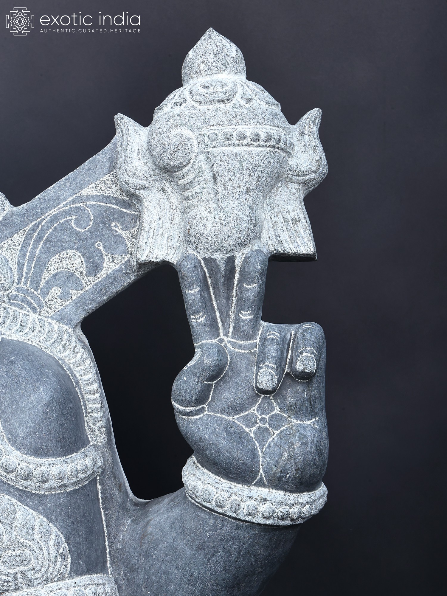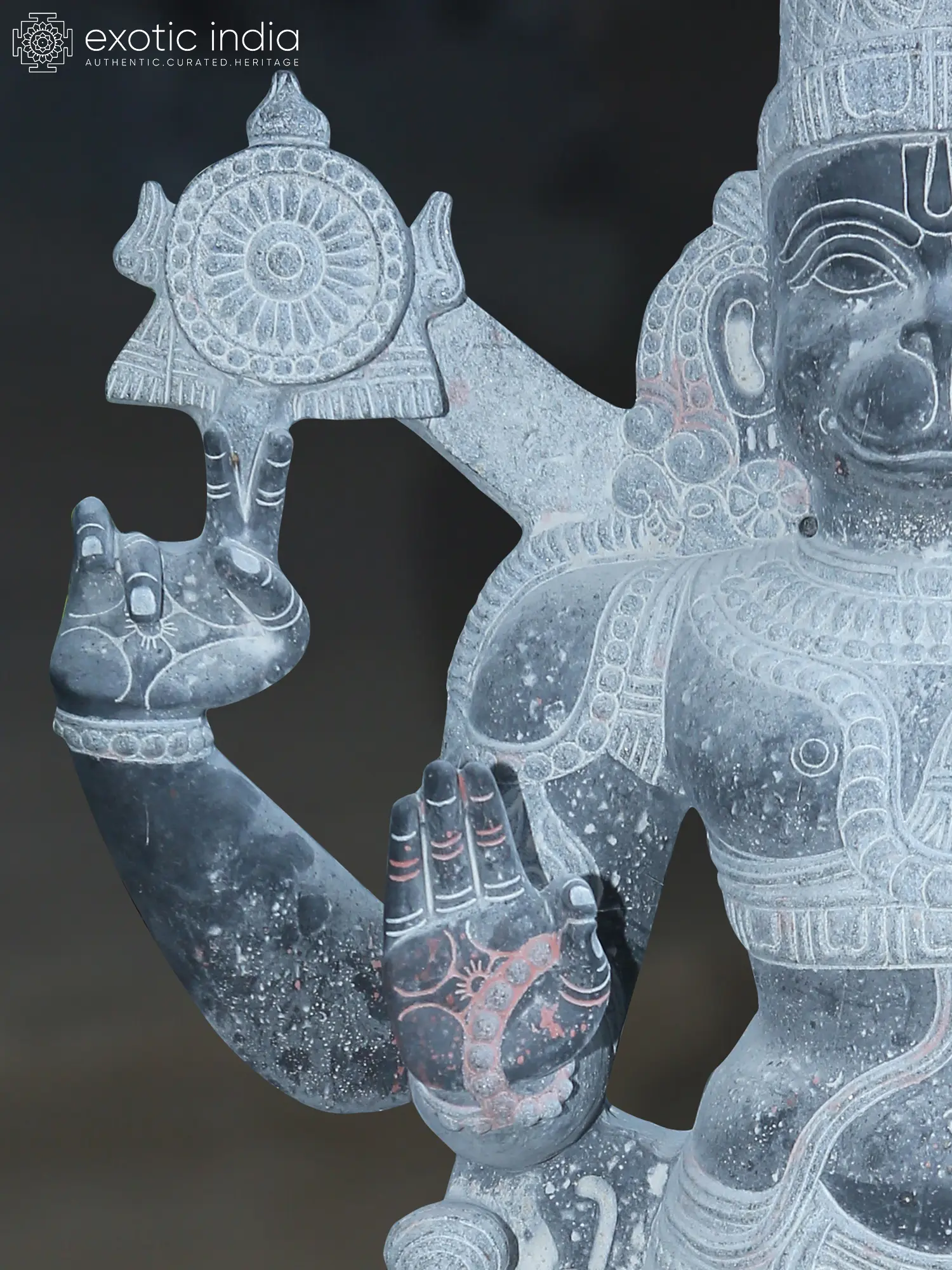 The statue depicts Hanuman with one hand uplifted in Abhaya Mudra (protective gesture), bestowing blessings and reassurance on believers.