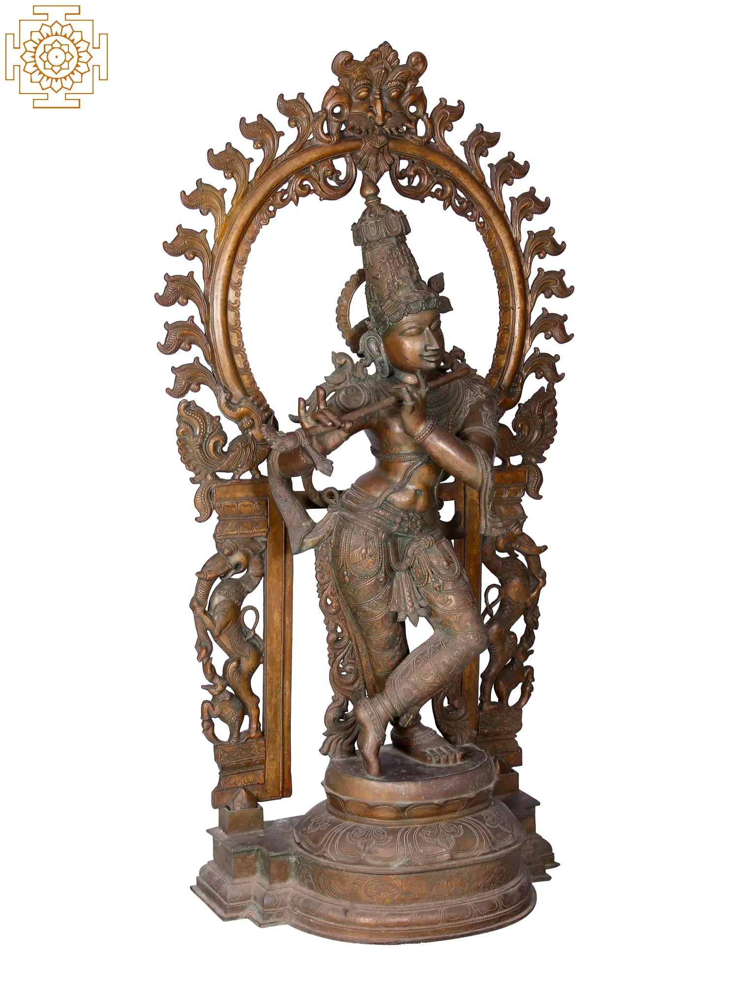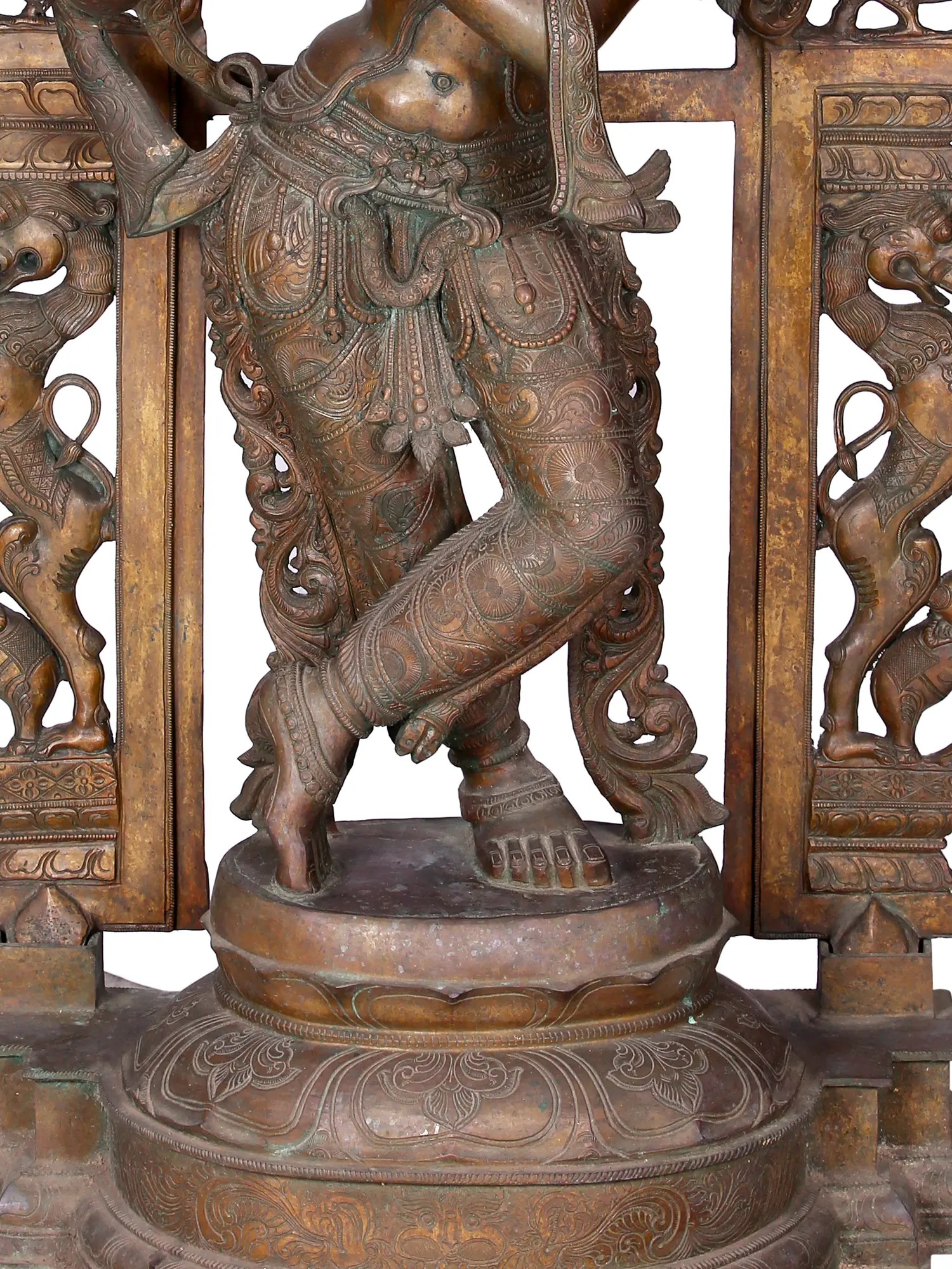From the many-tiered pedestal to the pillar-and-archway framing the tribhanga murari in the centre, this Krishna sculpture is a reproduction of traditional South Indian temple art. Its most striking aspect is that the Yali on each side is an amalgam of the three different types of Yali: ashvayali (hindquarters), gajayali (tusks), and simhayali (mane).