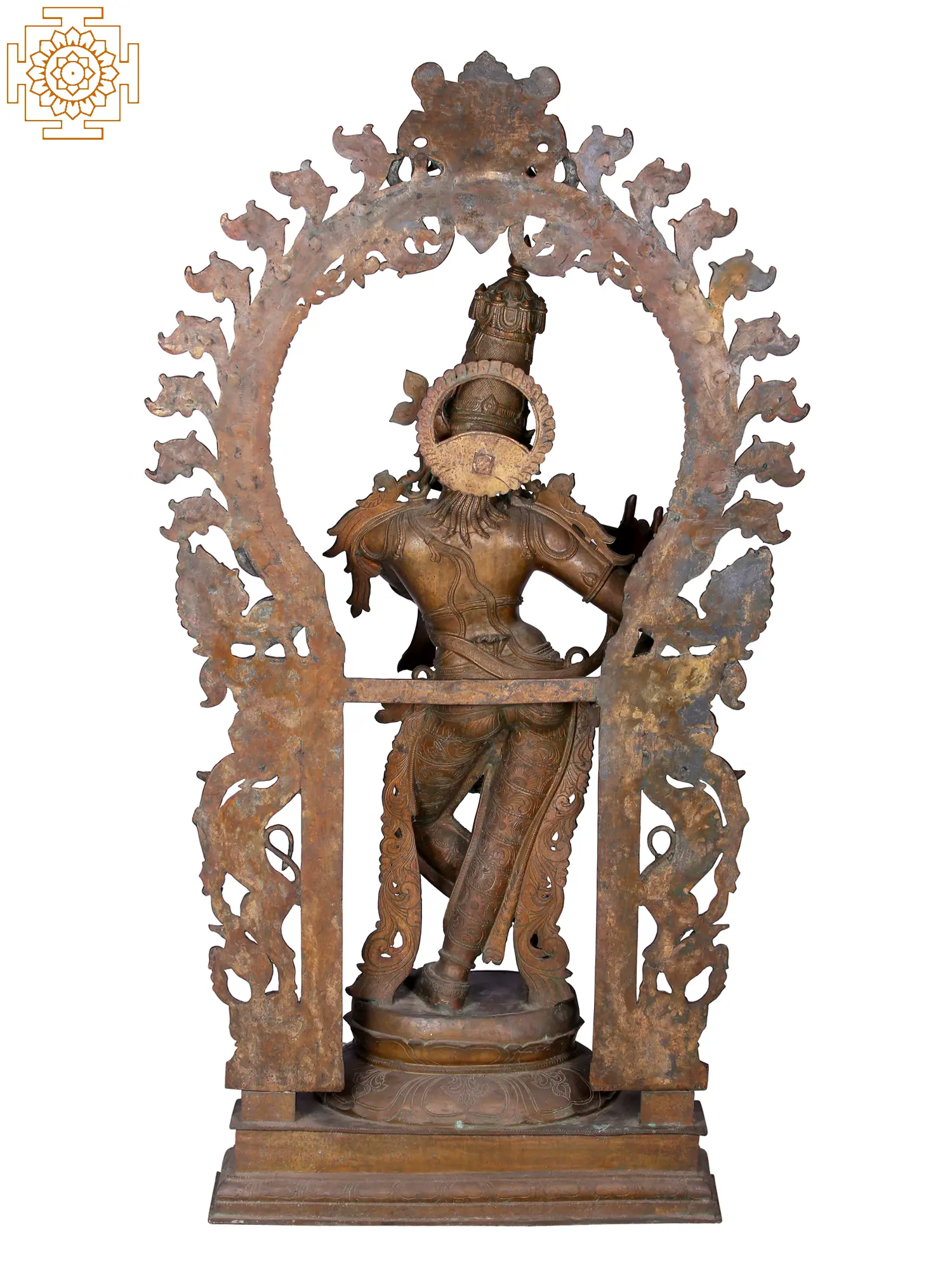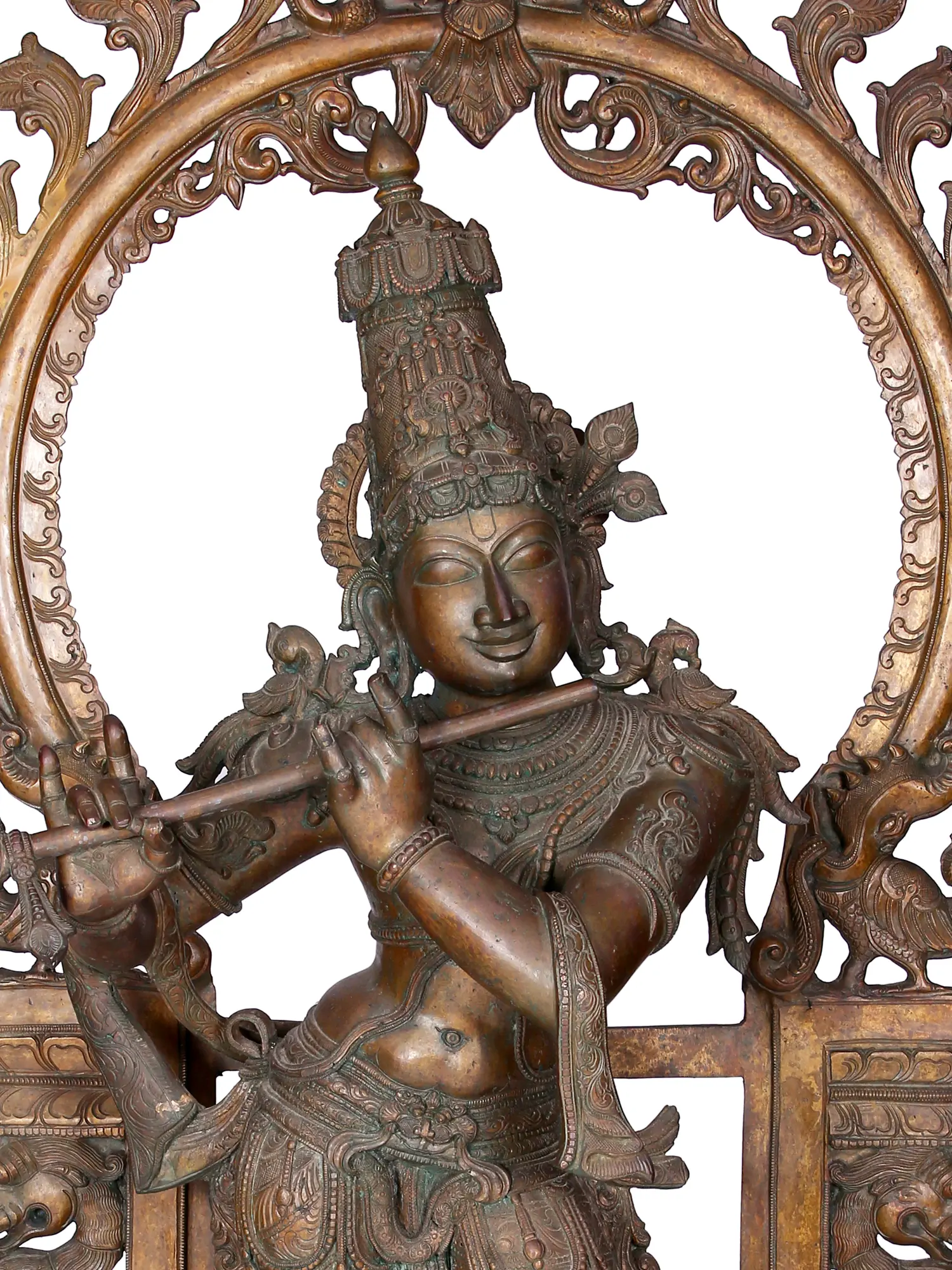 An incomparably complex bronze of the standing muralidhara Krishna. The handsome cowherd of Vrindavan is always depicted as possessed of (‘dhara’) the flute (‘murali’), with His form jutting out laterally (‘bhanga’) at three (‘tri’) different junctures in the tribhanga stance.