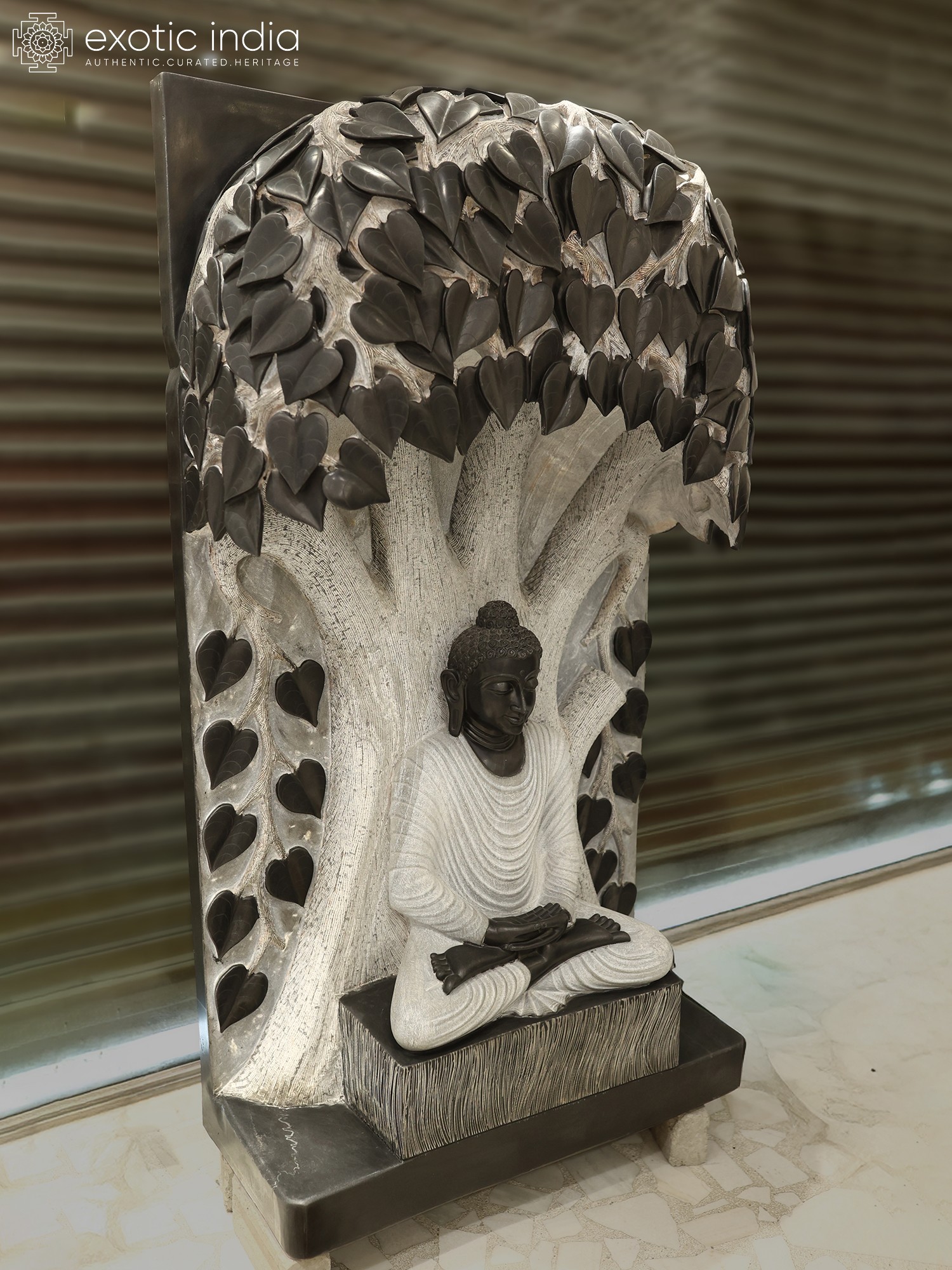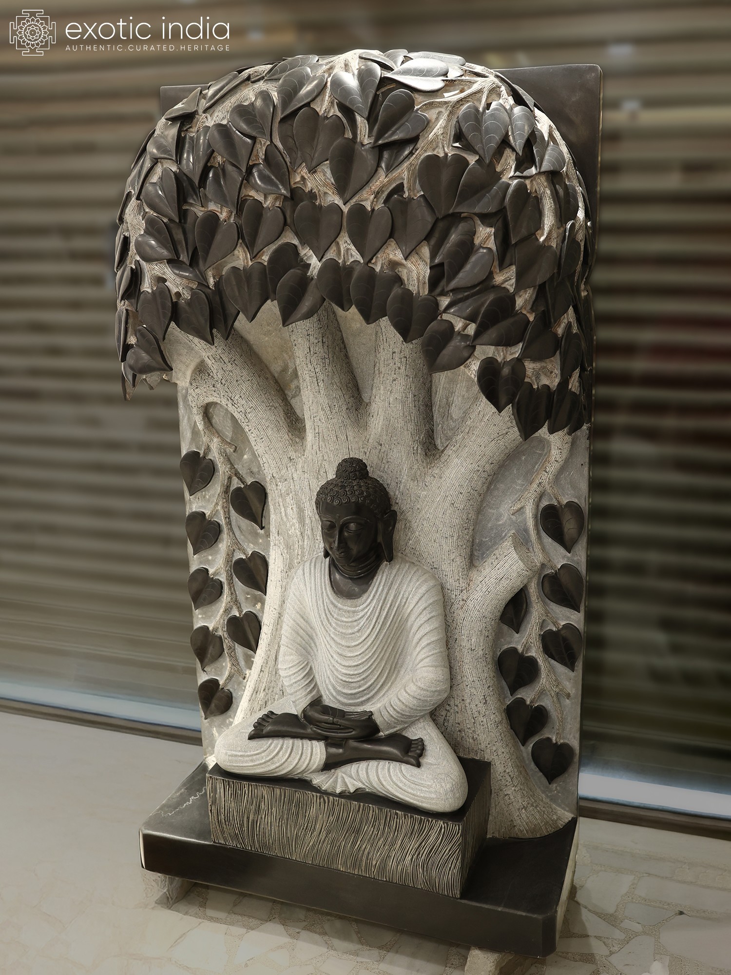 This magnificent sculpture captures a pivotal moment in spiritual history, depicting Lord Buddha in a serene meditation pose beneath the sacred Bodhi tree. Crafted from natural marble, the artwork embodies a profound sense of peace and timeless wisdom. The artist has masterfully rendered the delicate folds of Buddha's robes, the tranquil expression on his face, and the intricate details of the tree, creating a harmonious and deeply moving composition. The contrast between the lighter tones of the tree trunk and the darker, more defined leaves adds visual depth and a sense of naturalistic beauty to this spiritual tableau.