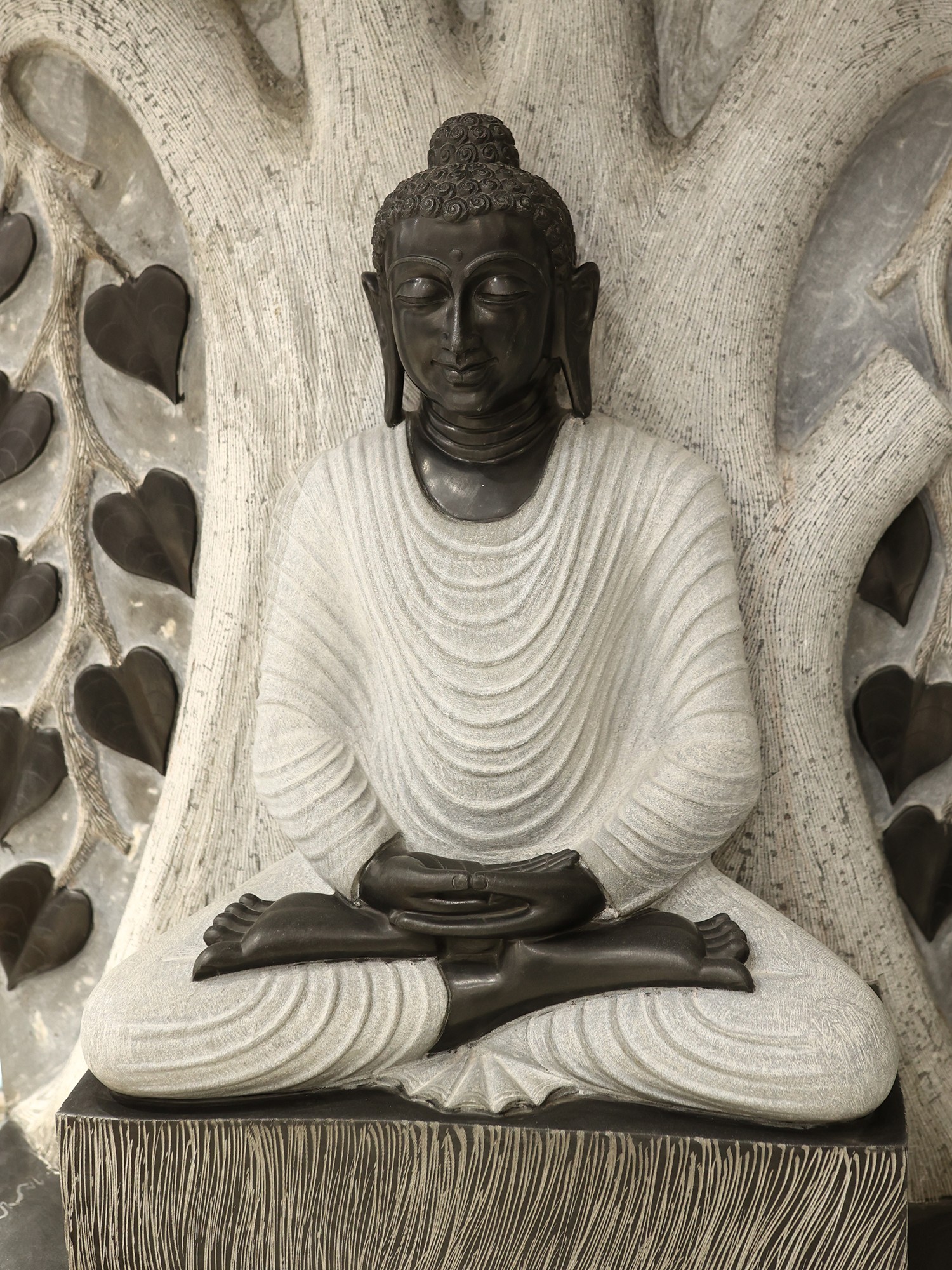 This sculpture transcends traditional religious art, offering a modern interpretation that speaks to contemporary sensibilities. The inherent beauty of natural marble, with its subtle variations in color and texture, is brought to life through meticulous carving. The artist’s ability to convey such profound stillness and spiritual presence through a solid medium is a testament to their skill and artistic vision. The scale of the piece allows it to become a focal point in any setting, inviting viewers to pause, reflect, and connect with the universal message of peace and enlightenment embodied by Lord Buddha. The layered leaves of the Bodhi tree, individually sculpted and arranged, create a canopy of profound symbolism, suggesting protection, growth, and the encompassing nature of wisdom. The base on which the Buddha sits is textured to resemble a woven mat, a detail that adds to the overall tactile richness of the sculpture. This is more than just a statue; it is a statement of enduring faith and a celebration of the highest human potential.