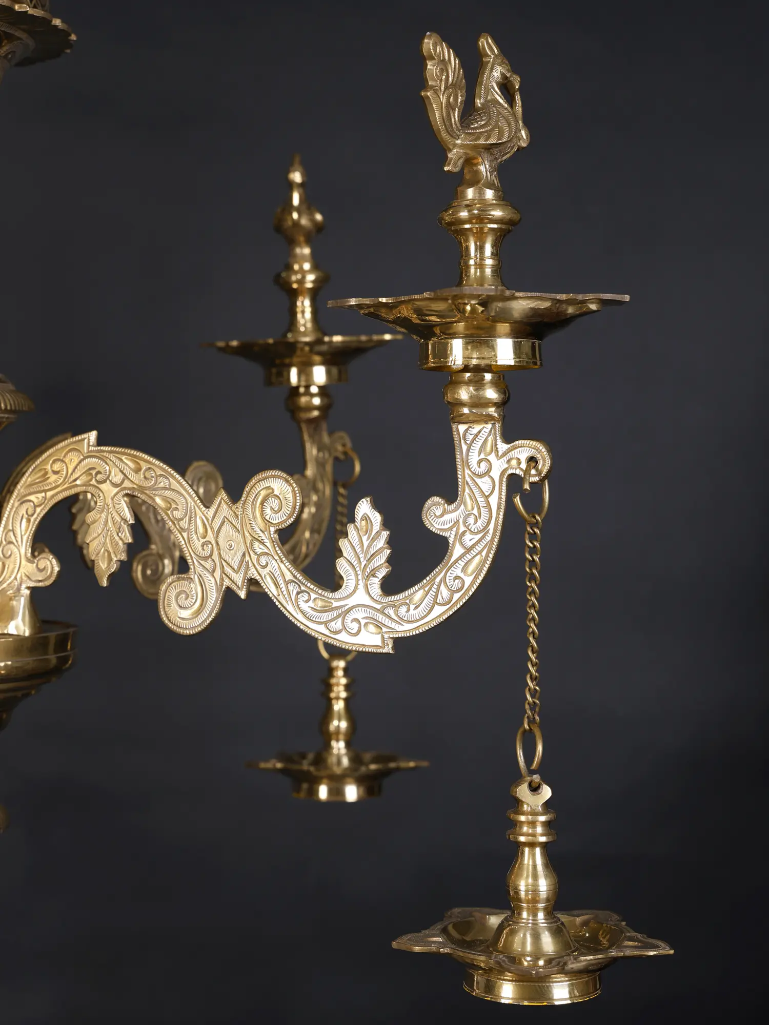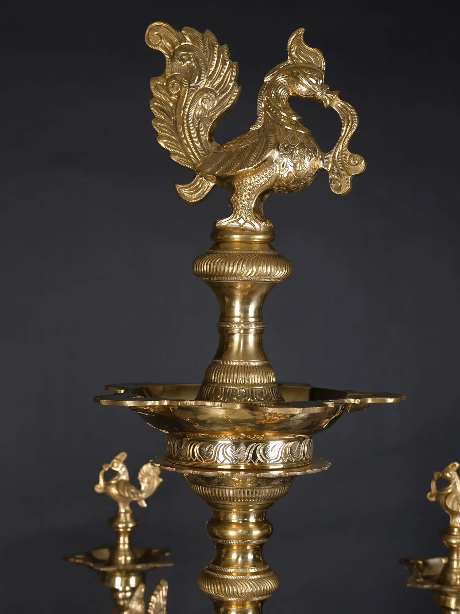 As you light this lamp, the peacock motifs come to life, casting graceful shadows in the soft glow. It is a symbol of grace, beauty, and devotion.