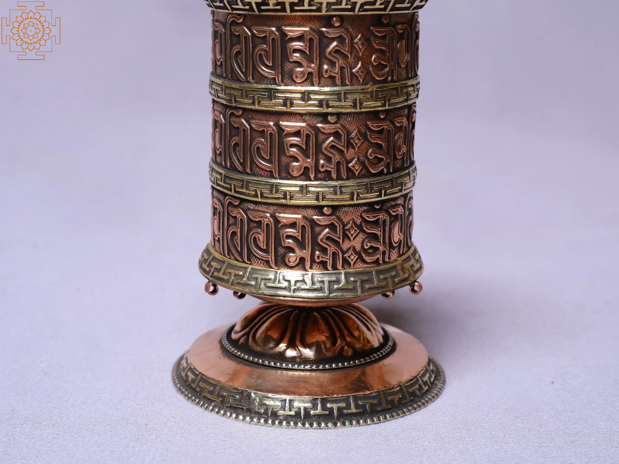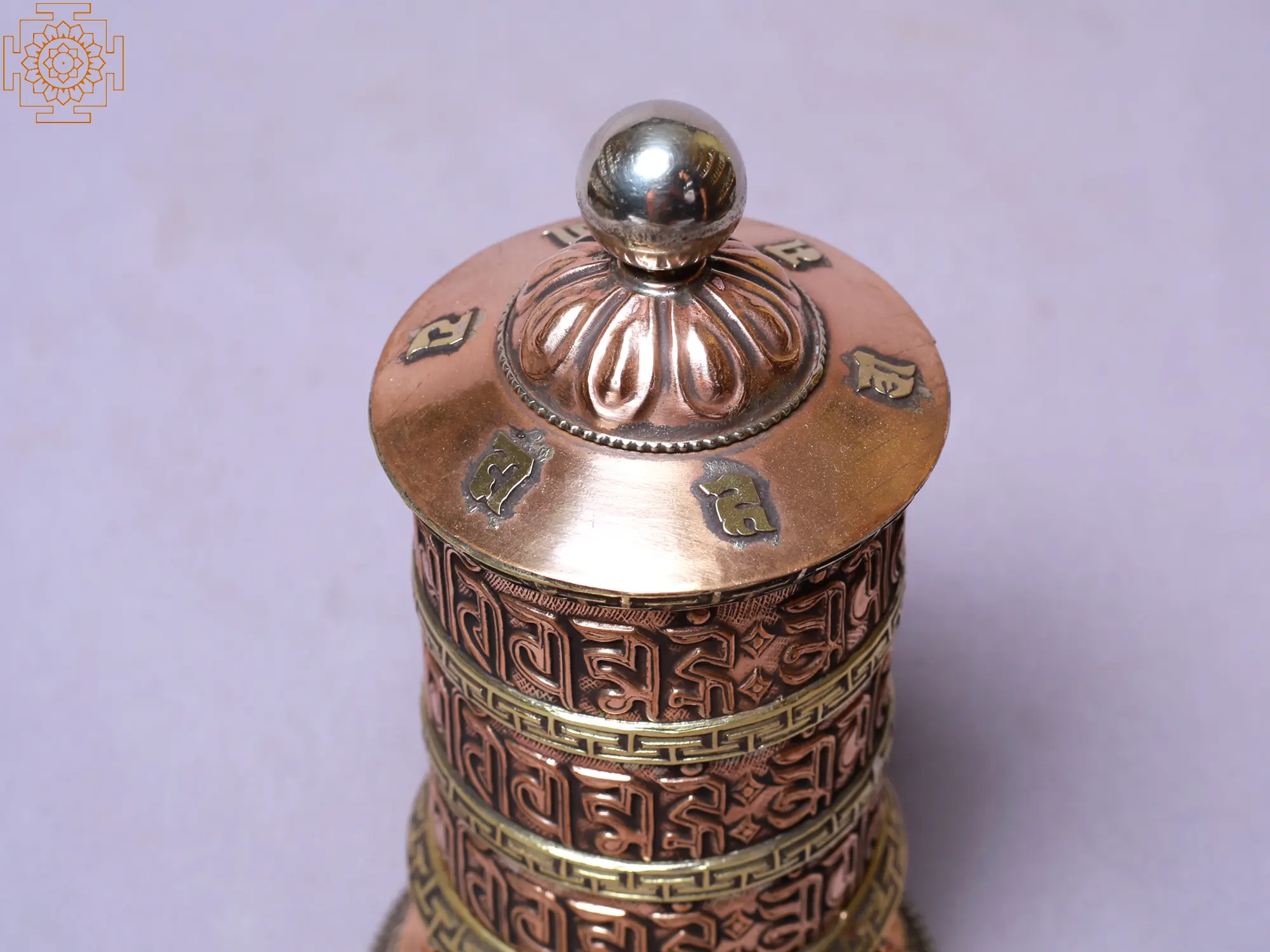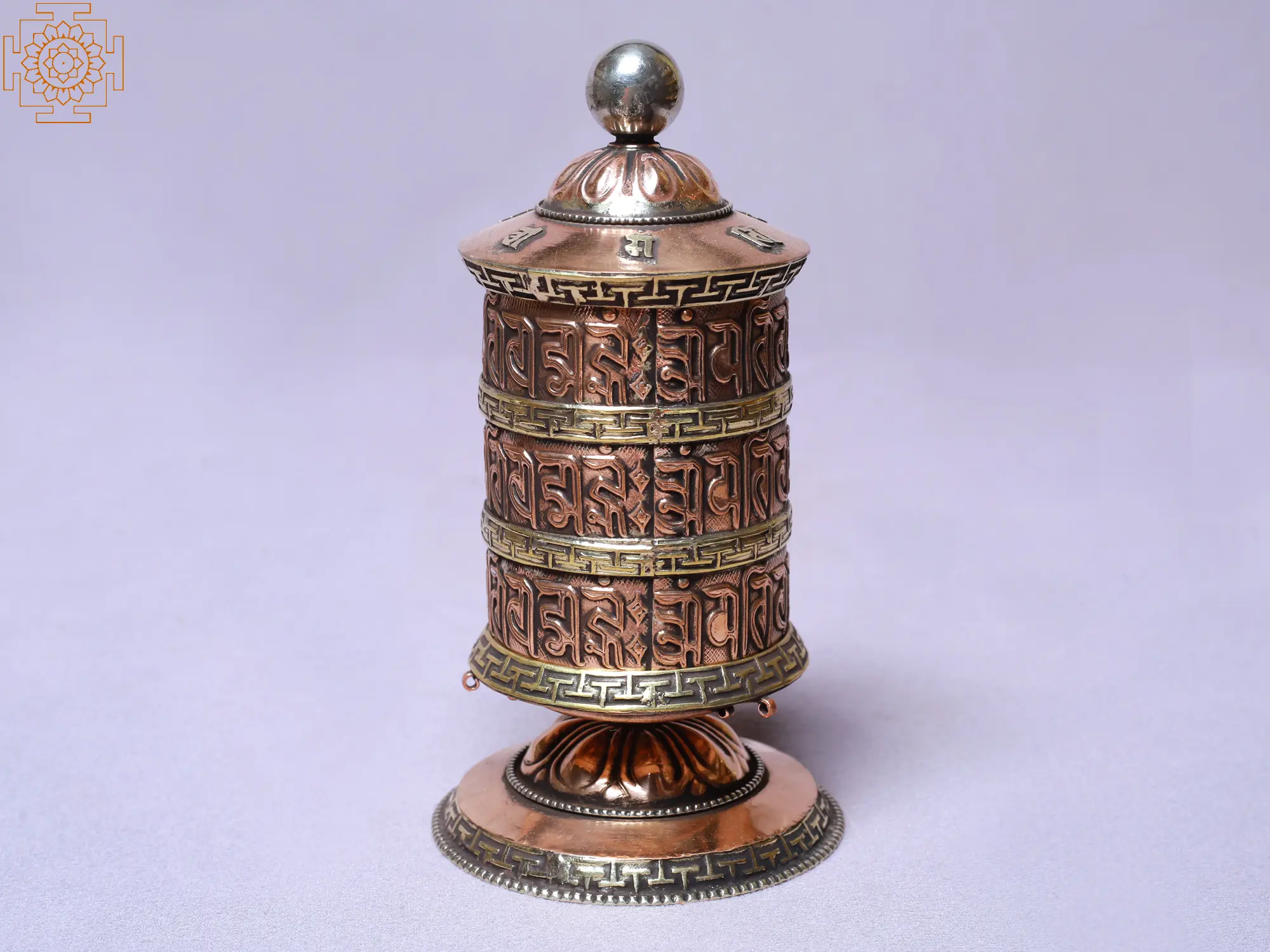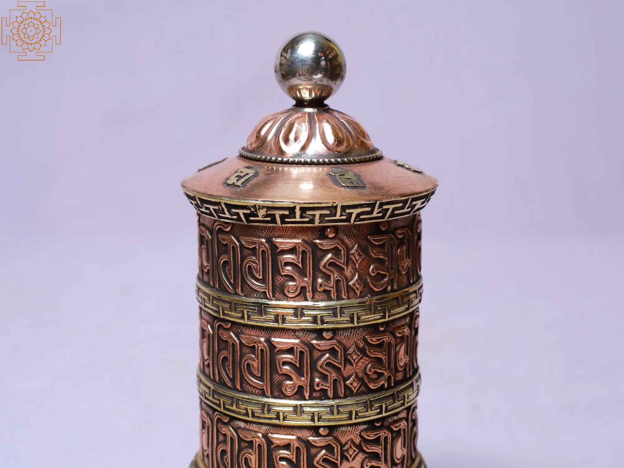The choice of copper for this prayer wheel is not accidental. In many cultures, copper is considered a sacred metal, believed to possess potent energetic properties. Its warm tone and malleability make it suitable for intricate detailing, allowing the mantras and symbolic borders to be rendered with exquisite precision. Additionally, copper is believed to be a conductor of energy, acting as a channel for the positive vibrations generated by the spinning of the wheel. This enhances the spiritual potency of the object, acting as a conduit for spiritual energy to flow and radiate outwards.