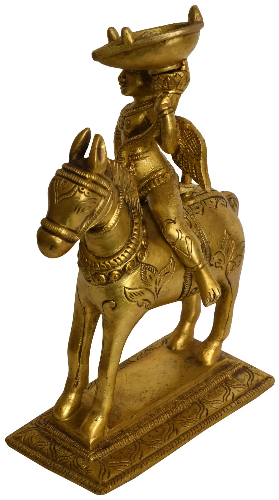 Crafted from gleaming brass, this exquisite lamp depicts a celestial being, often interpreted as an angel or a divine messenger, poised gracefully atop a majestic horse. The artistry of Indian craftsmanship shines through every detail, from the intricate ornamentation adorning the horse's tack and the rider's attire to the serene yet powerful expression on the rider's face. This is more than just a decorative item; it is a vessel of light and tradition, designed to bring a sacred ambiance to your home or puja space. ––––––––––