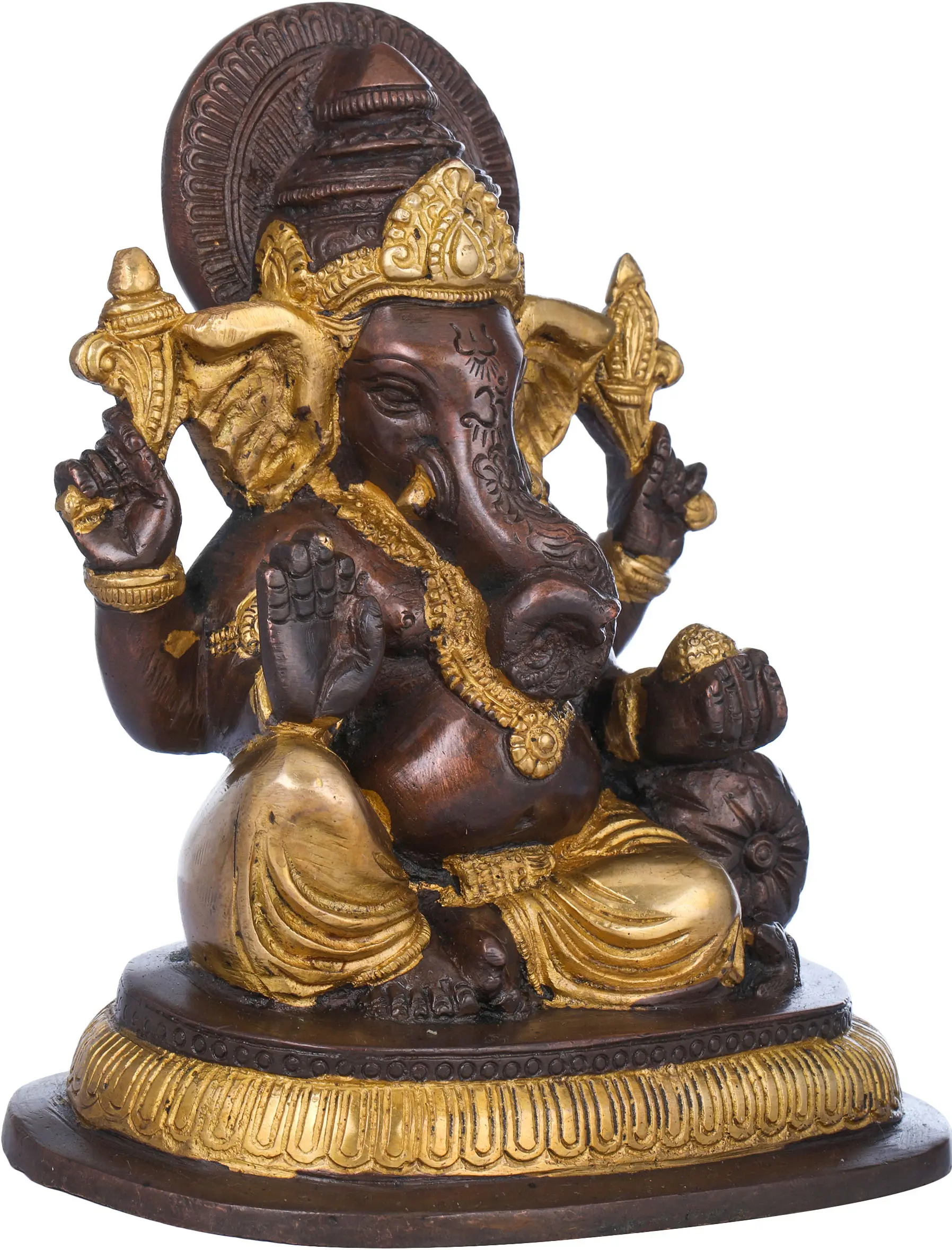 Invoke blessings and prosperity into your home or sacred space with this exquisite brass statue of Lord Ganesha. Handmade with meticulous care in India, this piece embodies the rich artistic traditions and spiritual depth of the subcontinent. Lord Ganesha, the beloved elephant-headed deity, is revered as the god of wisdom, intellect, and the remover of obstacles. He is invoked at the beginning of all important ceremonies, undertakings, and rituals, ensuring success and auspicious beginnings. The craftsmanship of this statue is truly remarkable. The lustrous brass has been artfully patinated, creating a captivating blend of warm golden hues and antique verdigris, highlighting the intricate details of Ganesha's divine form. His gentle, wise face, adorned with traditional motifs, conveys a sense of serene power. His trunk, delicately curved, and his large ears, said to hear all prayers, are rendered with lifelike precision. The multiple arms, each holding symbolic objects such as an axe, a noose, and a sweet, represent his multifaceted powers and his ability to guide devotees through challenges. The overall pose, seated in a posture of peaceful meditation, emanates an aura of tranquility and divine grace.