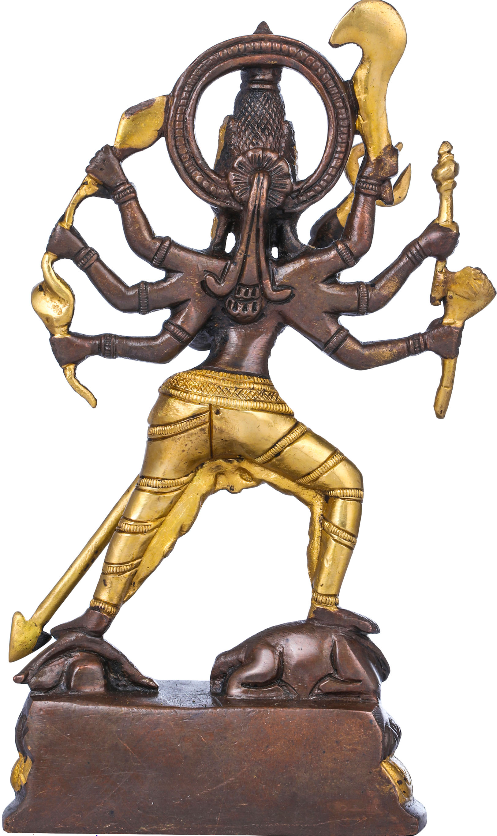 Devi Durga has no equal in the Indian pantheon, neither among the devis nor the devas themselves. She is of superlative beauty and ferocity; invincible; born to destroy the greatest of the adharmees, Mahisasura. This explains the presence of the syllables, Mahisasura Mardini (slayer of Mahisasura), in Her sahasranama. This work of art in brass captures the Ashtabhujadhari Durga in all Her strength and divine vigour.