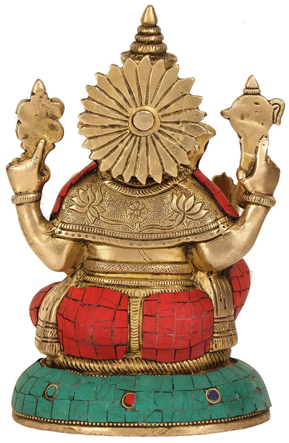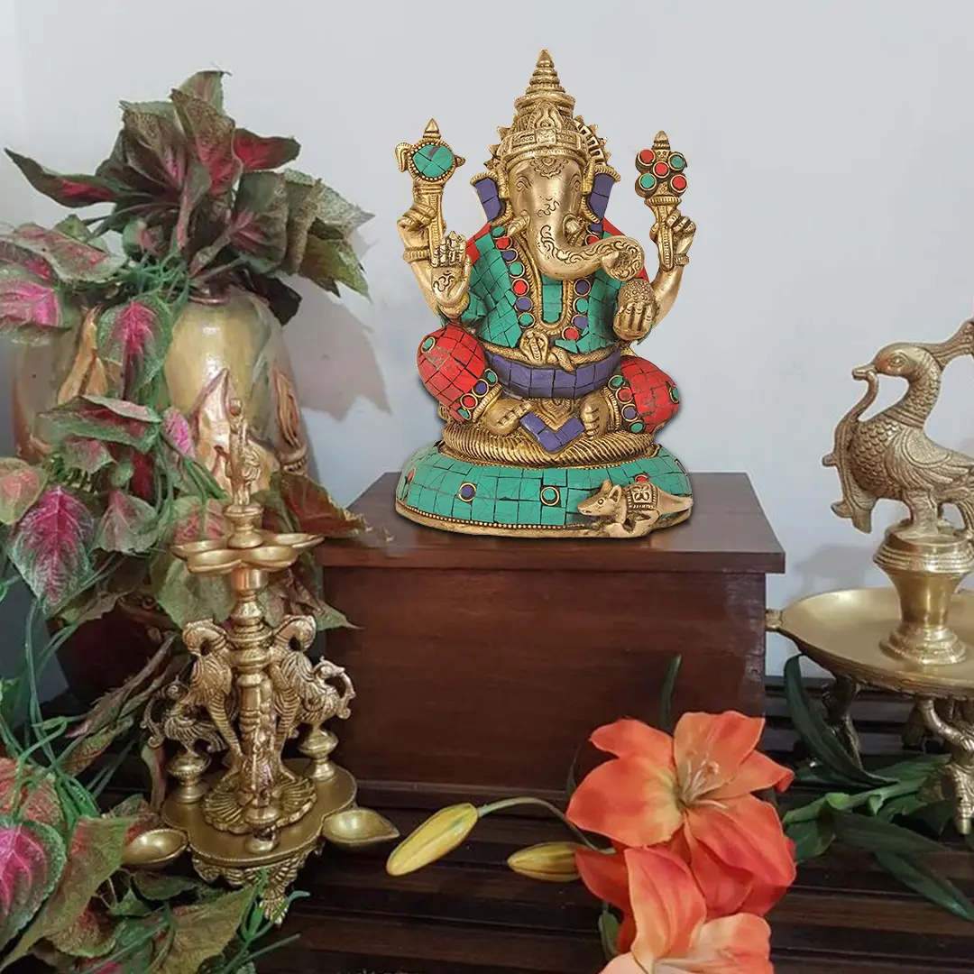 What truly sets this magnificent Ganesha statue apart is its opulent inlay work. Vibrant hues of turquoise, red, and deep blue gemstones are meticulously set into the brass, creating a captivating mosaic that adorns Ganesha's attire and the base. The turquoise, often associated with protection, healing, and communication, adds a touch of the celestial and calming. The rich red stones symbolize vitality, passion, and strength, while the deep blue elements represent wisdom, intuition, and the vastness of the cosmos. This harmonious blend of colors and textures not only enhances the visual appeal of the statue but also imbues it with symbolic meanings that resonate deeply within Hindu philosophy. Each gemstone placement is a deliberate stroke of artistry, transforming the brass into a dazzling representation of divine abundance and cosmic order.