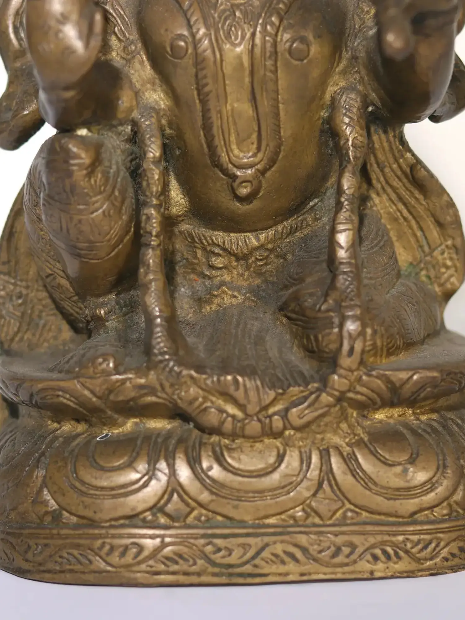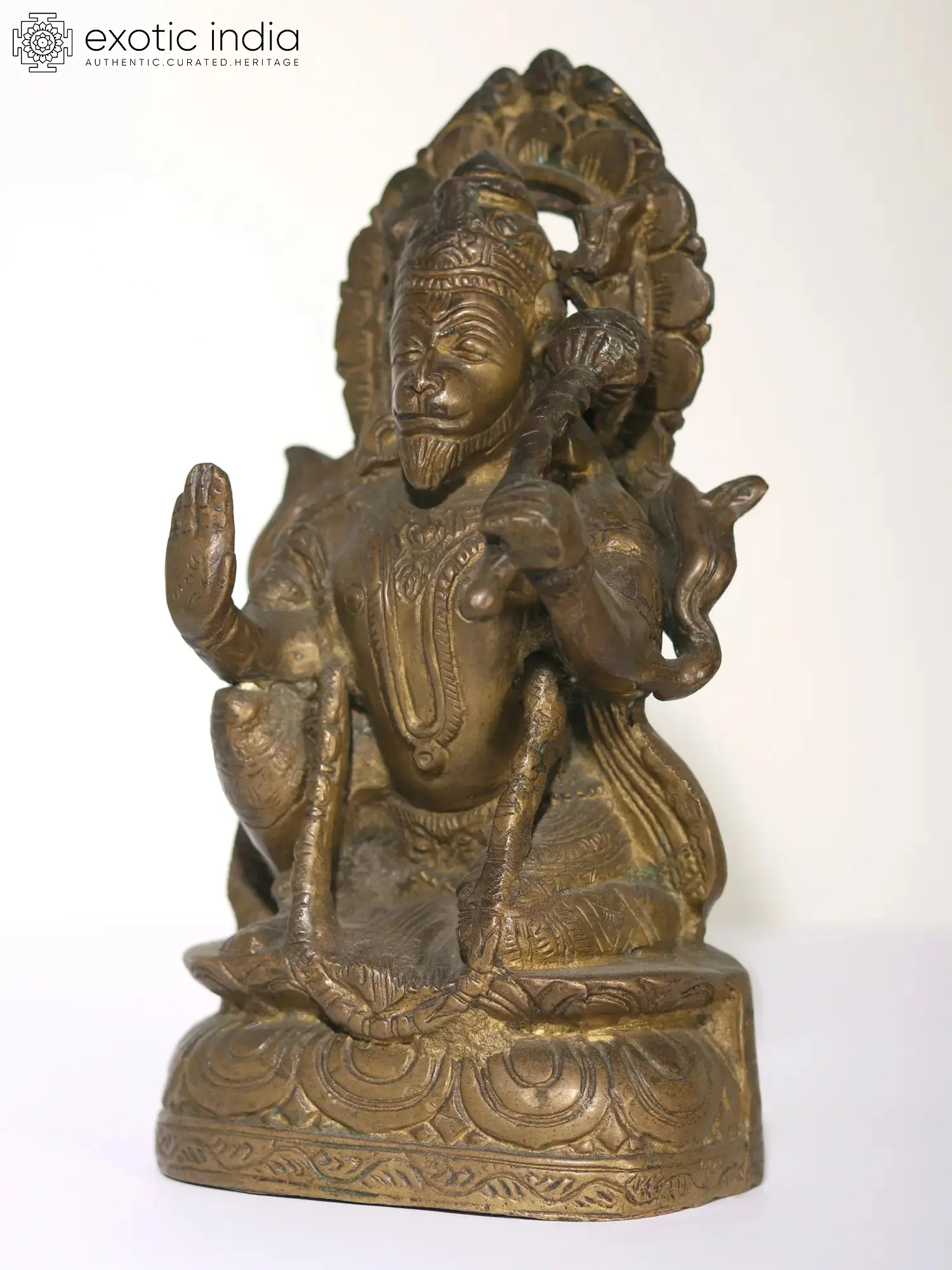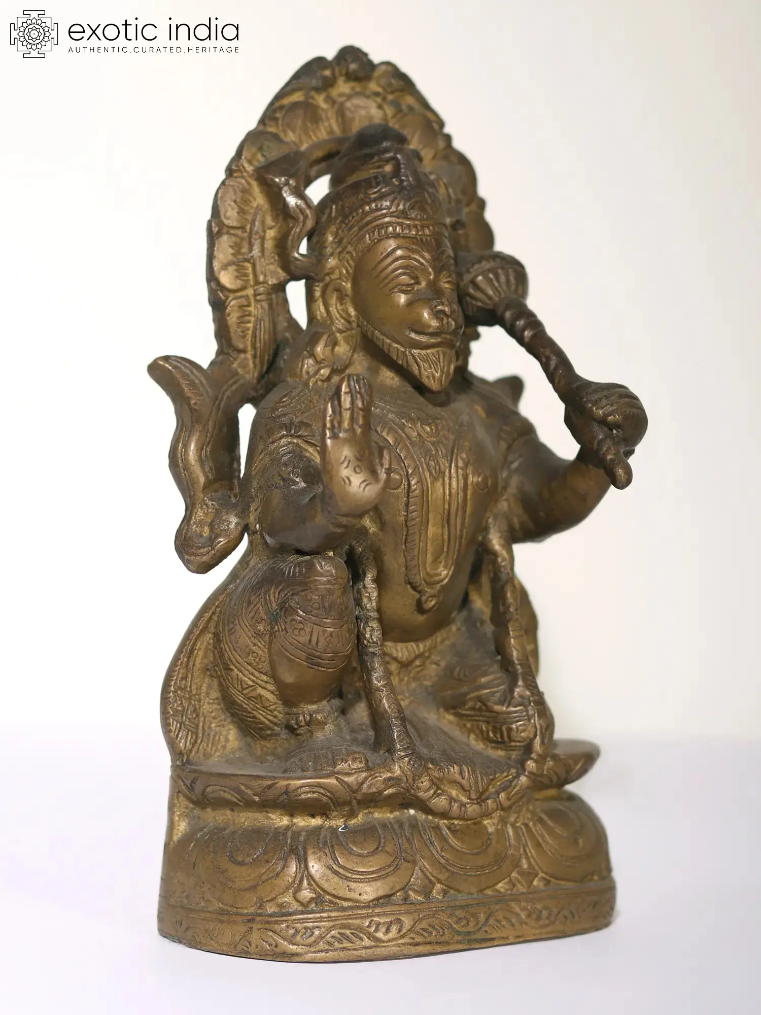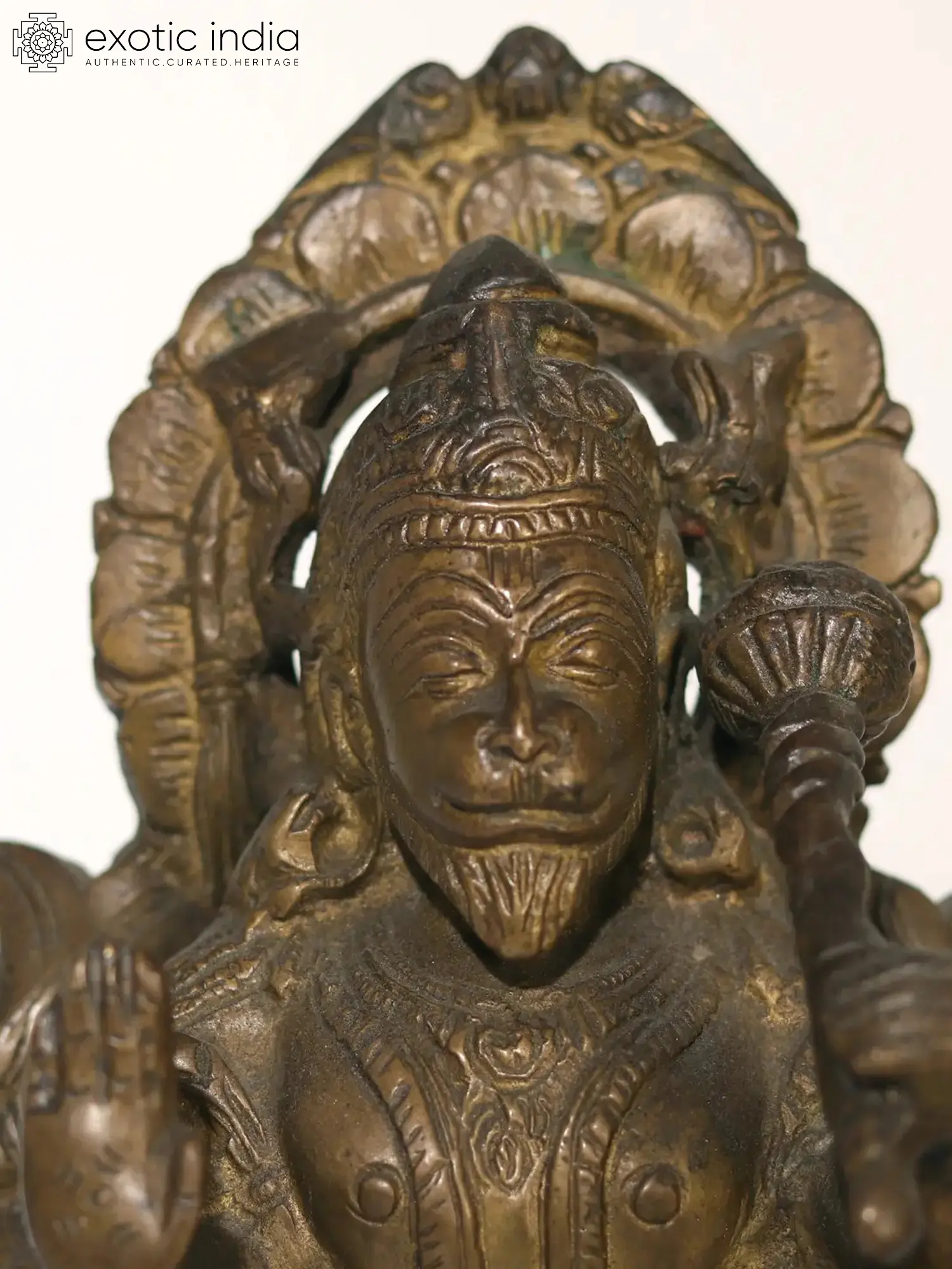 In the tapestry of divinity, Lord Hanuman, the Most powerful One, “One of the Chiranjivis”, seated upon a lotus pedestal with one knee gracefully bent, casts a mesmerising spell of reverence. His right hand, tenderly poised in the “Ashirwad Mudra”, exudes a benevolent aura, showering blessings upon all who gaze upon him. Adorned in regal attire that befits his divine stature, He emerges as a beacon of strength and devotion. The mighty mace Hanuman carries upon his broad shoulder symbolises unwavering protection and fearlessness. This sacred artwork, crafted in brass, speaks of Hanuman’s unwavering dedication to service, his omnipotent strength, and his role as a harbinger of blessings and protection to all who seek his grace.