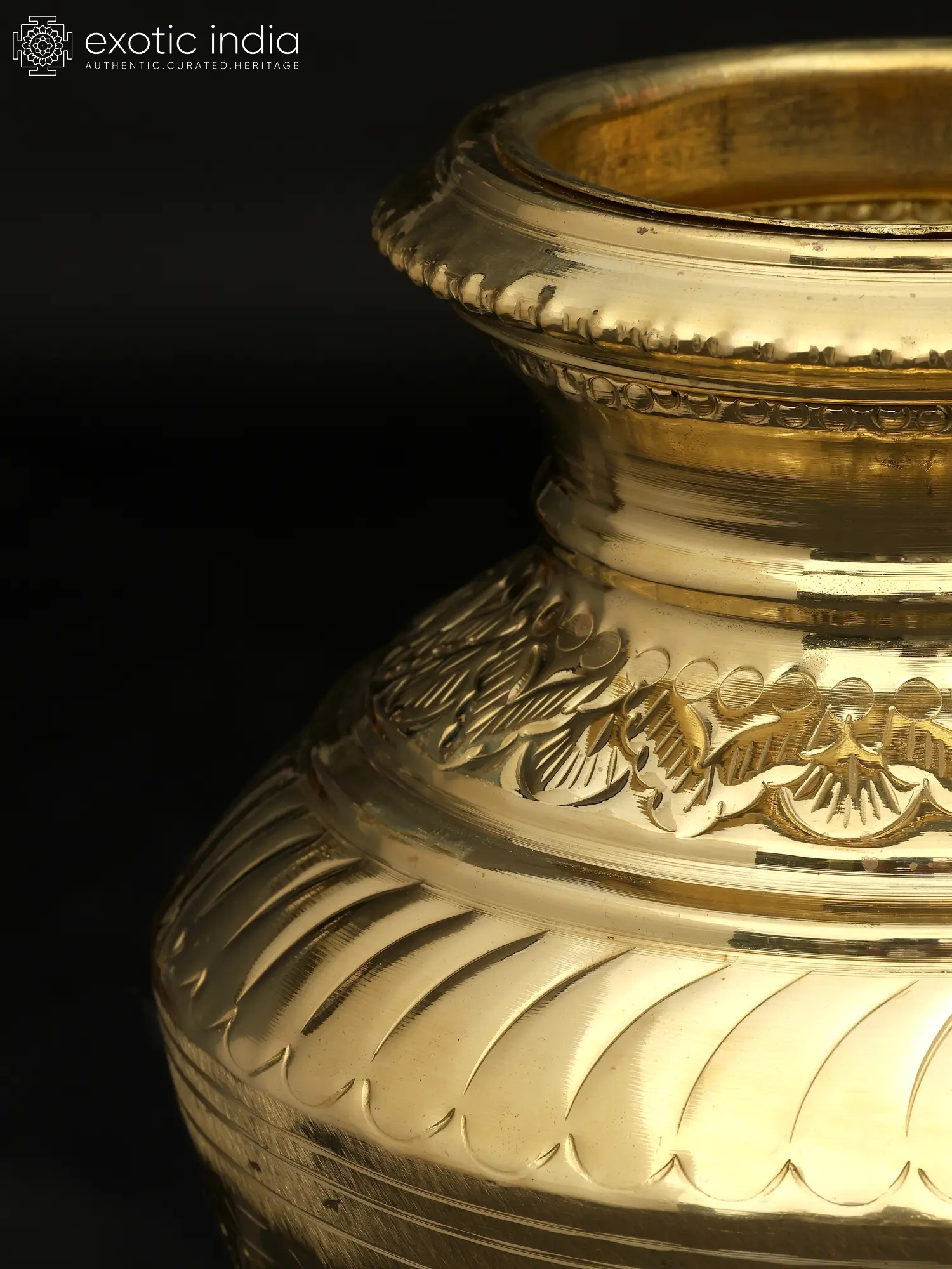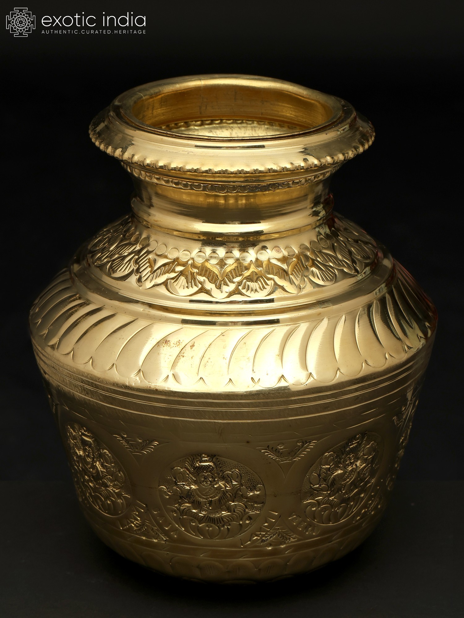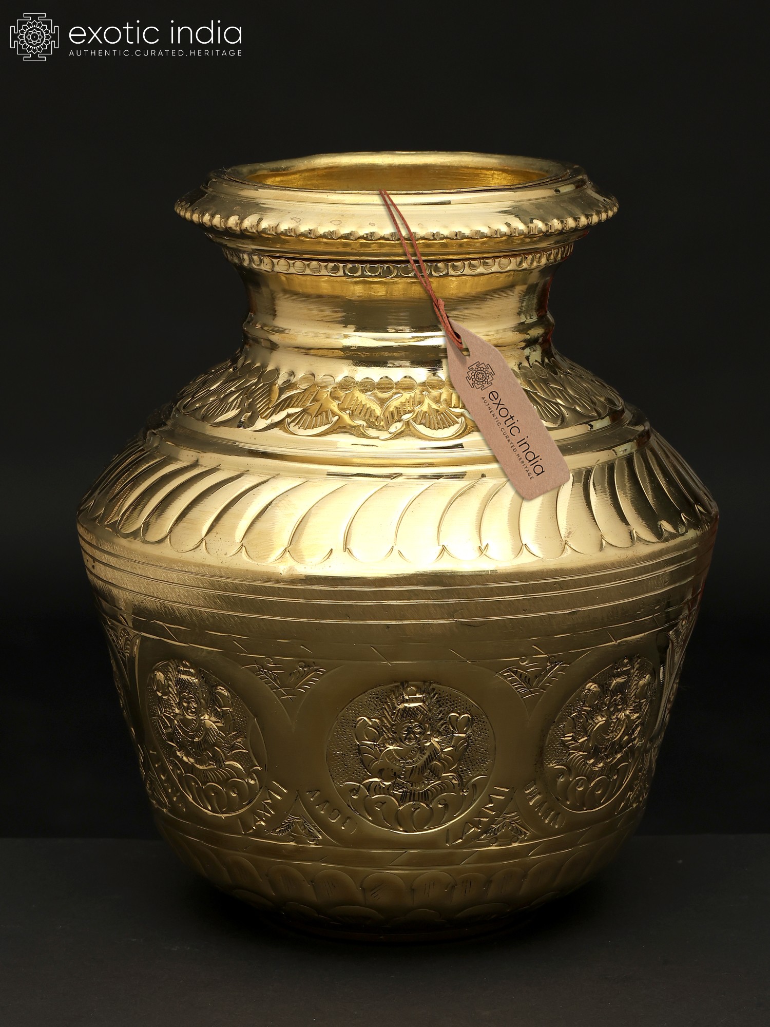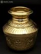 This Ashta Lakshmi Kalash is an excellent addition to any ceremony or puja collection. The surface of this magnificent sculpture depicts the eight manifestations of Goddess Lakshmi, known as Ashta Lakshmi. This metal Kalash is extremely important for auspicious events, bringing good luck and wealth to the home. The Kalash has a rustic appeal with vines and flowers covering its neck. The center ring has exquisitely sculpted Ashta Lakshmi idols, adding to the celestial charm. The golden finish adds to the piece's appeal. The Ashta Lakshmi Kalash is a solemn and graceful addition to any puja location, pouring blessings and auspiciousness into the surrounding environment.