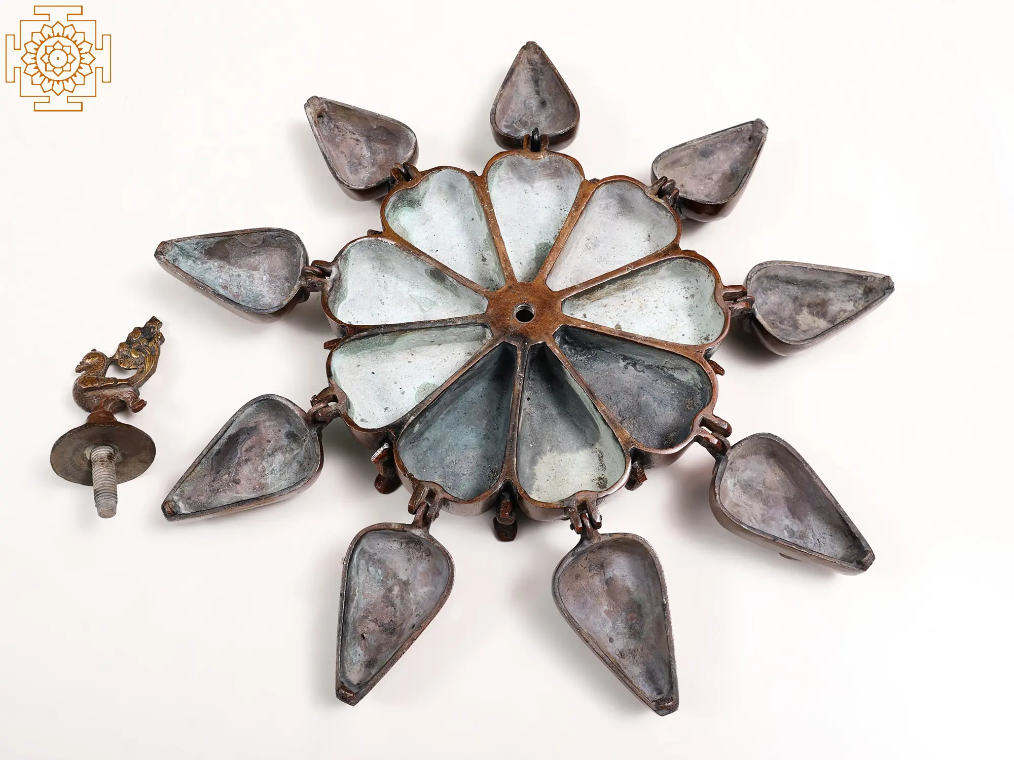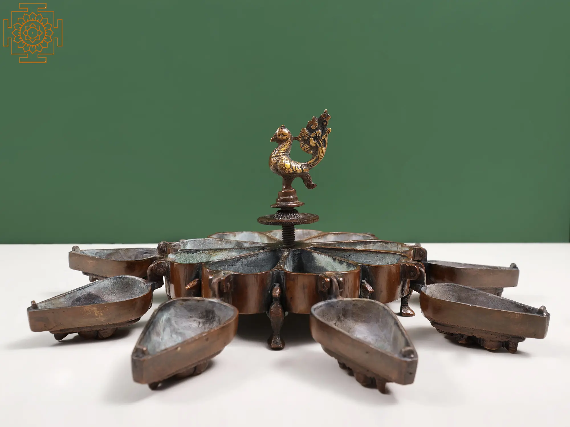 A beautiful tribute to the Bala Mukunda, this Brass Ritual box depicts an infant Lord Krishna sucking his toe. As mentioned in the Markandeya Purana, Lord Krishna tried to find out why his devotees drink the water touched by his feet and exclaim that it is nectar. This ritual box is designed in a Nepalese style and contains nine small containers with the image of Bala Mukunda and a central image of a peacock. The peacock motif also works as the locking screw; loosening the screw allows the containers to open and form the shape of a bloomed flower. This ritual box is a piece of art that can also be used for storing ritual offerings like vermillion, turmeric, and Vibhooti. Keeping this box in the personal worship spaces will ensure a beautiful view and the constant inflow of blessings of the Bala Mukunda.