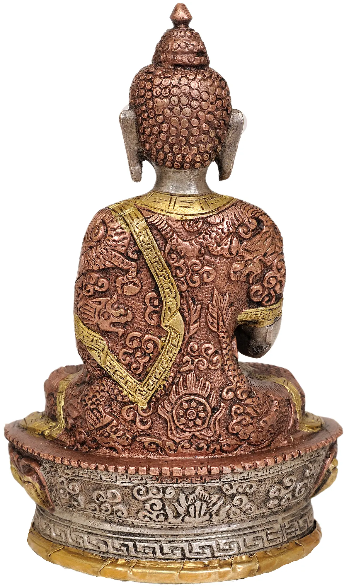 In this gesture, the thumb and index finger of both hands touch at their tips and form a circle, symbolising the turning of the cosmic wheel of Wisdom. Clad in monastic robes, Lord Buddha’s gentle expression exudes an enchanting aura.