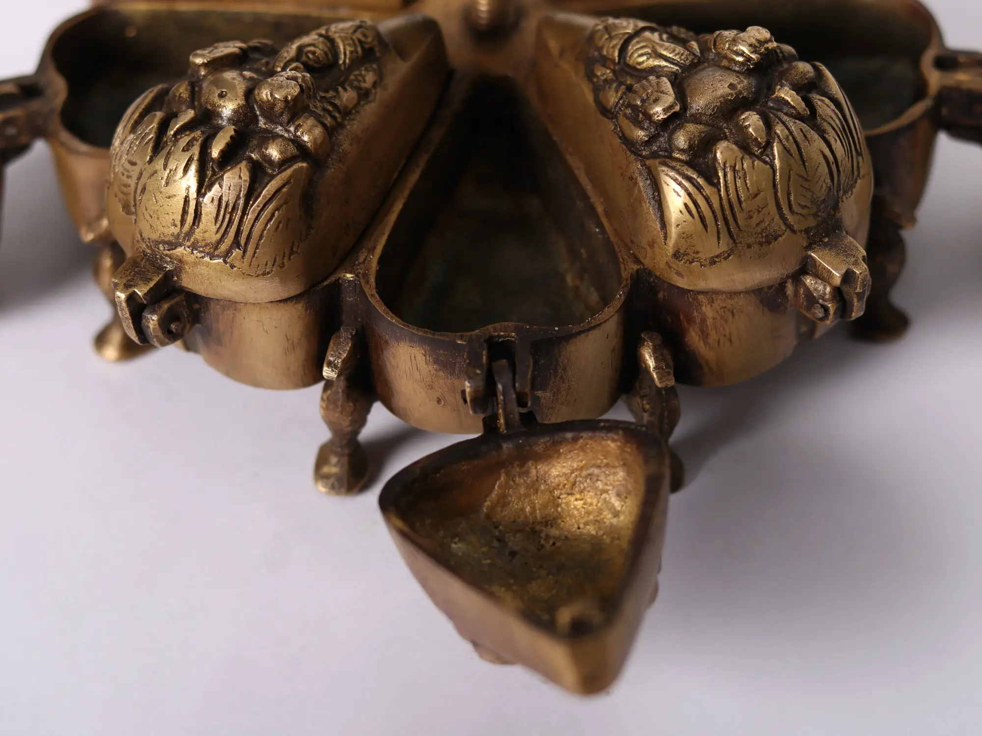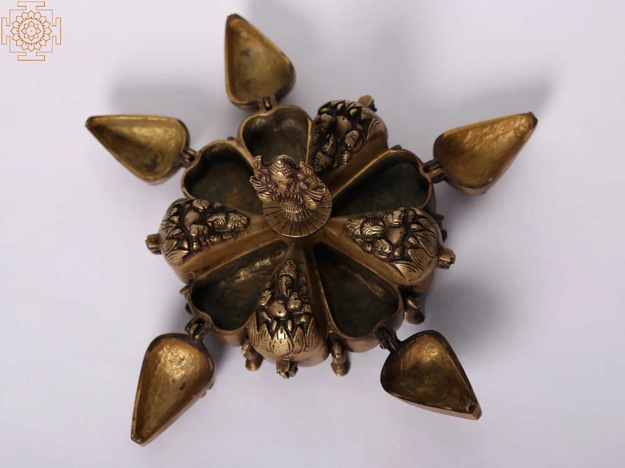 This handmade Kumkum Box features the revered image of Lord Ganesha and may be used to store and protect ayurvedic powders, cosmetic goods, spices, vermilion, and other powders. The antique brown patina-look box might potentially be a high-end decorative piece. This box is constructed of brass and features a Ganesha sign in the center that is attached to the box. It has nine sections in all. Loosening the top of the Ganesha statue allows access to each compartment as it grows like a flower. It is a ceremonial artifact with religious symbolism and ritualistic applications.