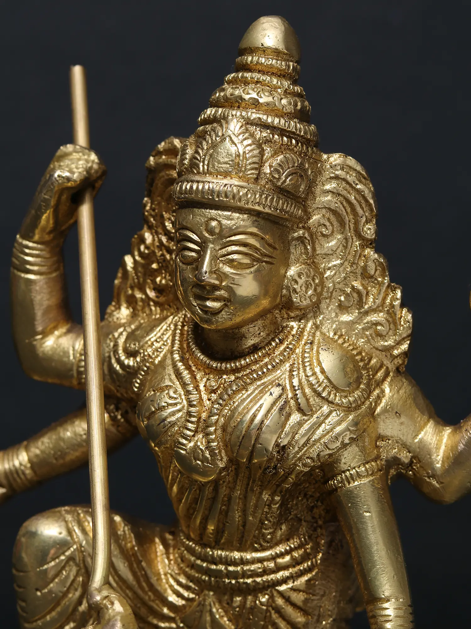 The legendary tale of Mahishasuramardini Durga is envisioned in this brass statue, placed on a metal pedestal for placement in Puja ghar and ritual offerings.