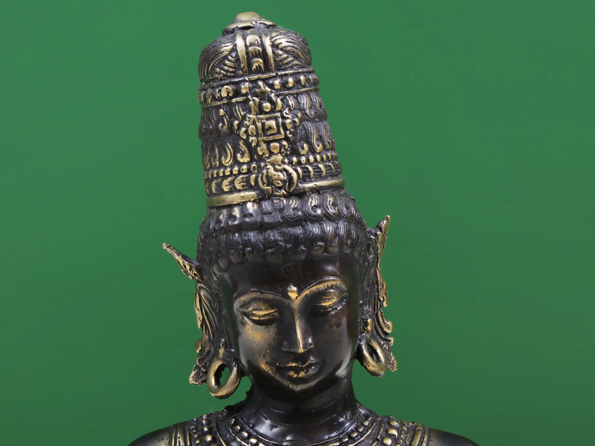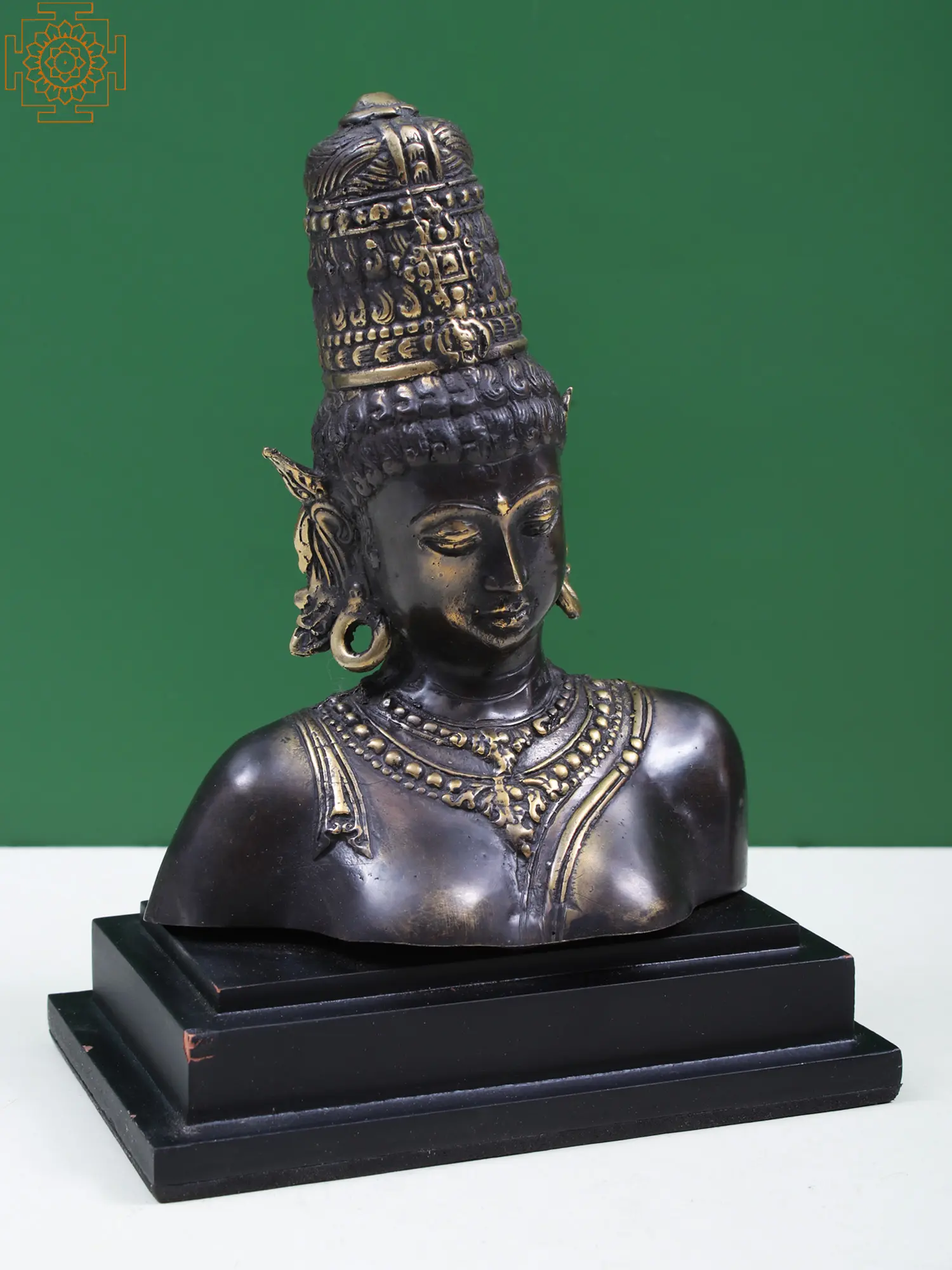 Goddess Parvati appears as a heavenly Yogini in this brass statue, the Shakti of the supreme ascetic Shiva, and exudes an ethereally magnificent atmosphere. Her thick hair is styled in a commanding Jatamukuta fastened with a gem-encrusted tiara. She is appropriately adorned with necklaces and jewelry, yet their appeal pales in comparison to the attractiveness of the great mother goddess. The heavenly iconography of Parvati at once reminds us of the Elephanta Shiva and Bodhisattva Avalokiteshvara, which are some of the finest examples of goodness and celestial qualities condensed in art, just like this serene representation of the primordial mother goddess, with perfectly arching bows, fine nose, and lips delineated in the idiom of Buddhist icons.