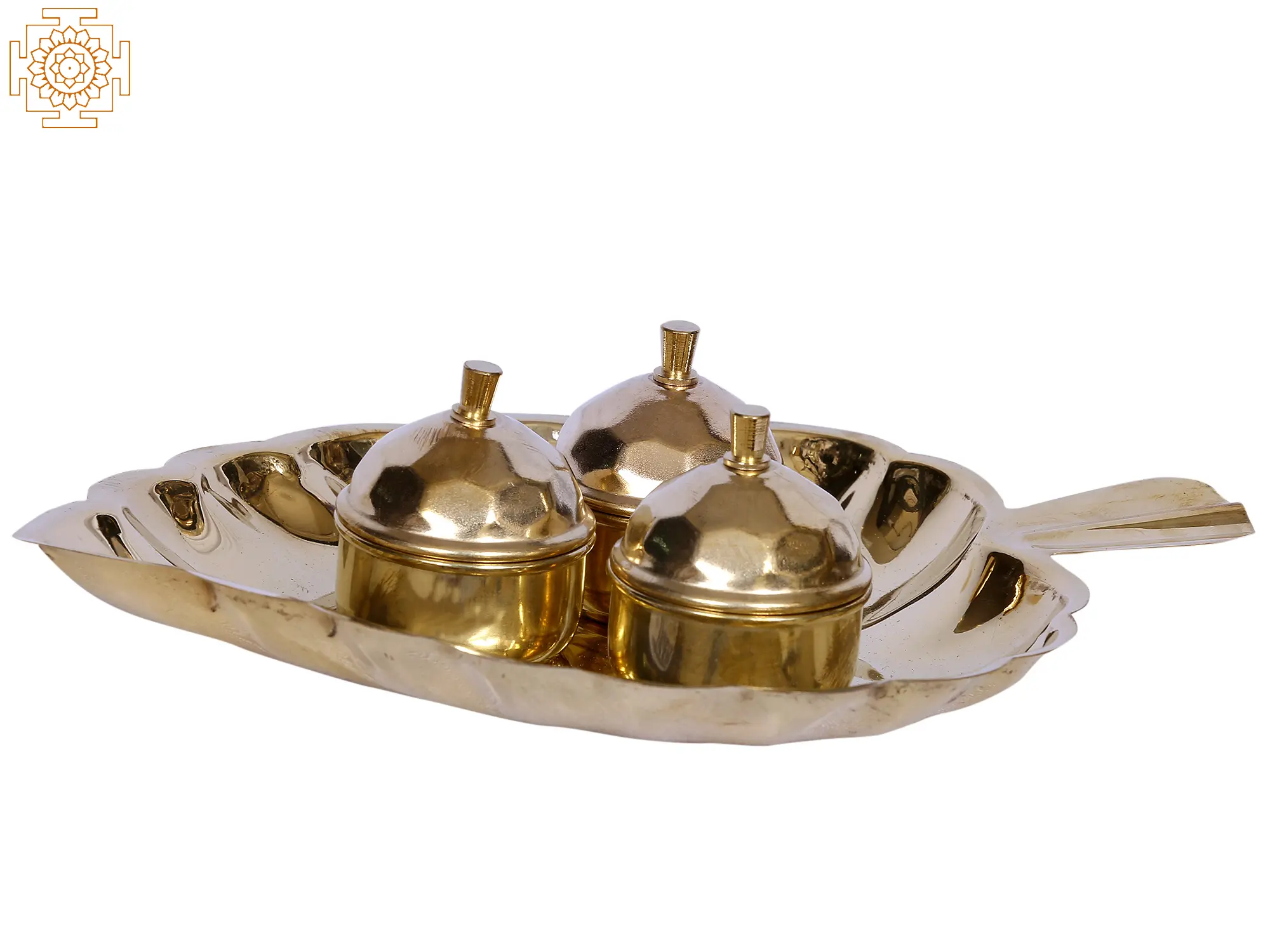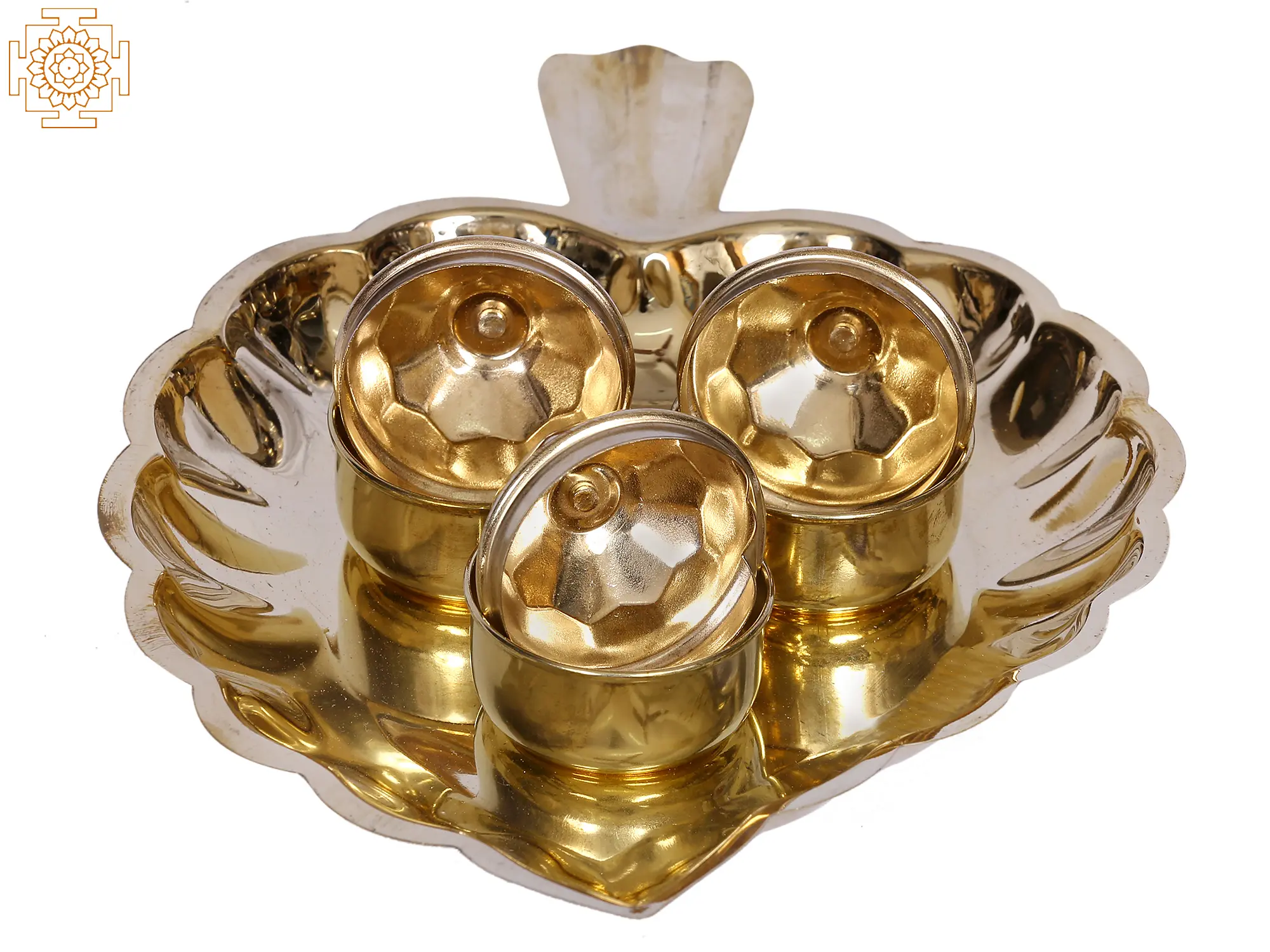 In the graceful curvature of the Kumkum Three Bowls with Leaf Plate, tradition meets artistry. Used to hold the auspicious kumkum powder, it symbolizes the vibrant hues of life. The three bowls represent the triad of creation, preservation, and destruction in Hinduism. The intricate leaf plate cradles these bowls, connecting us to the natural world. The application of kumkum as a tilak signifies blessings and protection. This brass piece is more than just an accessory; it's a demonstration of the rich symbolism embedded in everyday rituals, a link to the sacred within the mundane.
