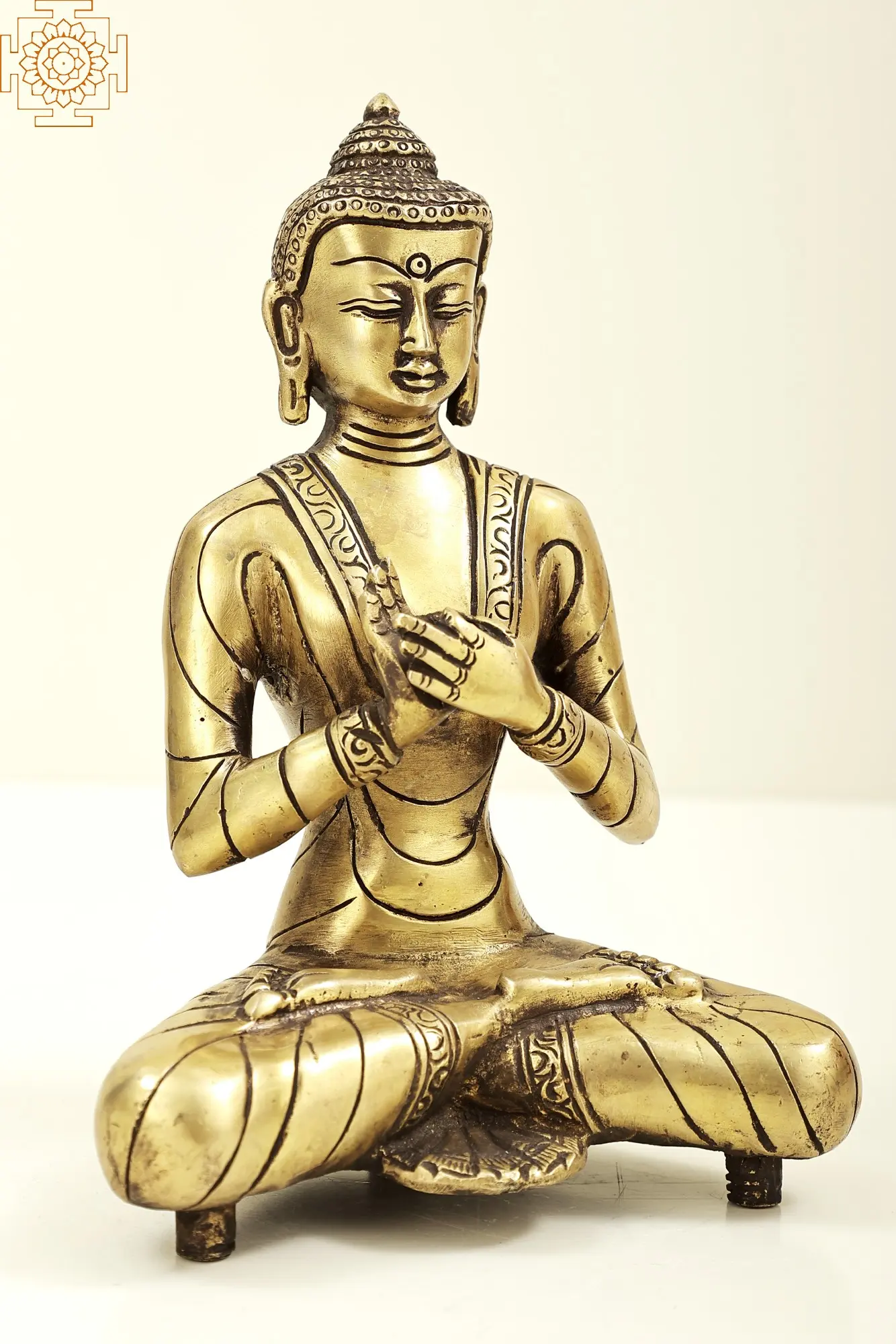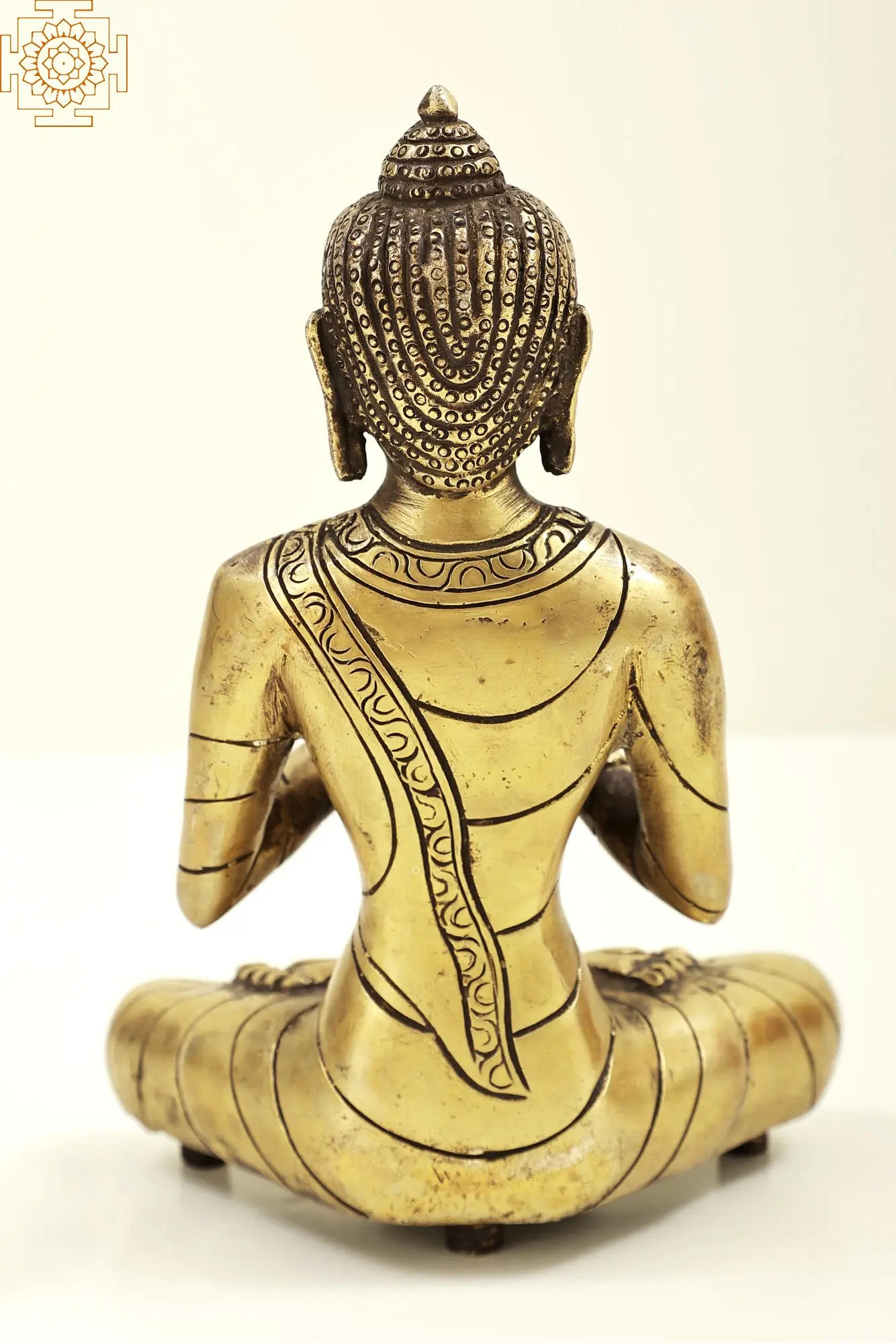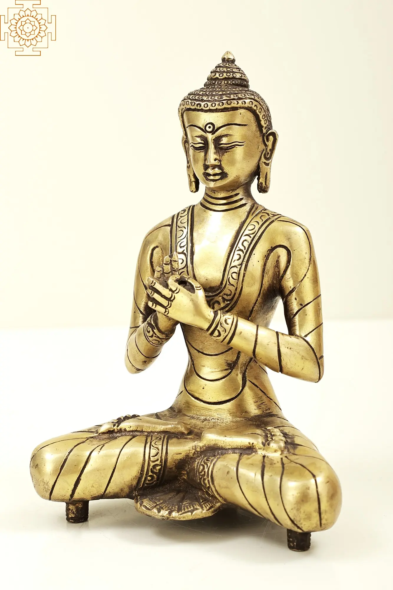 Buddha, seated in the Dharmachakra Mudra, signifies the moment of his first sermon, where he set the wheel of Dharma in motion. This mudra symbolises the teaching phase of his life, representing the continuous cycle of birth and rebirth, and the path to enlightenment. Seated in Padmasana, or the lotus pose, he embodies the perfect balance and inner peace. This brass idol serves as a reminder to embrace the teachings of mindfulness, compassion, and enlightenment in your own life.