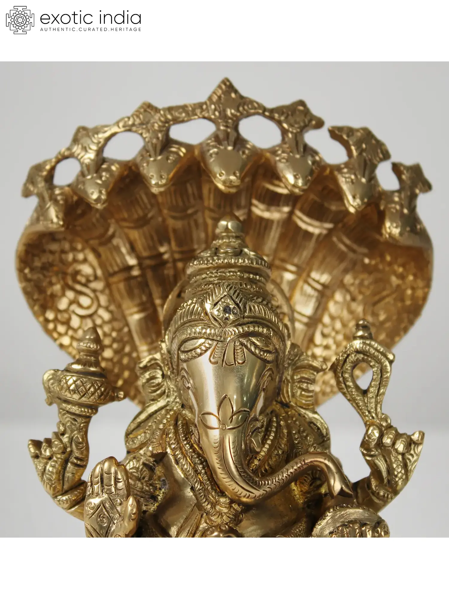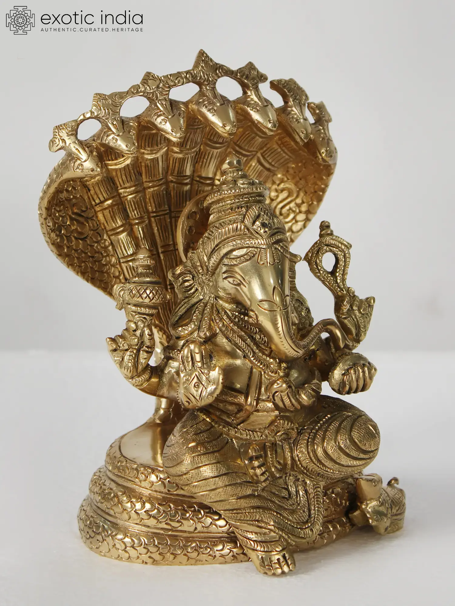 Behold the magnificent presence of Lord Ganesha, the remover of obstacles and the patron of beginnings, seated serenely upon the coils of Sheshnag, the king of all serpents. This exquisite brass sculpture captures a powerful and revered depiction of the elephant-headed deity, imbued with the ancient symbolism of cosmic energy and eternal time. Crafted with meticulous attention to detail, this piece is more than just an idol; it is a gateway to the divine, a testament to centuries of artistic tradition and spiritual devotion. The serpentine form of Sheshnag, believed to form the celestial bed of Lord Vishnu, represents the primordial waters and the endless cycle of creation, preservation, and dissolution. By resting upon Sheshnag, Ganesha signifies his mastery over these fundamental forces of the universe. The multi-headed cobra canopy above Ganesha is particularly significant. In Hindu mythology, Sheshnag is often depicted with a thousand heads, each capable of spewing venom and fire, yet here, they form a protective, majestic aura around the benevolent god. This imagery emphasizes Ganesha's inherent power and his ability to shield devotees from negativity and adversity.