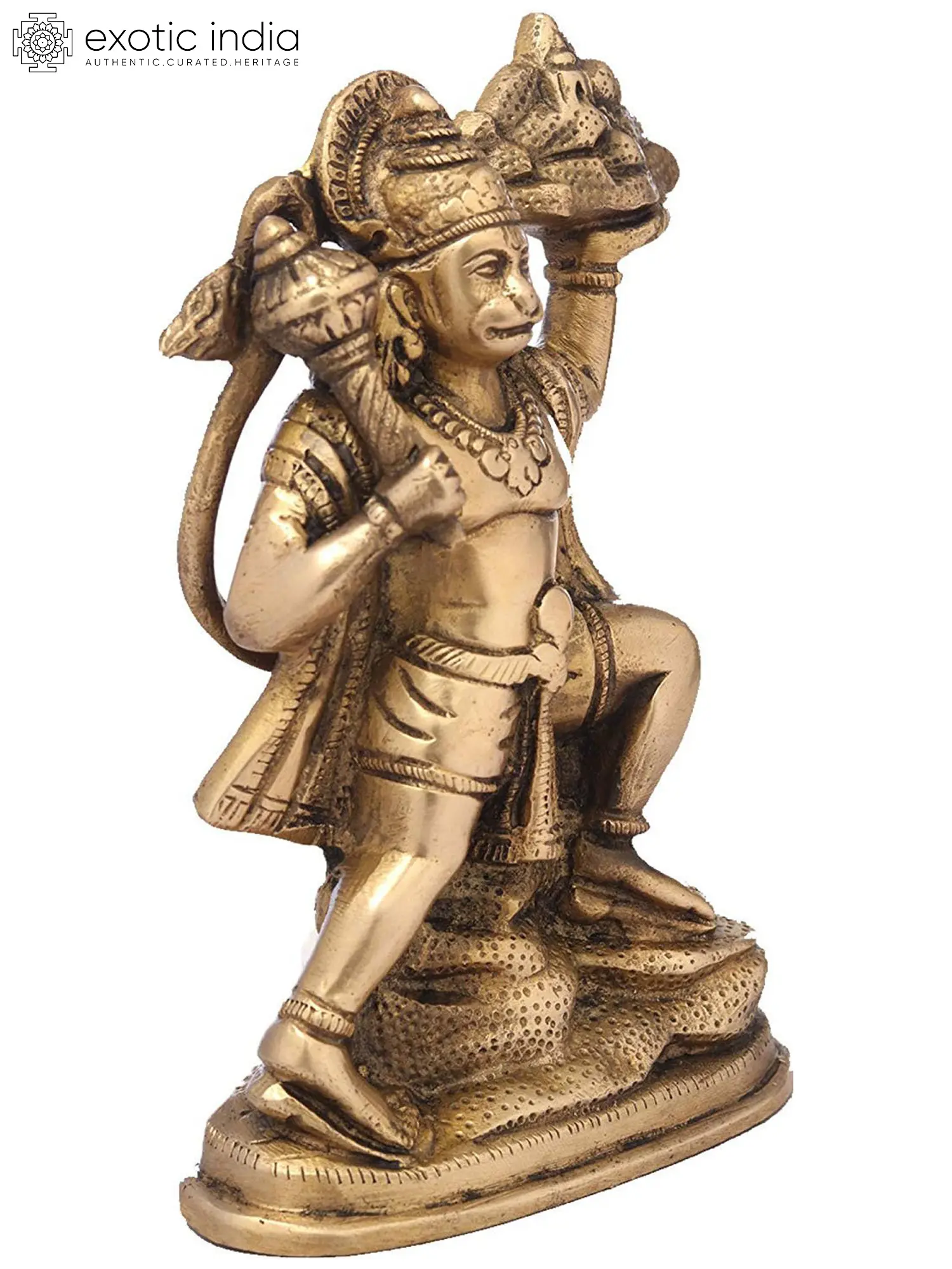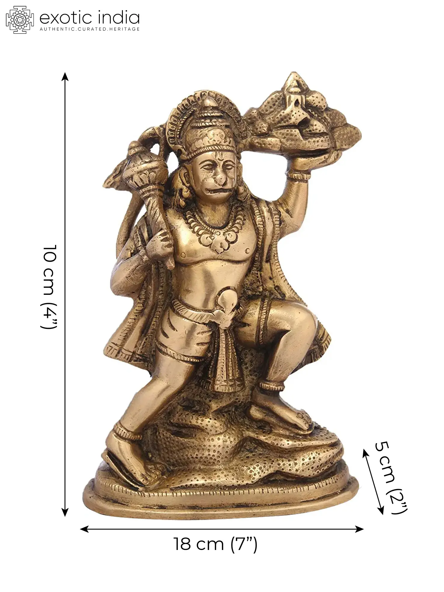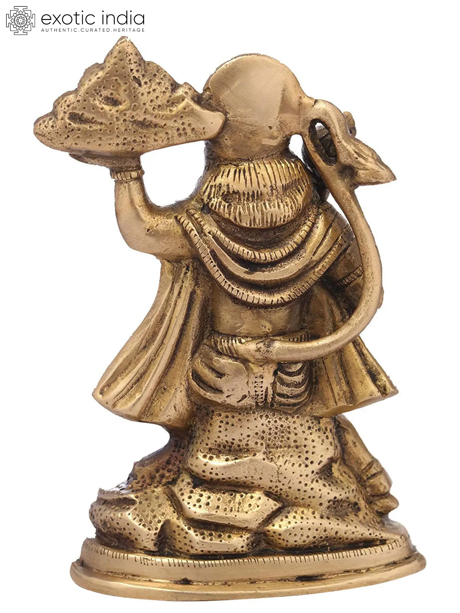 With one hand, Lord Hanuman, a divine Vanara companion of the God Rama, hoists the towering Mountain of Herbs (the Sanjeevani Booti), a weighty symbol of devotion and unwavering dedication. His attire, a simple Langot, and a flowing robe cascading from his divine shoulders, befitting the lordly aura He embodies. Atop his regal head rests a crown, a tribute to his unparalleled strength and unwavering loyalty. With his mighty mace, “the Gada”, resting upon his shoulder, He stands poised for flight. This act encapsulates the spirit of selflessness, as he carries the elixir of life to heal a wounded comrade (Lakshmana). Lord Hanuman's divine act of bearing the Sanjeevani Mountain signifies the undying spirit of sacrifice, and the boundless power of faith in the face of adversity.