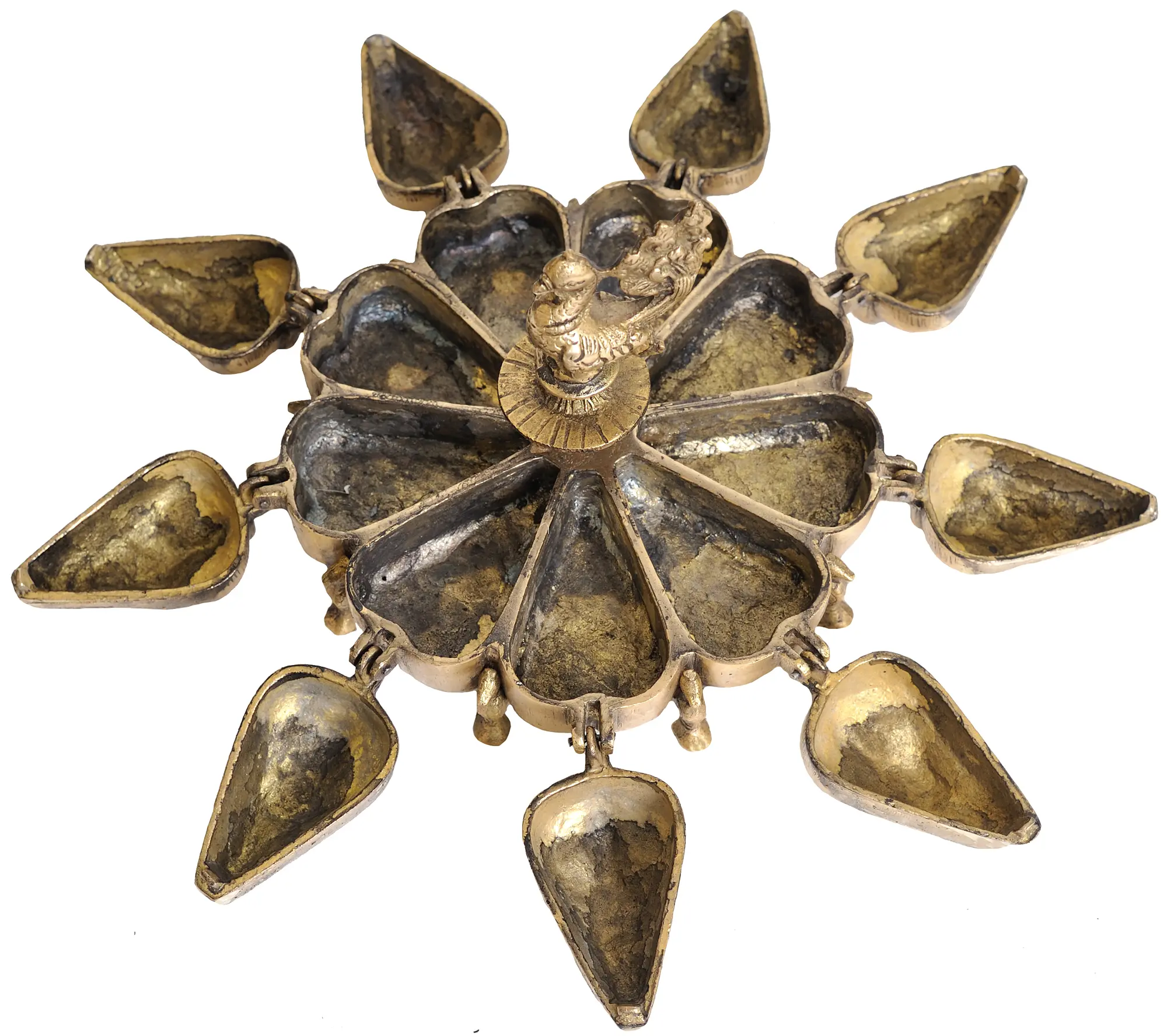Shri Krishna, the epitome of love and beauty, has been depicted in many forms, such as Madhava, Madan Mohana, and Keshav. This brass box with the image of Lord Krishna on each container carries the Murli Manohar image of the Lord. This Nepalese-style box is a ritual item with nine compartments arranged like a flower. Each compartment has a lid with the sacred image of Lord Krishna. The entire arrangement is further fixed with a peacock motif screw. To open the containers, one needs to loosen the screw. These boxes have been long used for keeping sacred offerings like vermillion, turmeric, sandalwood paste, and raw rice. This box carries religious significance and also looks like a treasure chest for the beholder to boast about.