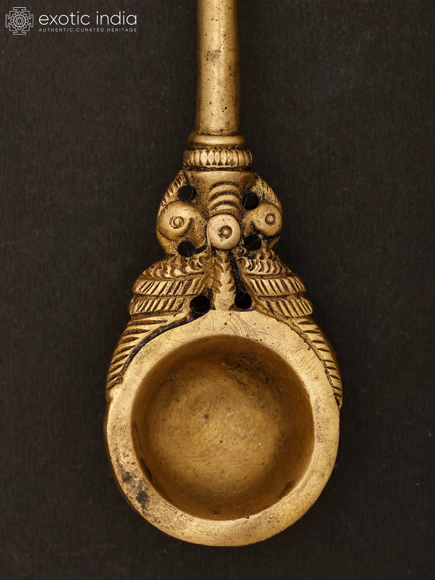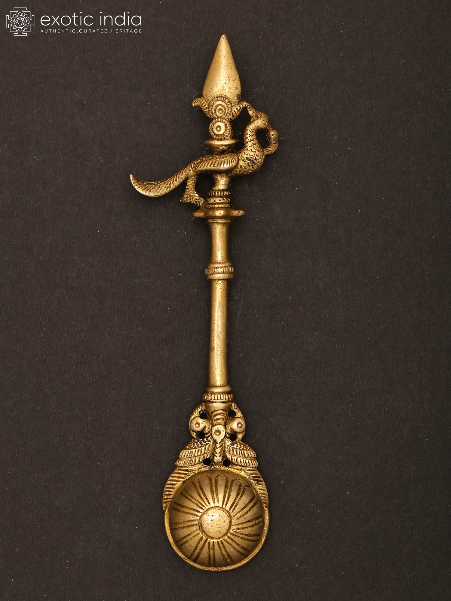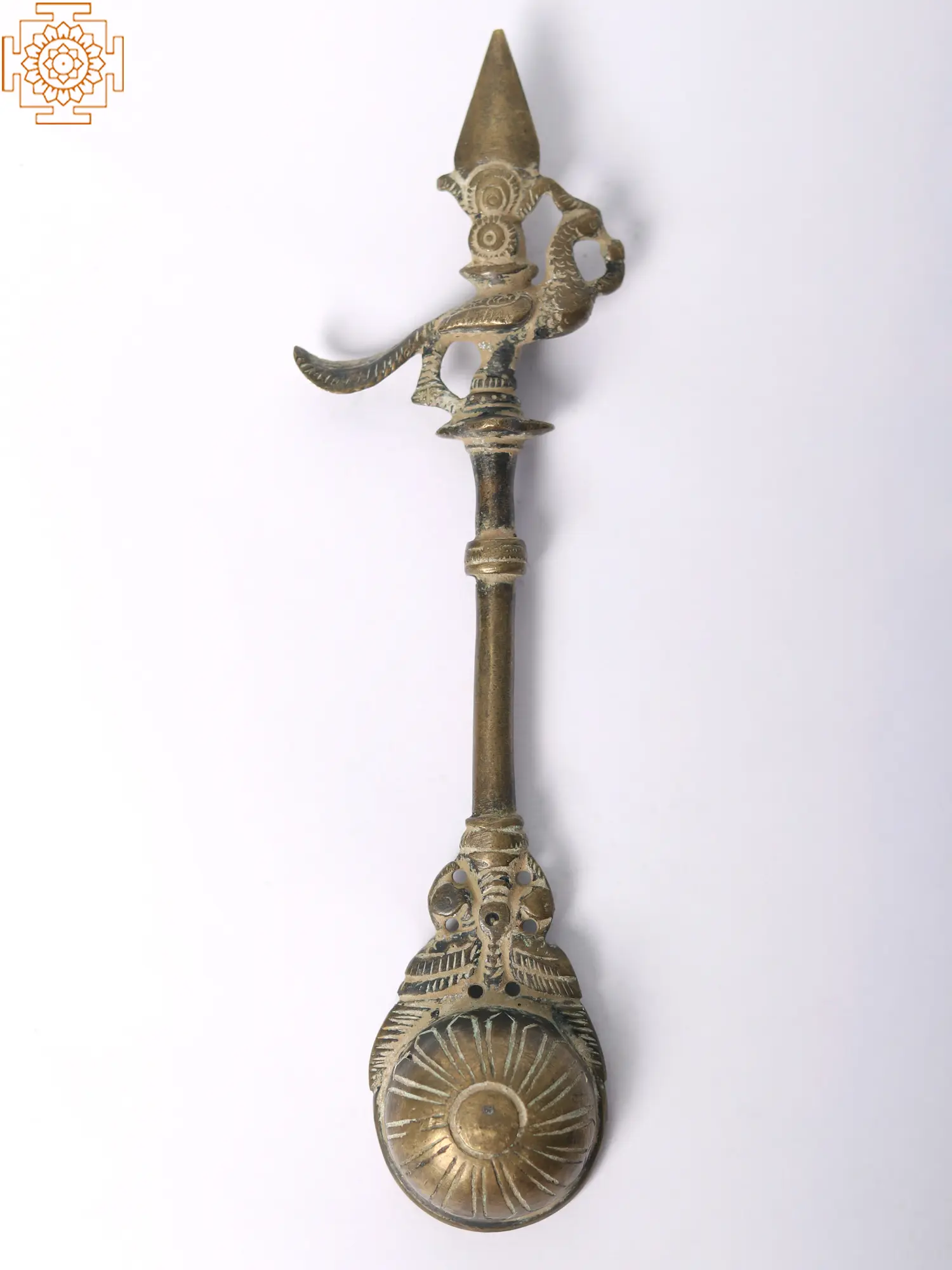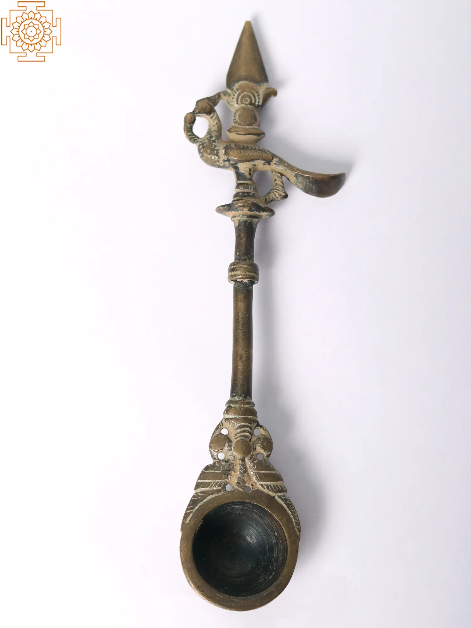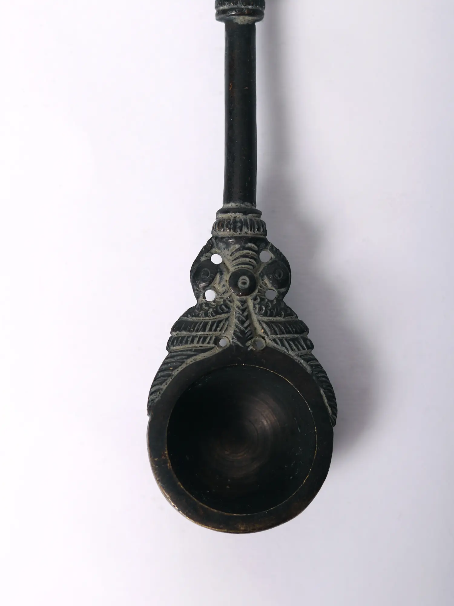 This brass ritual spoon is also known as the Pali or Panchamrita spoon. It is generally found as set with the Panchapatra (container for Panchamrita). This spoon is made of high-quality brass and has a sacred peacock motif at the end of the handle. This spoon can also be used for offering ghee in Homas. The most attractive feature of the spoon is the patina look which makes it look like an antique item. This spoon has been an integral part of rituals and a medium for making offerings.