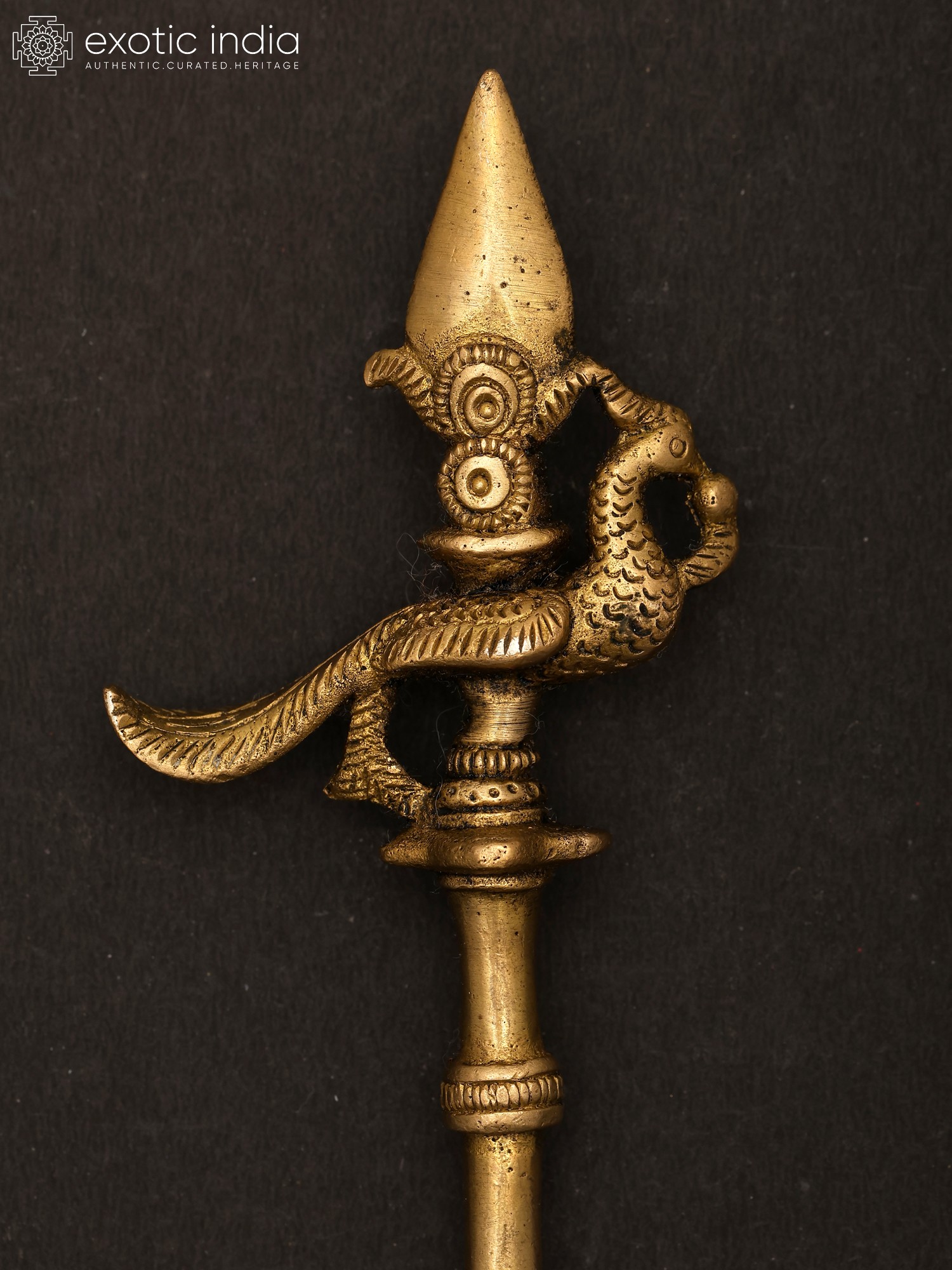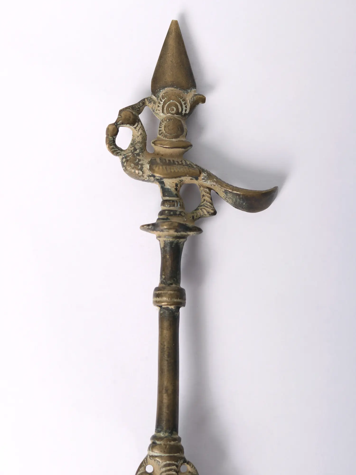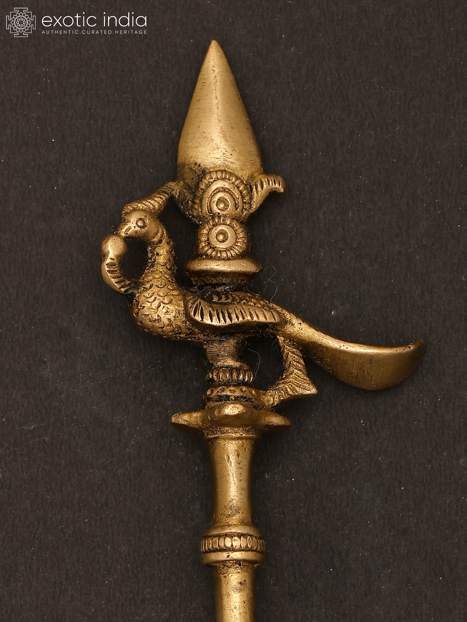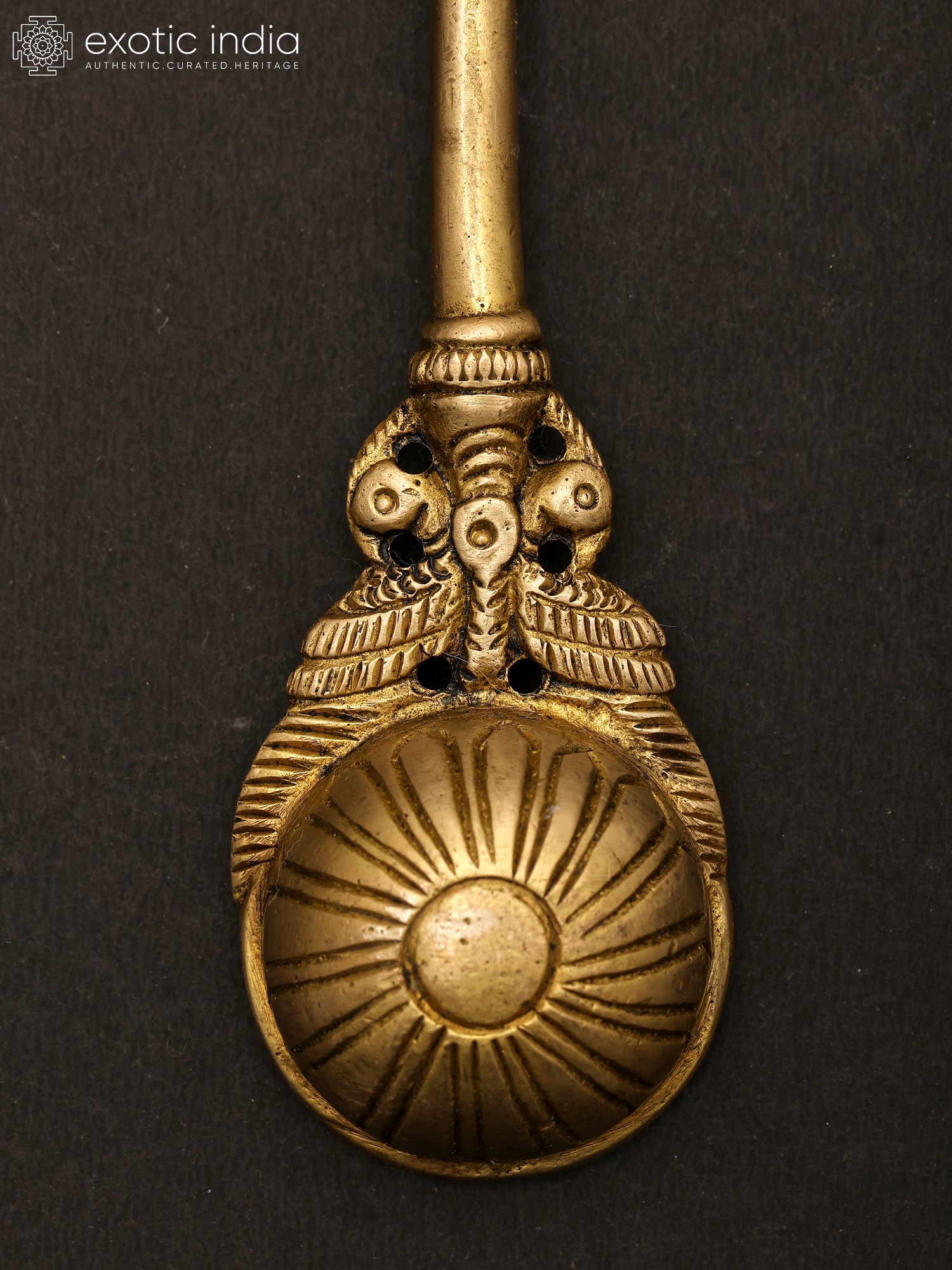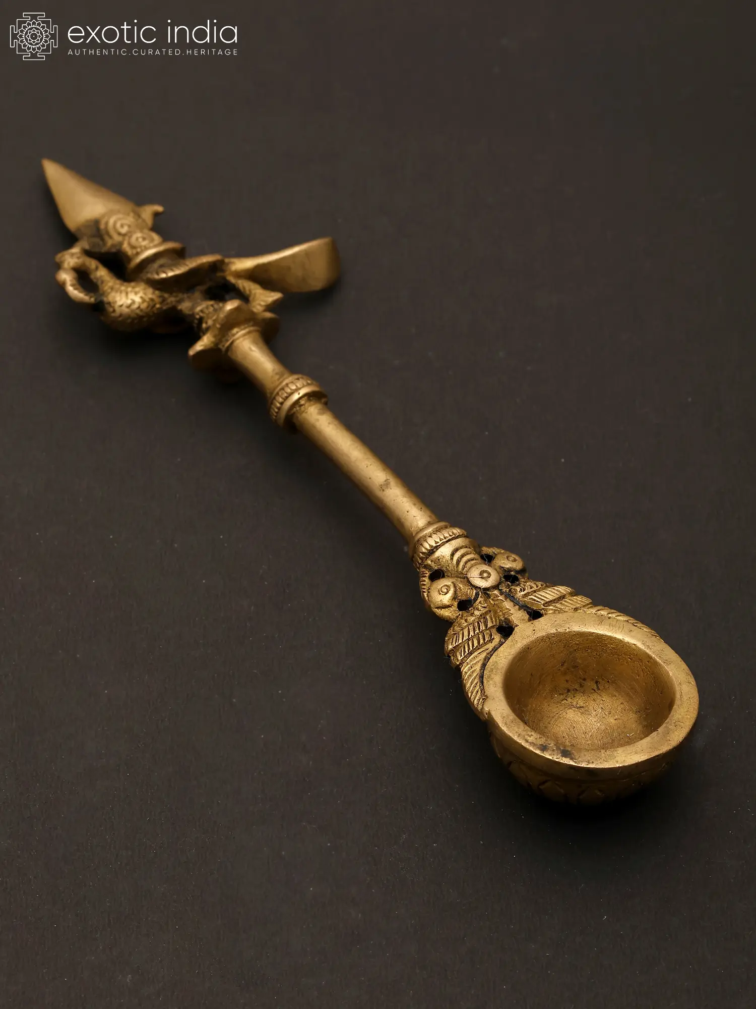 This brass ritual spoon is also known as the Pali or Panchamrita spoon. It is generally found as set with the Panchapatra (container for Panchamrita). This spoon is made of high-quality brass and has a sacred peacock motif at the end of the handle. This spoon can also be used for offering ghee in Homas. The most attractive feature of the spoon is the patina look which makes it look like an antique item. This spoon has been an integral part of rituals and a medium for making offerings.
