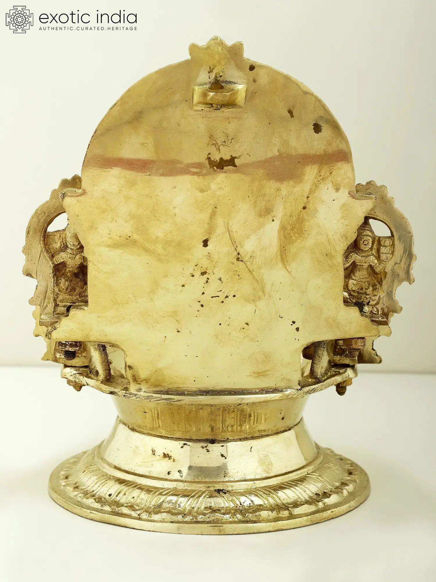 This brass lamp is a devotional offering to the Divine Mother Pratyangira, who has five ferocious faces and never ceases to protect incessantly at all times, with an appearance resembling a lion with a wide mouth and very sharp diamond teeth and a protruding tongue sparkling like the sun, with illuminated and fierce eyes emitting fire and a dark blue complexion bearing twenty arms holding deadly weapons. She who personifies the Super Consciousness and One who cuts off all black magic dissolves karma, and wards off all evil, praise be to Her, whose form should be recalled and worshipped at all times to achieve lifelong peace and prosperity. This Lakshmideepam with motifs of Goddess Pratyangira seated under a Kirthimukha and assisted with images of Goddess Lakshmi, Goddess Saraswati, Lord Kartikeya, and Lord Ganesha is a medium to bring the divine blessings of the deities.