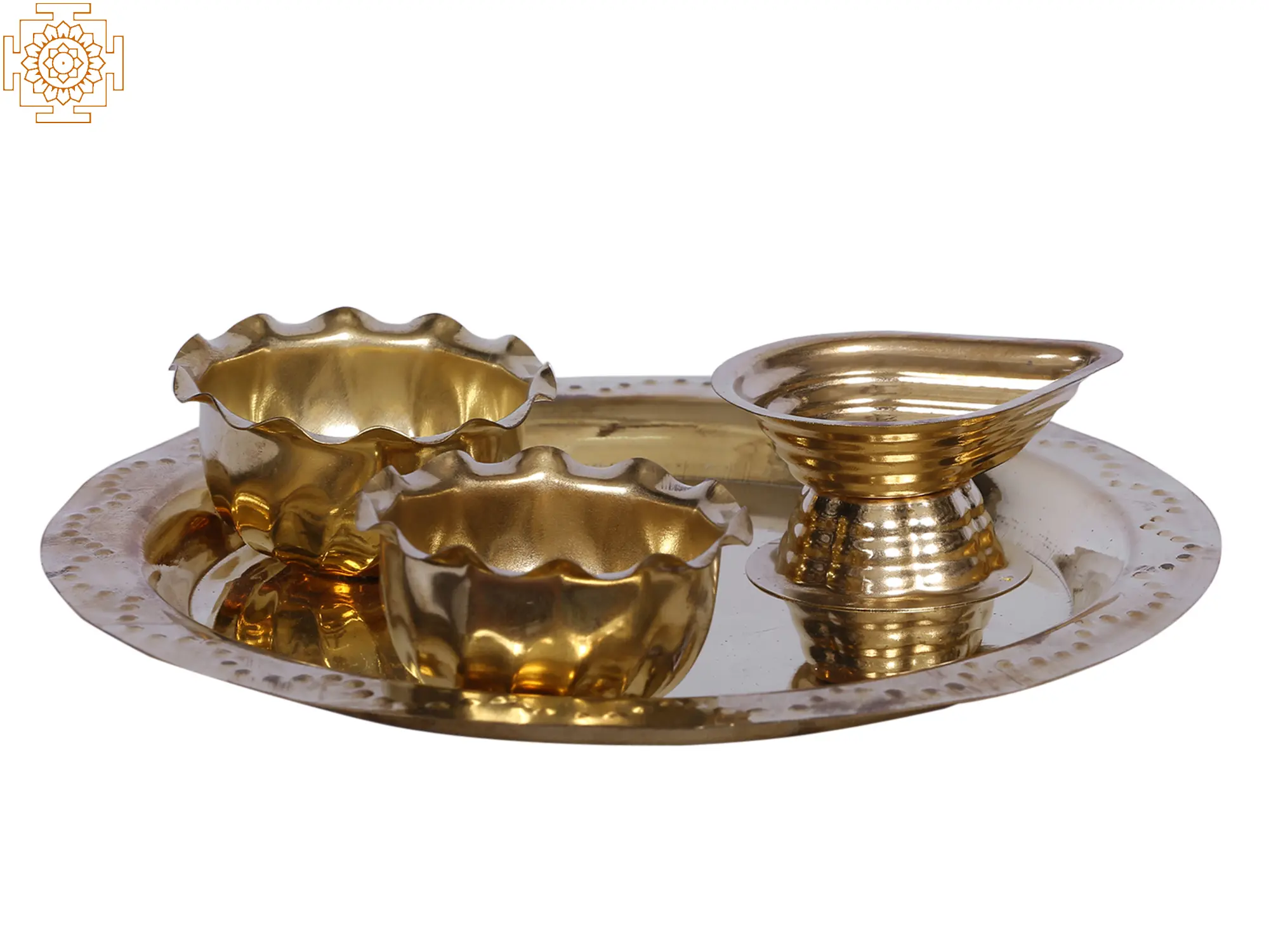In Hindu ceremonies, there are many rituals that are mandatory for concluding. This Brass Puja Thali with one attached diya and two bowls for keeping Kumkum and raw rice is a sacred and elegant religious accessory used in Hindu worship ceremonies. Crafted from high-quality brass, the thali typically features a raised outer wall that enables the devotee to hold the plate more comfortably. The attached diya (oil lamp) is an essential part of the thali, symbolizing the divine presence and enlightenment. Additionally, two small bowls are often included on the thali, serving as containers for offering items such as rice and vermillion during the puja ritual. This ensemble combines functionality, aesthetics, and spirituality, making it an indispensable item for Hindu households during religious ceremonies and festivals.