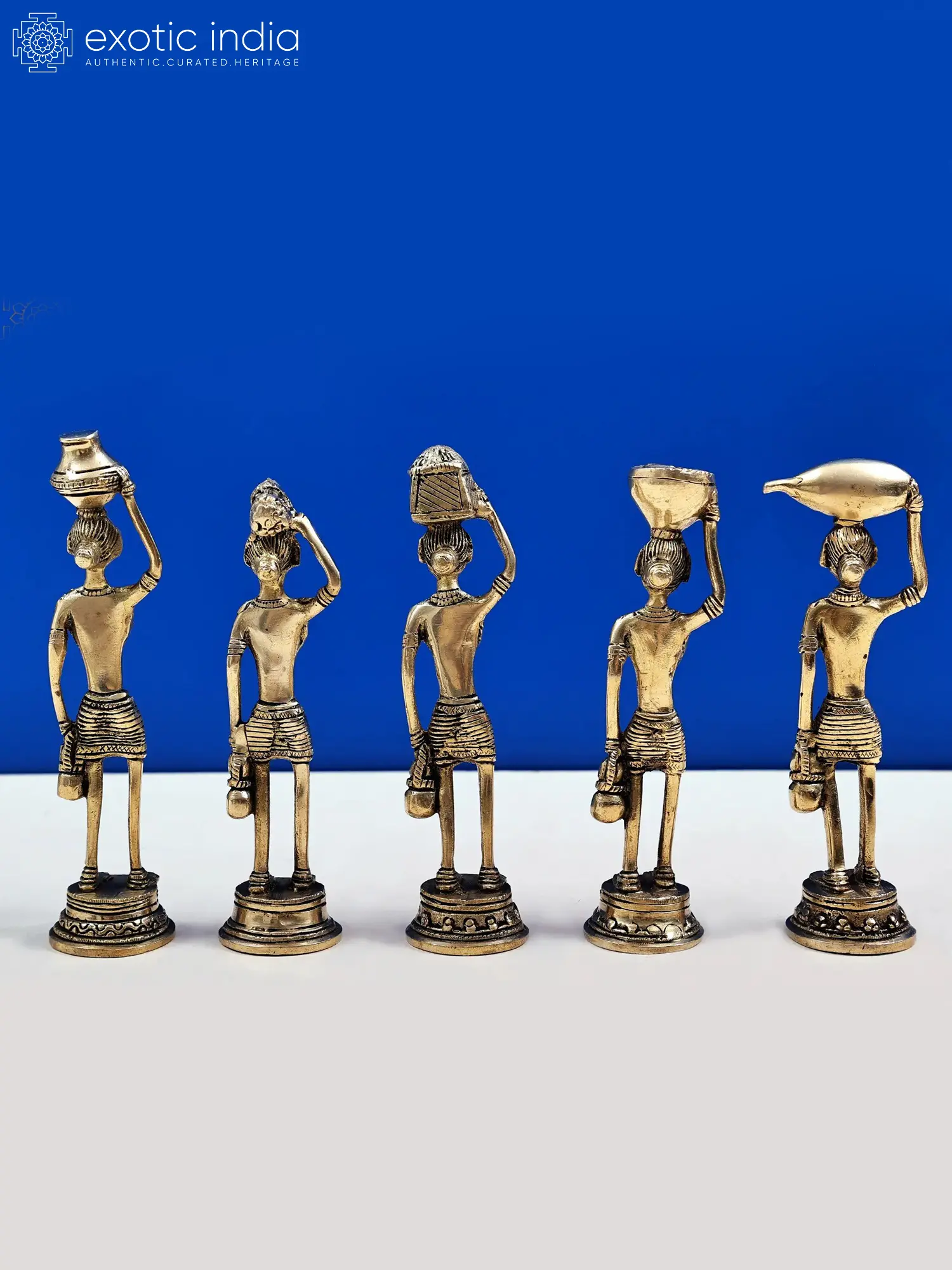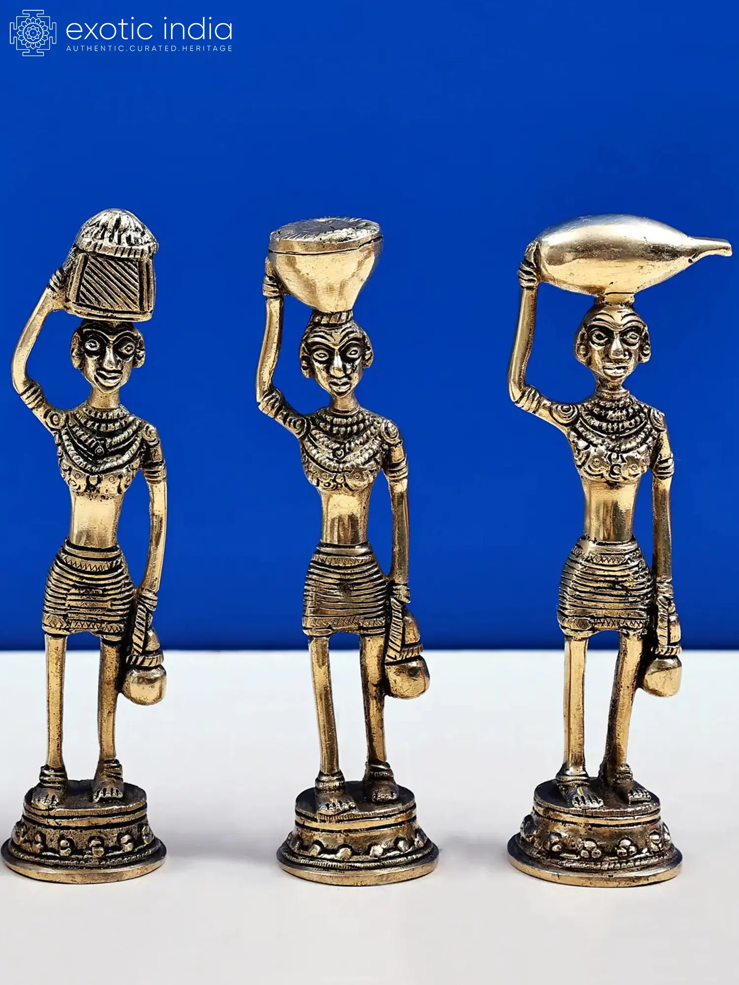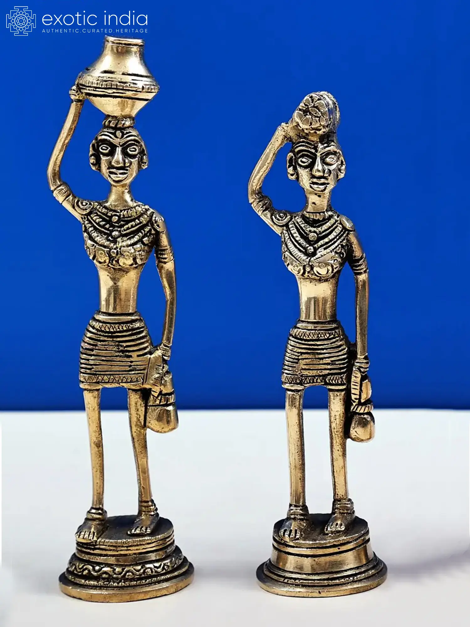 These exquisite brass figures capture the essence of tribal life, showcasing the enduring spirit and daily struggles of women who are the backbone of their communities. Each statue, meticulously handcrafted, depicts a woman with distinct items balanced on her head, a powerful symbol of her labor and resilience. From graceful pots symbolizing the vital task of fetching water, a practice echoed in tales of goddesses like Ganga descending to earth to quench a parched world, to baskets brimming with produce, representing sustenance and the bounty of the land, these figures tell a story of devotion to family and tradition. The fine detailing on their attire, from layered skirts to intricate chest adornments, speaks to the rich cultural heritage and aesthetic sensibilities of these tribal communities. ––––––––––––––––––––