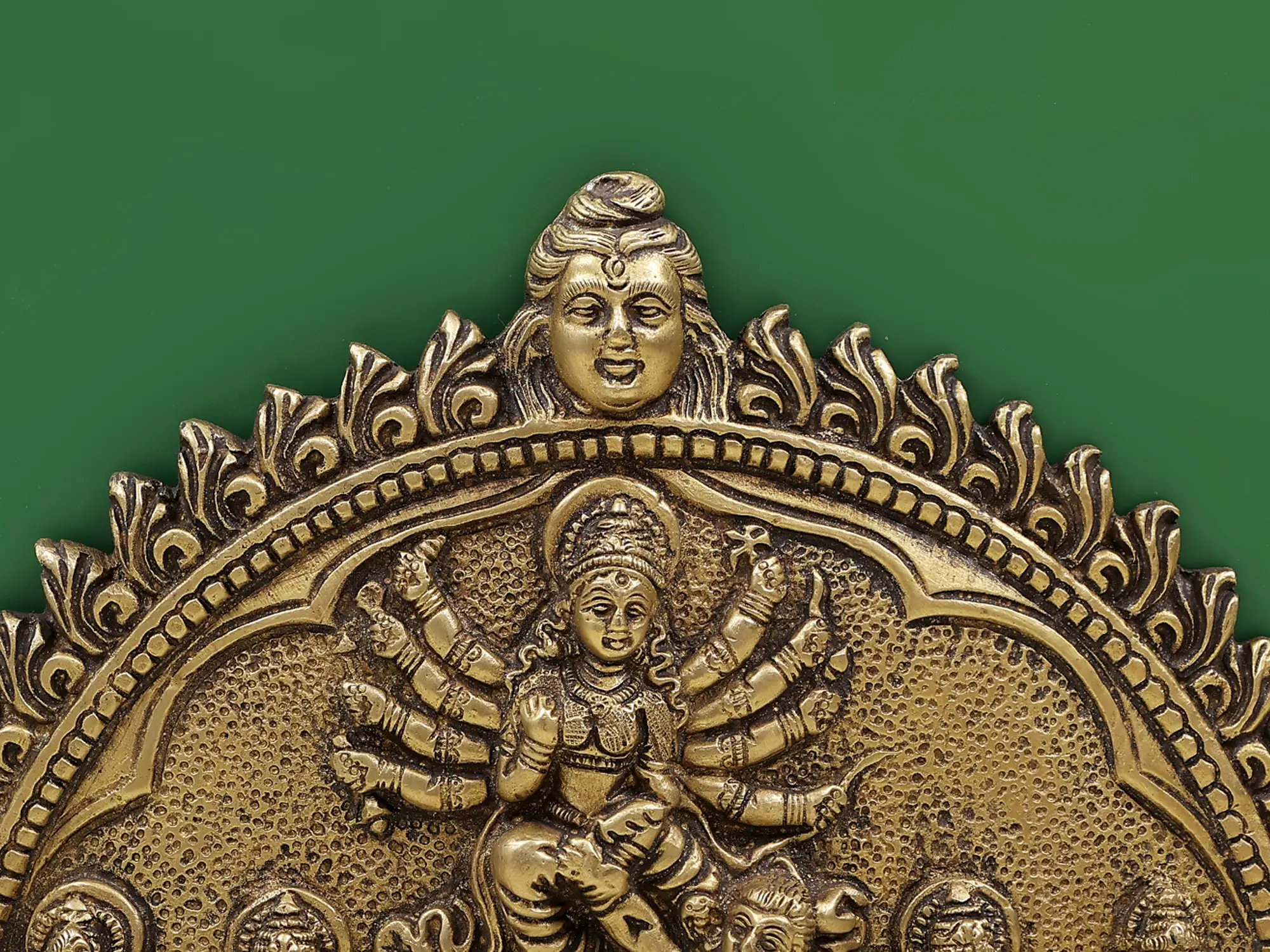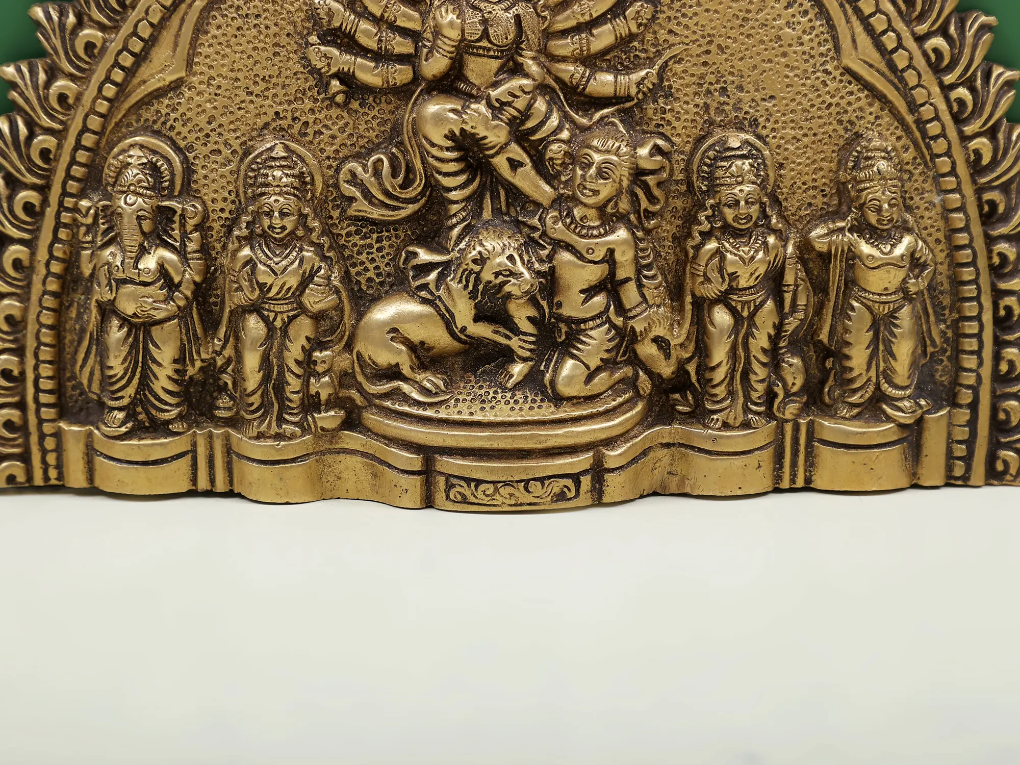 The Brass Wall Hanging Plate portrays the mighty Goddess Durga at its center, flanked by her divine children, Ganesha, Lakshmi, Saraswati, and Karttikeya. This intricately crafted artwork symbolizes the power of unity and collaboration among the deities. As a cohesive force, they embody the collective strength and wisdom needed to conquer adversities. This sculpture reminds us of the importance of teamwork and harmonious coexistence in overcoming challenges in our lives. Goddess Durga here depicts how important it is to seek support from our loved ones and embrace unity as a key to achieving greatness.