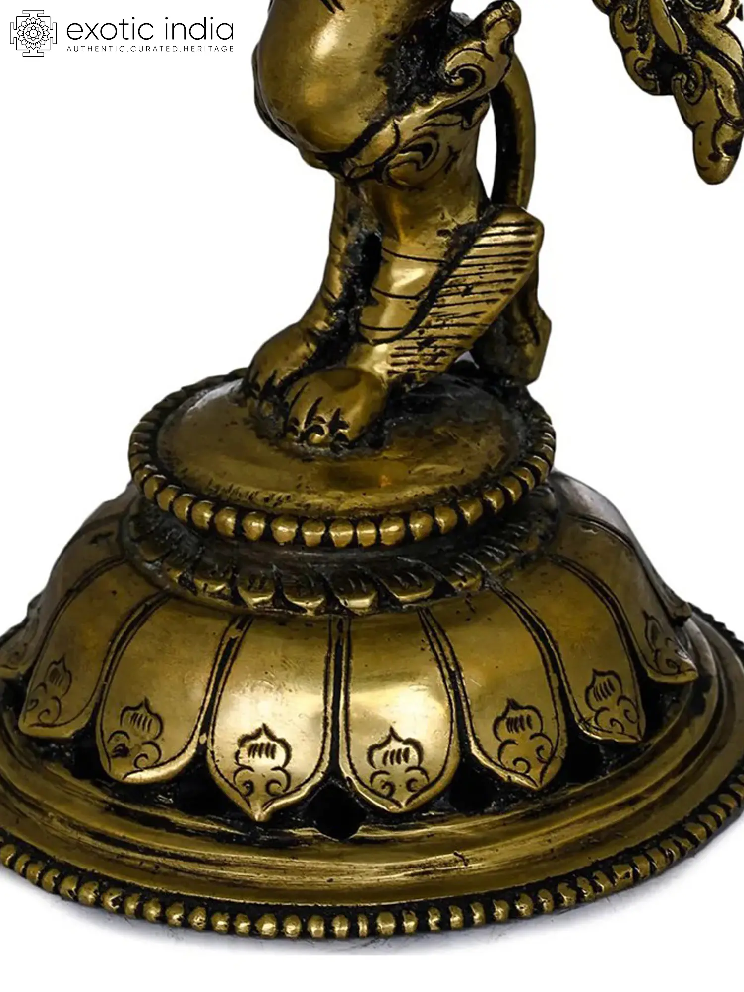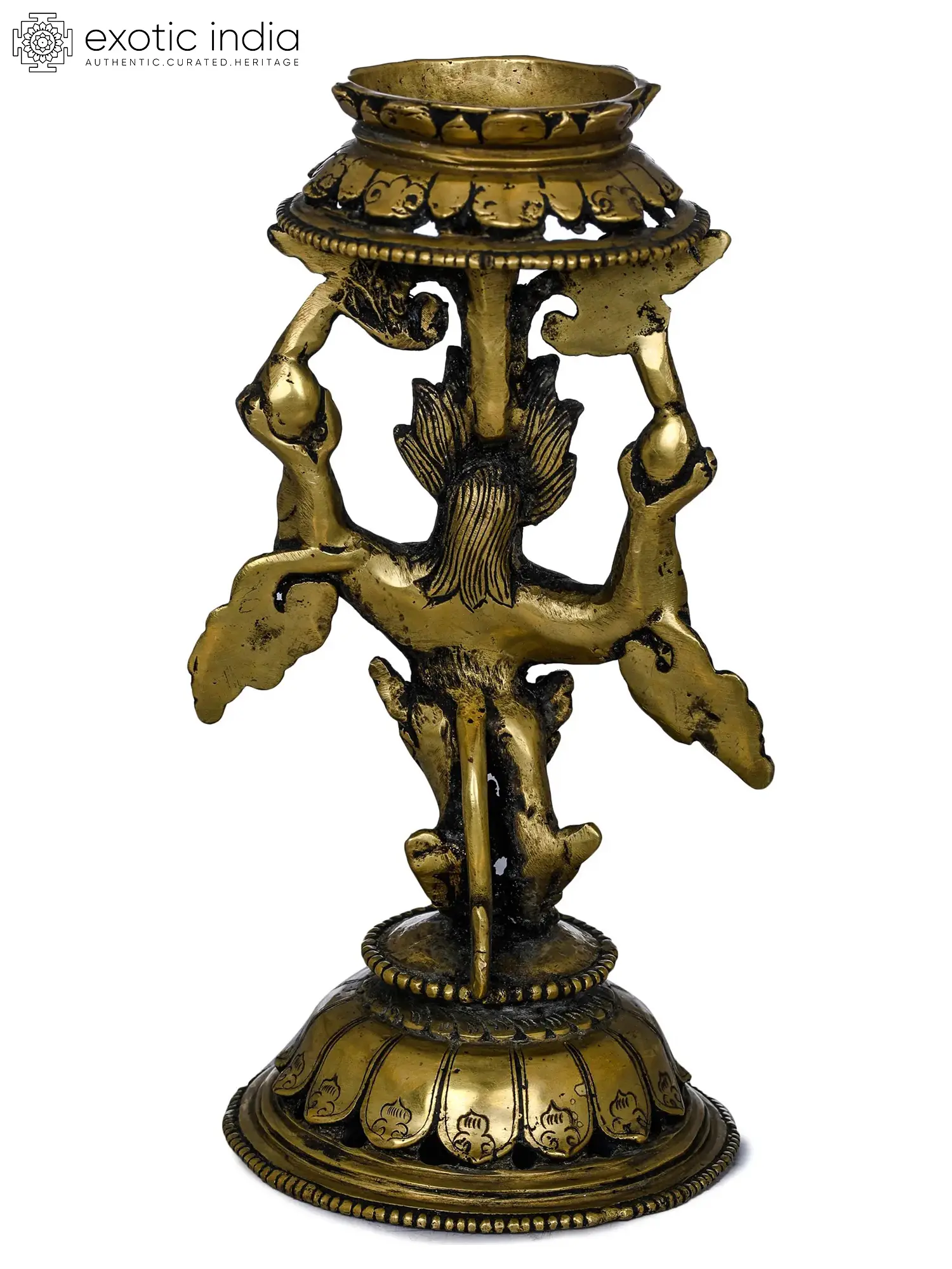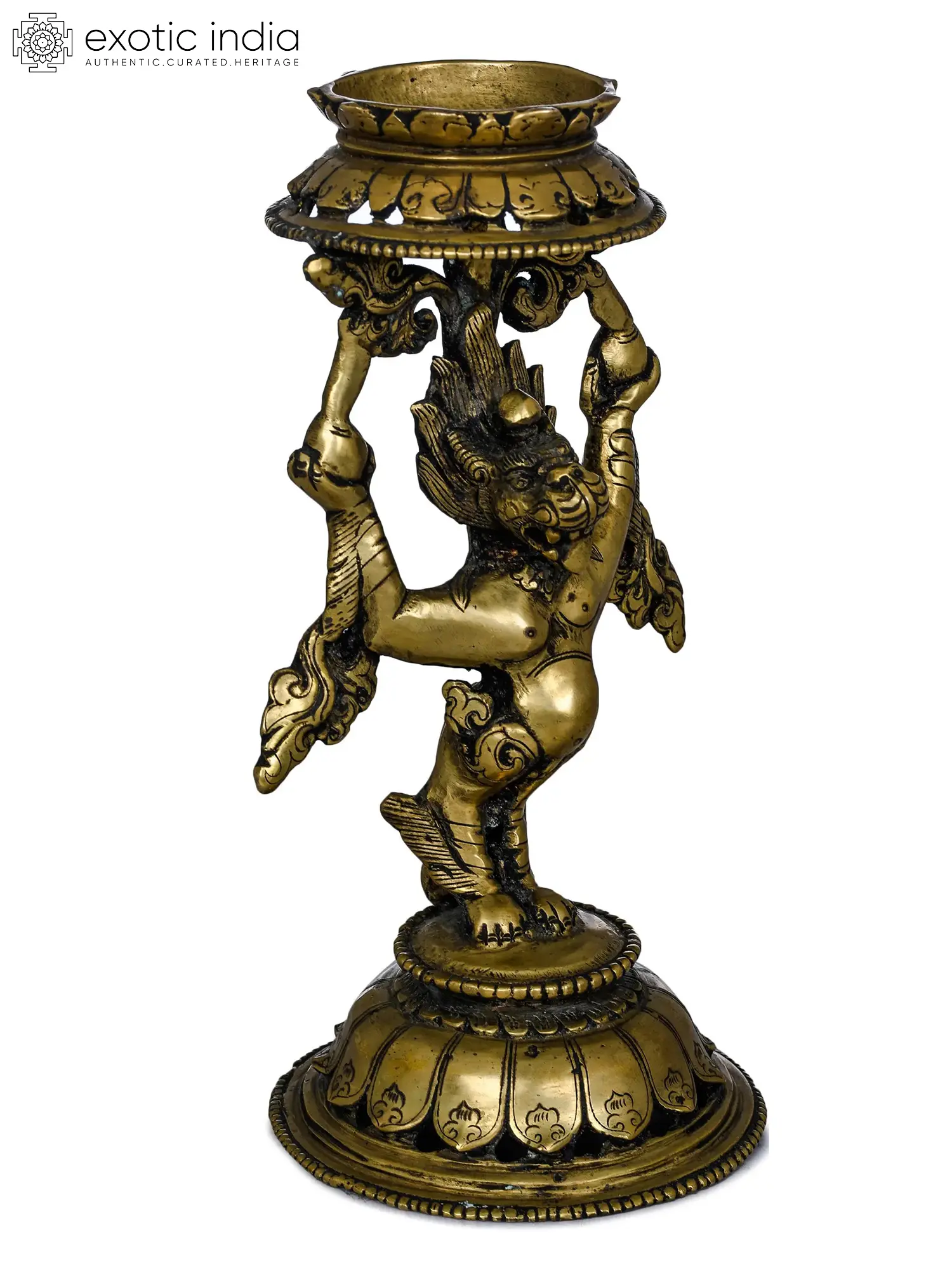 Tibetan Snow Lion Lamp in Buddhism, snow lions, or Seng, are considered as Buddha's protectors. They are shown in sculptures and art as supporting the thrones held by various Buddhist deities, which are said to symbolize the power and courage of Buddhas. In this brass lamp, used as a ritual item for Buddhist rituals, the Seng is pictured holding the lamp over his head and standing on an inverted lotus pedestal. The lamp holds ceremonial values and is carefully guarded so that it can be utilized during ceremonies. This lamp has the usual Nepali patina color with metal deposits at the curvatures, which are most likely the result of the brass metal interacting with the air. The lamp seems old and has a long life due to the use of high-quality metal.
