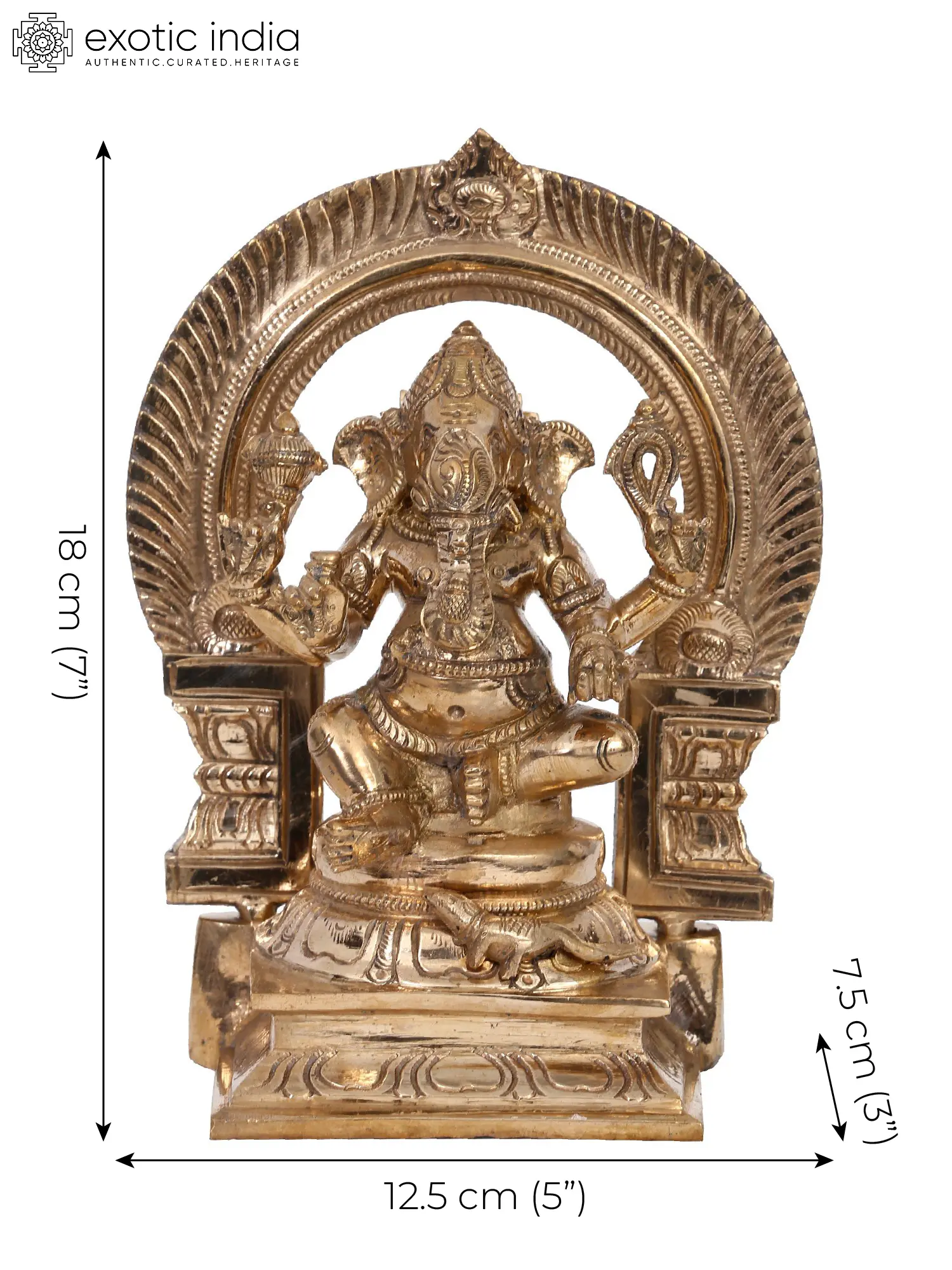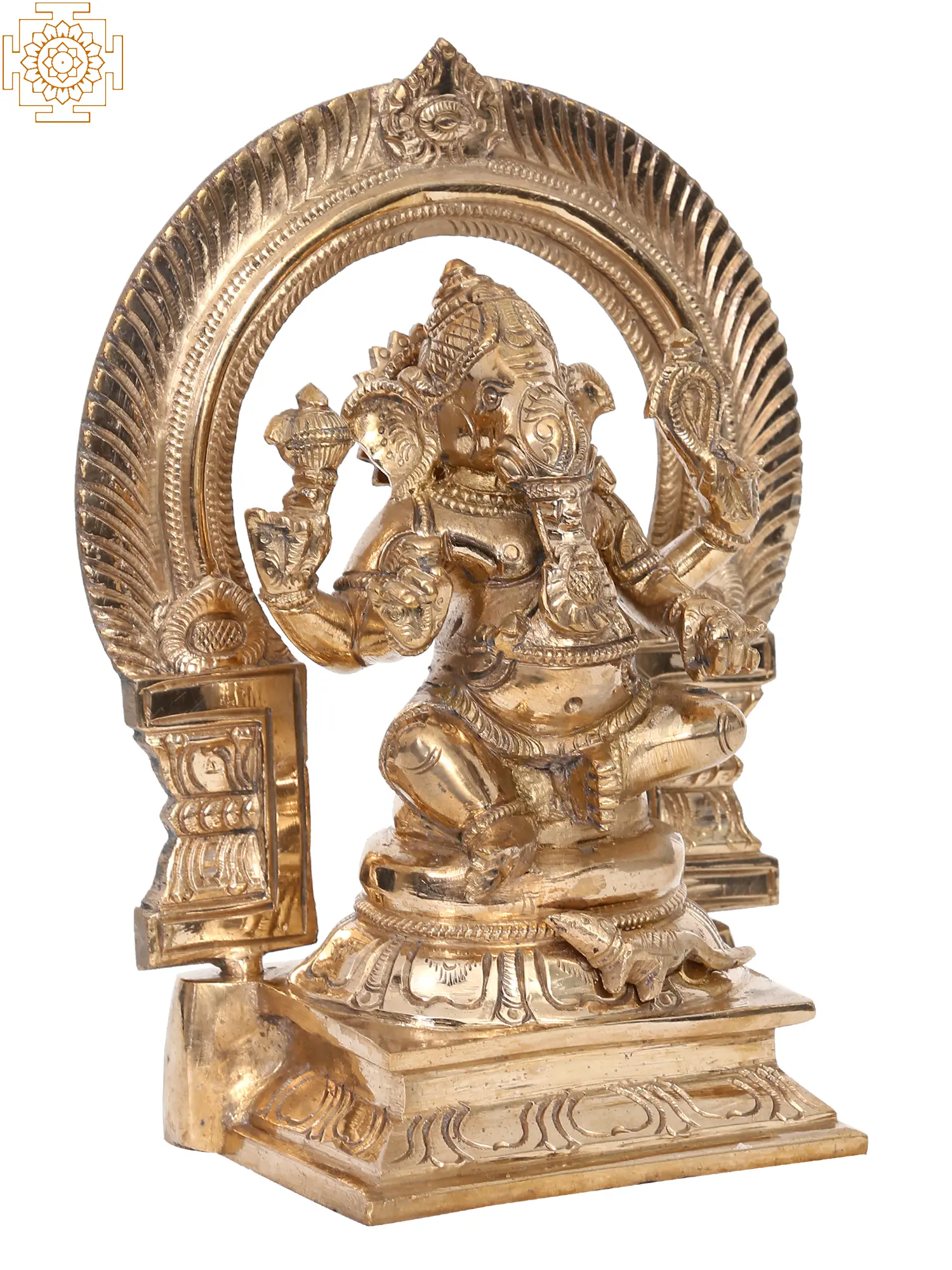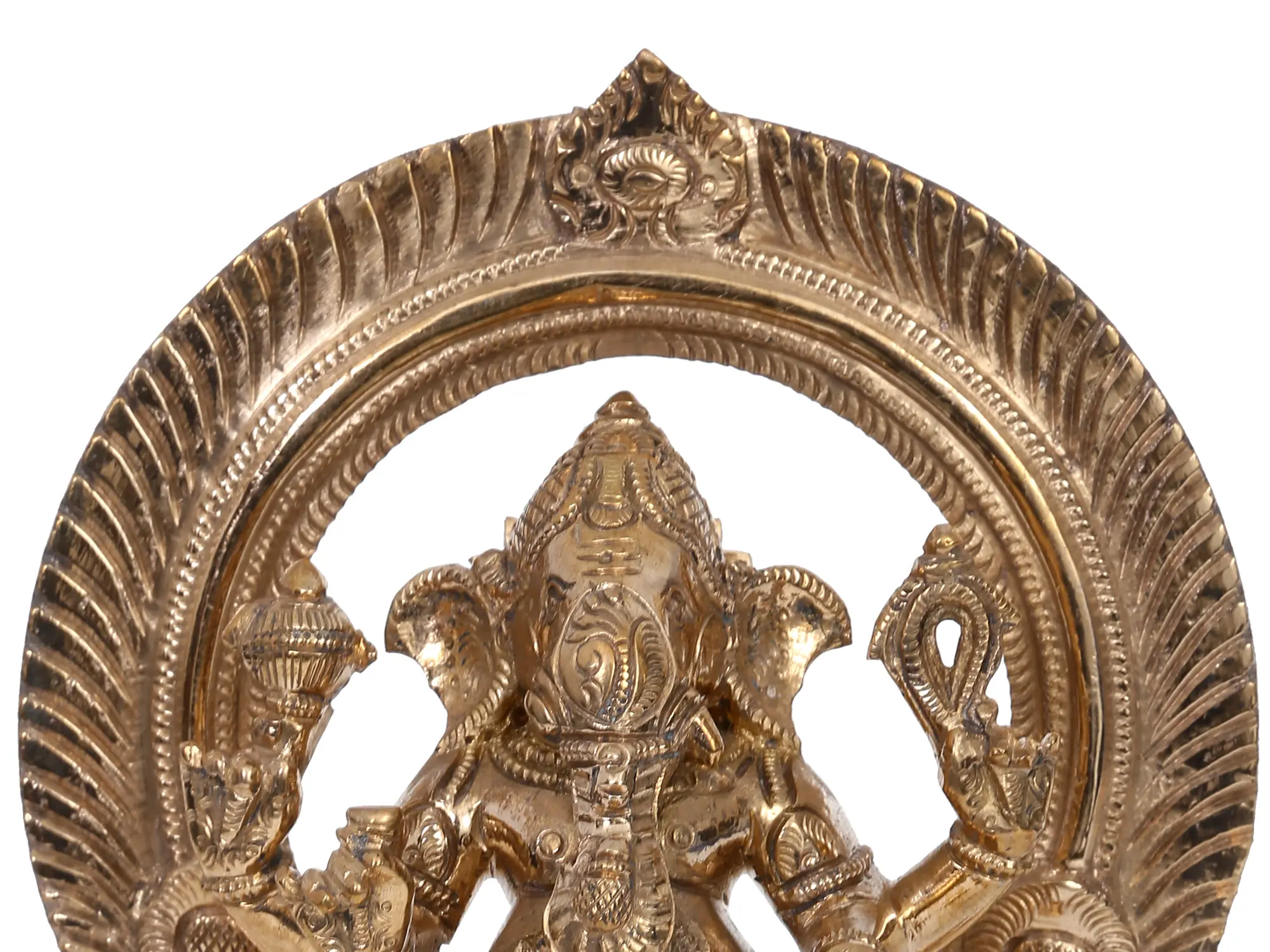 Lord Ganesha, “also known as Vinayaka”, seated upon the celestial Prabhavali Arch, emanates an aura of divine grace. In lalitasana posture, the harbinger of success exudes majesty, wielding a mighty goad and noose with celestial mastery. Amidst broken tusks and a sweet modak cradled in his lower hands, Ganpati stands as a symbol of life’s dualities. A coiled trunk delicately balances a Modak, a cosmic dance of equilibrium. With large ears attuned to cosmic whispers and a benevolent belly symbolising the cosmic womb, Ganpati, dons’ regal attire, a sovereign of prosperity. Crafted in bronze from Swamimalai using the ancient “Madhuchista Vidhana (Lost-Wax) technique”, this masterpiece signifies not just artistic finesse but encapsulates the cosmic dance of creation, an ode to the cosmic symphony conducted by Lord Ganesha.